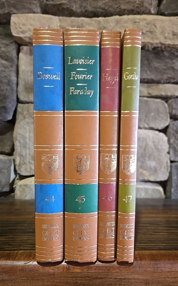 Great Books of the Western World Copyright 1952 Volumes 44, 45, 46, & 47 Encyclopedia Britannica Includes: Volume 44: Boswell Volume 45: Lavoisier, Fourier, Faraday Volume 46: Hegel Volume 47: Goethe Always check out photos for more info on details I AM NOT A PHOTOGRAPHER! Please check out my other sales. Most items I get came from yard sales, Goodwill/Thrift stores and Auctions. I try to list any flaws I see. I definitely am not perfect. If I miss anything of MAJOR proportions, I will definitely make it right. Please note, all of these items are used unless noted. I like to say · I know a lot about a little · I know a little about a lot · I know Everything about NOTHING!