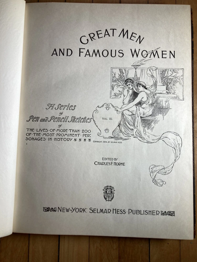 Great Men and Famous Women , Vol III, Statesmen and Sages 1894 Selmar Hess Publishers, very good Gorgeous leather bound book full of photogravure illustrations in excellent condition. There is some scuffing on the cover and binding is slightly loose - see photos - but otherwise intact and very good condition for age.
