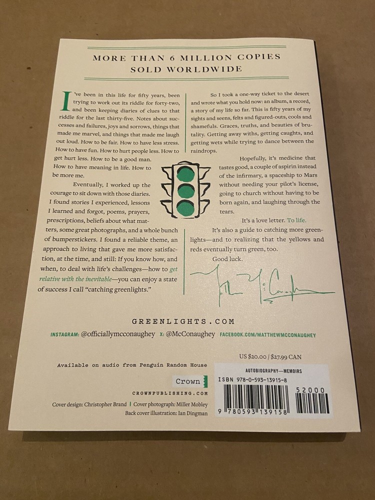 Greenlights by Matthew McConaughey Autograph Book Signed Autographed. Thank you for checking out this item from Autograph-Connection. A few key points for all our items. We never sell items that are preprinted, autopen, or any type of copies autograph, or personalized photos. Who wants a fake auto or a photo for aunt Betty? We package all our items so they arrive safely. All items are packaged the best way possible for protection. We try to get all items shipped by the next day. We strive to have the most competitive prices and will also combine shipping. If you have any questions let us know, and feel free to make an offer on any of our items.