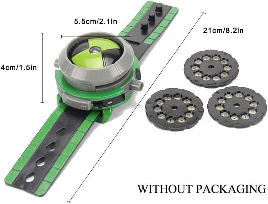 Grostmend Ben 10 Watch Toys Ben 10 Omnitrix Watch for Kids Ben Ten Ultimate Alien Projector Watch Games Action Figure Birthday Gifts Product Details Product Dimensions: 8 x 2 x 1.5 inches Item Weight: 3.17 ounces Item model number: Grostmend_Ben10 Manufacturer recommended age: 12 years and up Batteries: 3 LR44 batteries required. (included) Department: boys Manufacturer: Grostmend Easy to play, just insert the card and press the side button, a cool cartoon hero will appear. Made by high quality material,adjustable watch-band and comfortable to wear. Can rotate the card to select your favorite cartoon characters,can rotate the frame to select different colors of light. Great gifts in birthday,Christmas Party. Package includes 3 cards and 10 images on each card. Ben is new Omnitrix may look like just a cool watch,but this device from another galaxy takes his adventures to a whole new level!That is because the Omnitrix has the power to transform him into 10 different alien heroes,each with their own special dials in the alien he needs to get the job done and slams down on the Omnitrix to activate Ben activates the Omnitrix,it's hero time! How to use:Insert the card,press the next button to exit the image on the the adjustable their favorite cartoon characters,will never be bored,children is favorite.Rotate the projectors`s top to change the light color to White/yellow/green.Rotate the disk to change the main images. 3 cards, each having 10 images. Projection effects, the darker the better light. Specification:Product name:Ben 10 Kids Projector Watch toy.Material:ABS plastic and electronic component.Watch size:21*5.5*4cmBatteries:3*LR44 (included).Package Size:26x12x5cm.Weight: About 100gm Revised on 6/30.2024