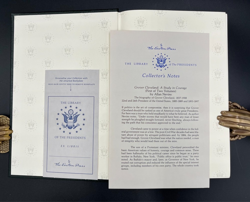 Books From The Hill Country presents ... Grover Cleveland: A Study in Courage. Volumes I and II. Library of the Presidents Series in Full Leather Author: Nevins, Allan Publisher: The Easton Press Release Date: 1987 Seller Category: -- Qty Available: 1 Condition: Used: Very Good Sku: 250301002 Notes: Two volume set complete. Easton Press leather bound editions from the Library of Presidents Series. No marks and no writings. Includes both Collector's Notes and two unused bookplates which have not been applied to the books. Built-in satin bookmarks. Don't forget to check out other great deals in our eBay Store!!