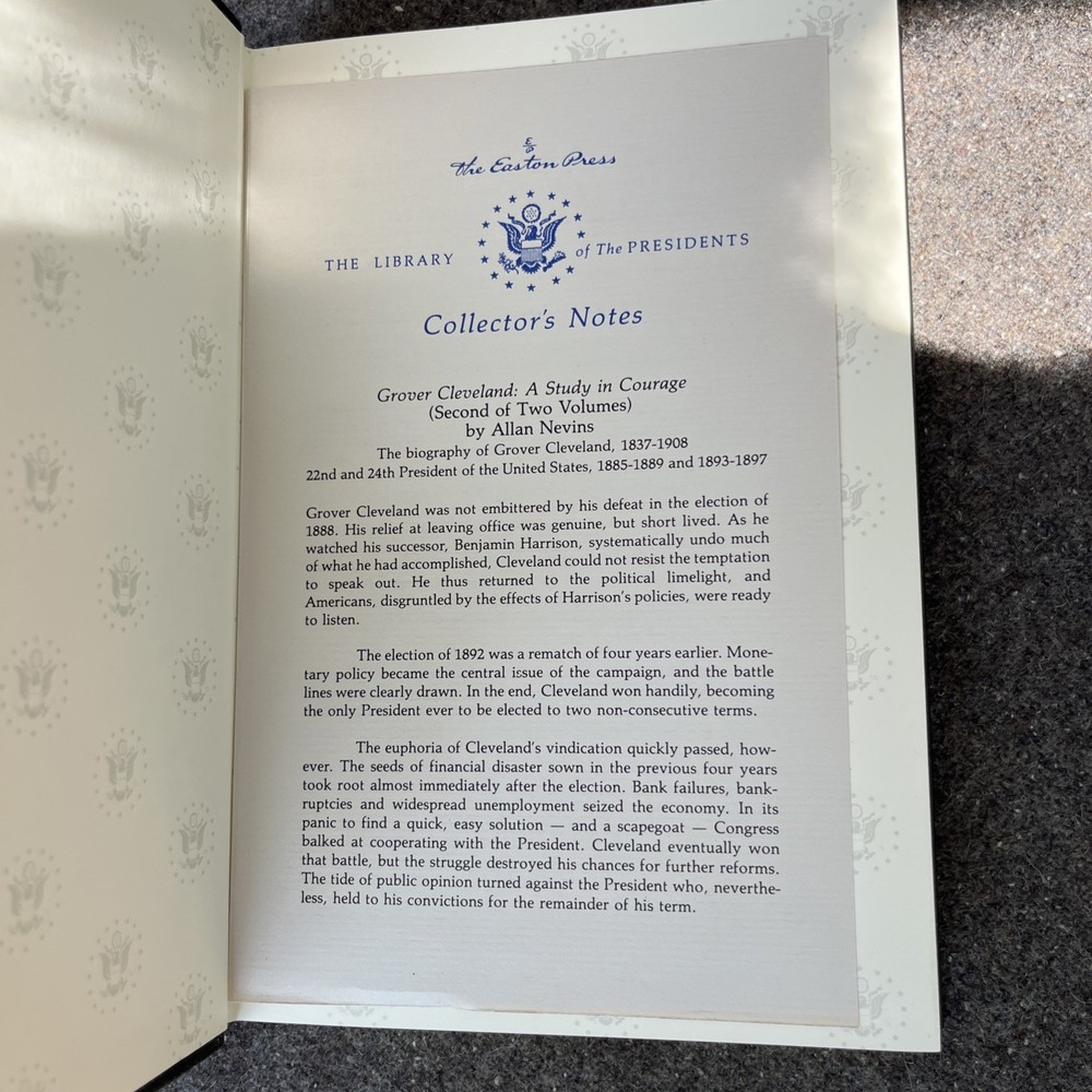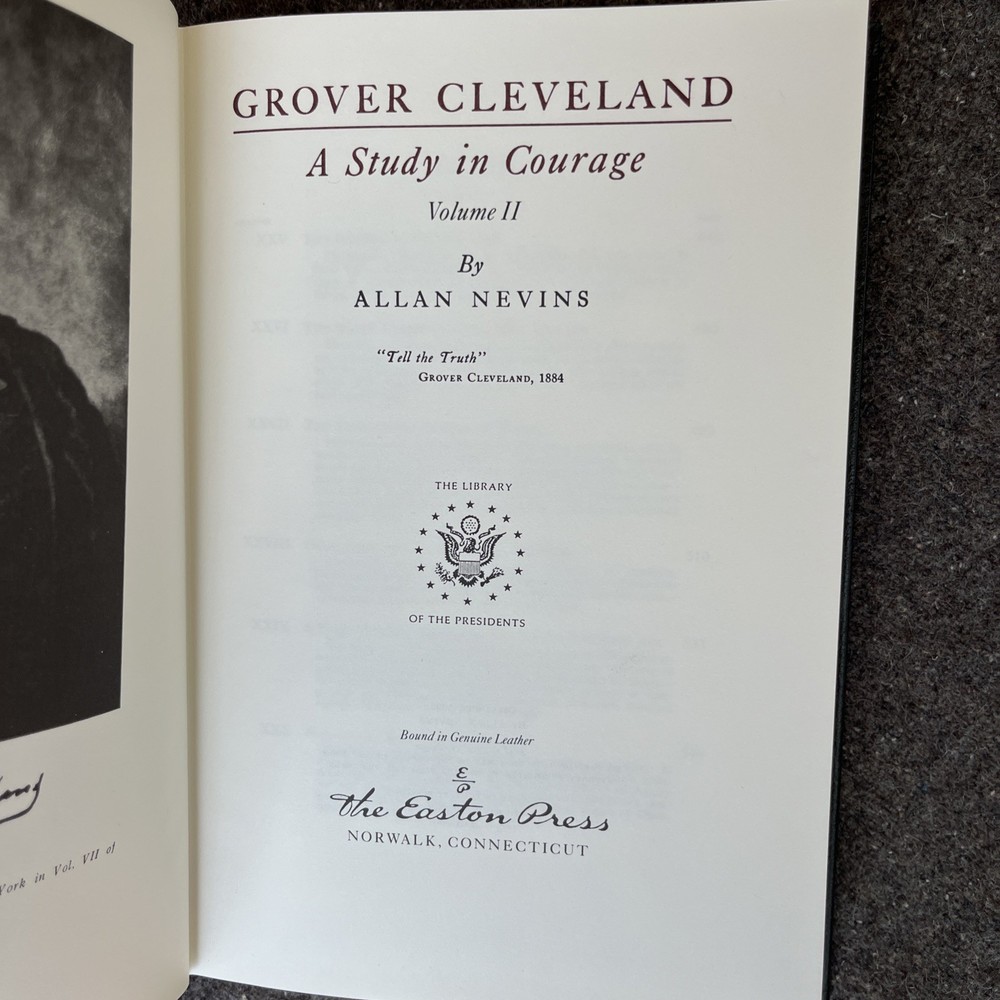 Grover Cleveland - A Study in Courage Volume II/2 by Allan Nevins is a collector's edition biography published by Easton Press in Connecticut. The book, focusing on the history and life of Grover Cleveland, is written in English and features a leather binding. This limited edition volume is a valuable addition to any collection, showcasing the author's deep research and insight into the subject's life and impact in North American history.