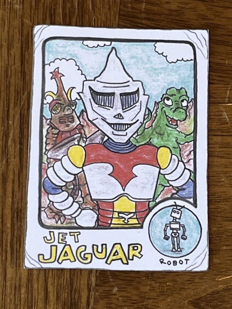 This trading card is a must-have for any Godzilla fan! The retro Topps-style design looks amazing, and the vibrant colors really make Jet Jaguar pop. The quality is top-notch, with a nice glossy finish that feels great in hand. It’s a fun throwback to classic trading cards while still feeling fresh. Perfect for collectors or just fans of cool artwork!