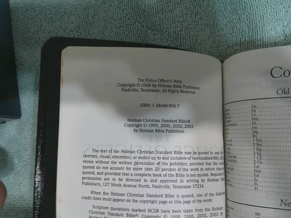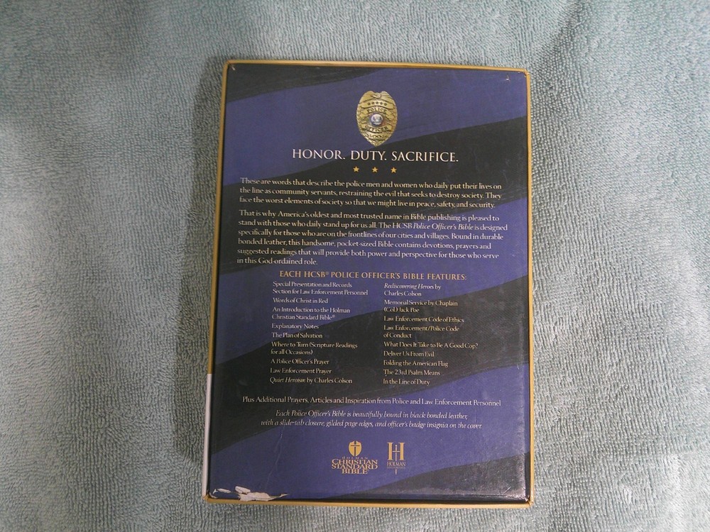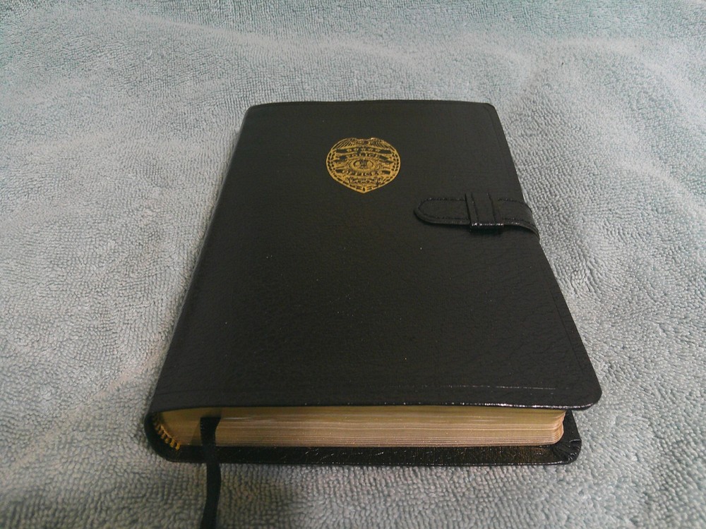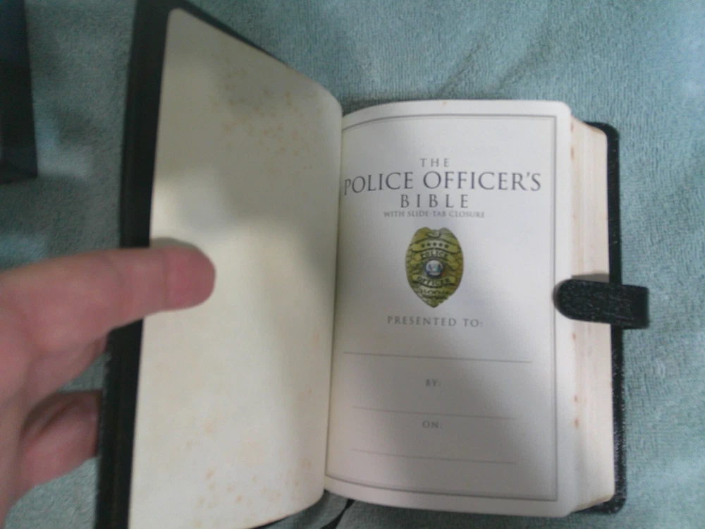 This black bonded leather Bible is a must-have for any police officer. The HCSB Police Officer's Bible 2004 features a slide closure and is a revised edition. With 1168 pages, this Bible is perfect for young adults and adults who are looking for a reliable and durable Bible. The Bible is in English and was published in 2004 by B&H. This Bible is part of the Collection book series and is a nonfiction narrative type. The author is Holman Bible Staff and the illustrator is Holman. The Bible weighs 15.4 Oz and measures 7.4 in length, 5.3 in width, and 1.2 in height. This Bible is perfect for anyone who is looking for a Christian Standard Bible with a police logo. ~ VG/EX Condition ~ Fast Shipping ~ Thanks for Looking.