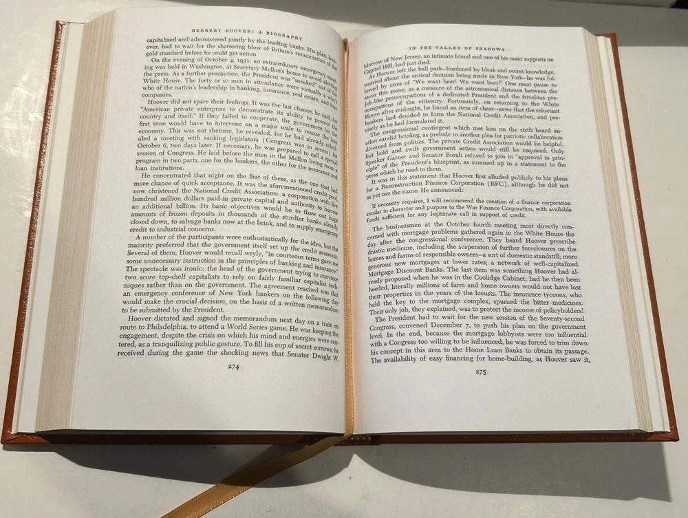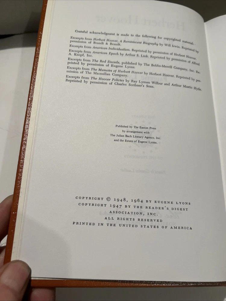 HERBERT HOOVER A BIOGRAPHY - By EUGENE LYONS - Part of the Easton Press Library of the Presidents. Originally published/copyright 1964. Easton Press books are printed on archival quality acid-neutral paper and bound with premium genuine leather in the U.S.A. This book has gilt design and 22k gold accents on the hubbed spines. Check out my store for my other of Easton Press Presidential Library listings. ITEM CONDITION NOTES: Excellent/Very Fine condition. Pristine Leather cover, bright gold edges, tight/square binding and intact gold silk ribbon page marker. PLEASE SEE ALL PHOTOS BEFORE BUYING. Calculated Shipping via USPS Media Mail or Carrier of Buyer's Choice (UPS Ground, FEDEX Ground or Home Delivery, USPS Priority Mail).