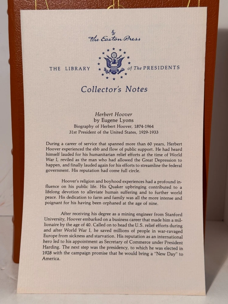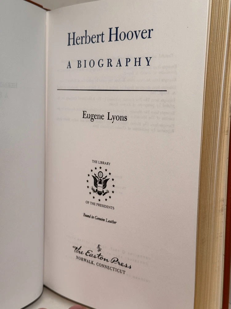 You are bidding on a very fine copy of a 1st Edition, 1st Printing of the Easton Press' THE LIBRARY OF THE PRESIDENTS series edition of Eugene Lyons's HERBERT HOOVER - A BIOGRAPHY. This is a one-volume edition about the life and work of President Herbert Hoover. Bound in beautiful genuine moroccan cowhide leather, the book features raised bars on the spine, gold tooling on the cover and spine, End-pages decorated with the seals of the U.S. Presidents, satin silk sewn-in bookmark, 22k gold dust on page ends on all 3 sides. Printed on archival quality acid-neutral paper, that will last for generations without diminishing in quality or looks. INCLUDES ORIGINAL, LIBRARY OF THE PRESIDENTS INSERT. LIMITED, COLLECTOR'S EDITION FROM THE SERIES OF THE LIBRARY OF THE PRESIDENTS. Free Shipping in all of Continental United States. All other buyers, please check with me for shipping rates before bidding. ***NOTE: If you are dissatisfied with your purchase for any reason, please contact me first directly, and I will do all in my power to make sure you are satisfied with your purchase. *** See my other listings. I have a large collection of rare and collectible books, most leatherbound, others of first edition, first printing, even unpublished manuscripts. I will combine them during shipping so you can receive them together. Just message me your intent to buy more than one book, and I will hold them to be shipped together. Abell Happy Buying!