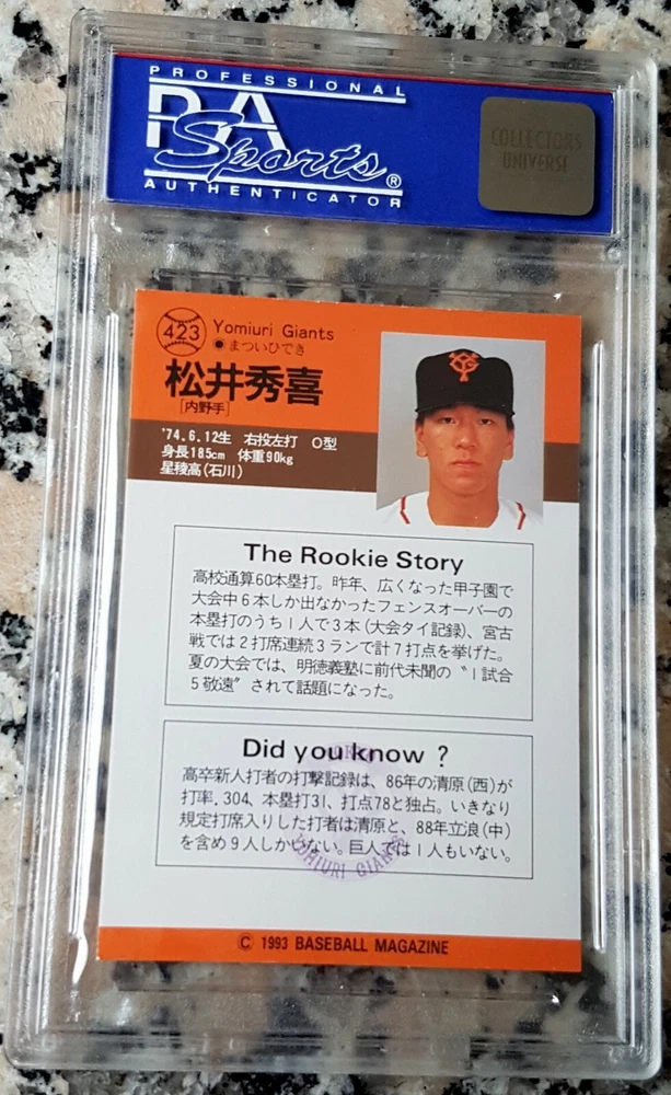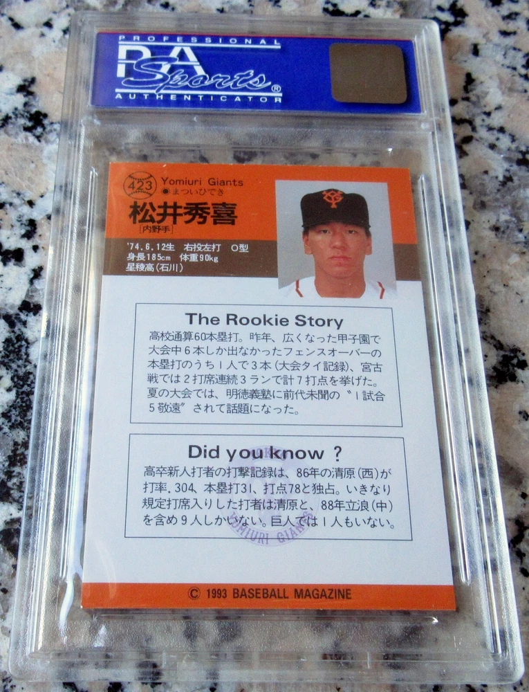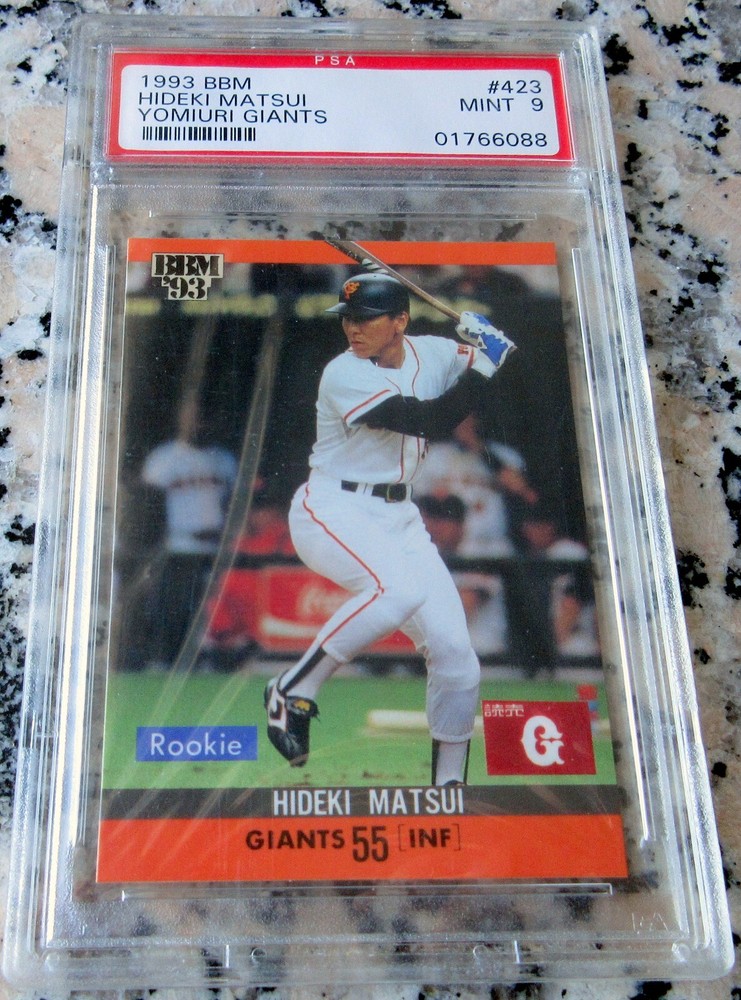 b 1993 BBM Yomiuri Giants ROOKIE CARD RC Card #423 HIDEKI MATSUI "Godzilla" former Superstar Outfielder for the NEW YORK YANKEES Career Stats in Japan: .304 Batting Average / 332 Home Runs / 889 RBIs Career Stats in the United States: .282 Batting Average / 175 Home Runs / 760 RBIs Japan Baseball Career Highlights and Awards: 9× All-Star (1994–2002) 3× Japan Series champion (1994, 2000, 2002) 3× CL MVP (1996, 2000, 2002) Japan Series MVP (2000) 8× Best Nine Award (1995–2002) Matsutaro Shoriki Award (2000) MLB Career Highlights and Awards: 2× All-Star (2003, 2004) World Series champion (2009) World Series MVP (2009) Inducted into the Japanese Baseball Hall Of Fame in 2018 Graded by PSA 9 MINT with NO Qualifiers Early PSA Grade Low Serial Number Starts with "0" Serial Number: 01766088 A must own for Hideki Matsui and New York Yankees fans! INVEST !! $$ Buy with Confidence! We SHIP FAST with Delivery Confirmation Tracking Number.