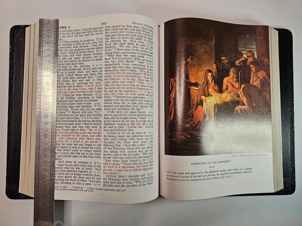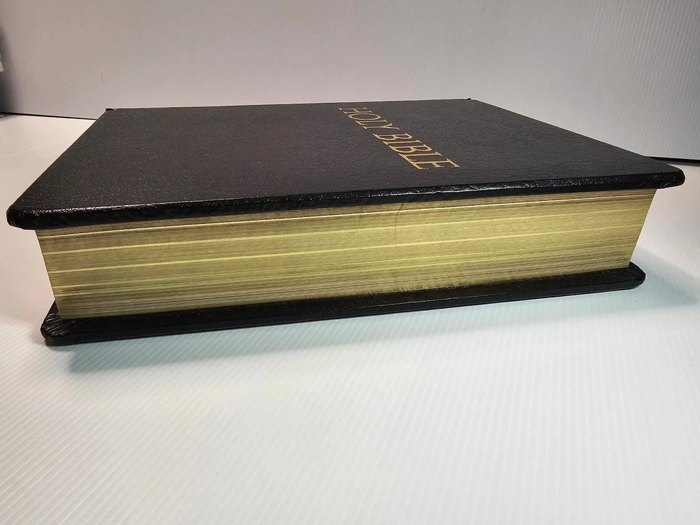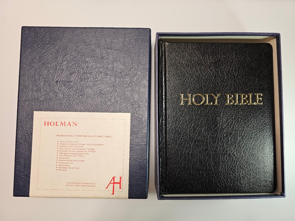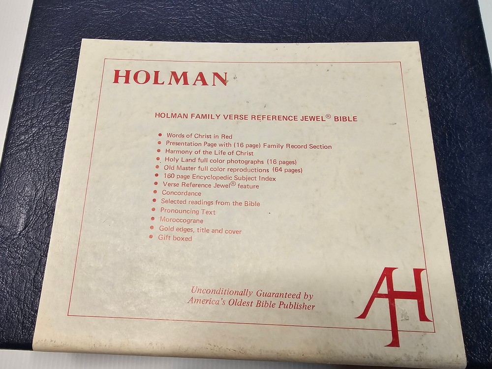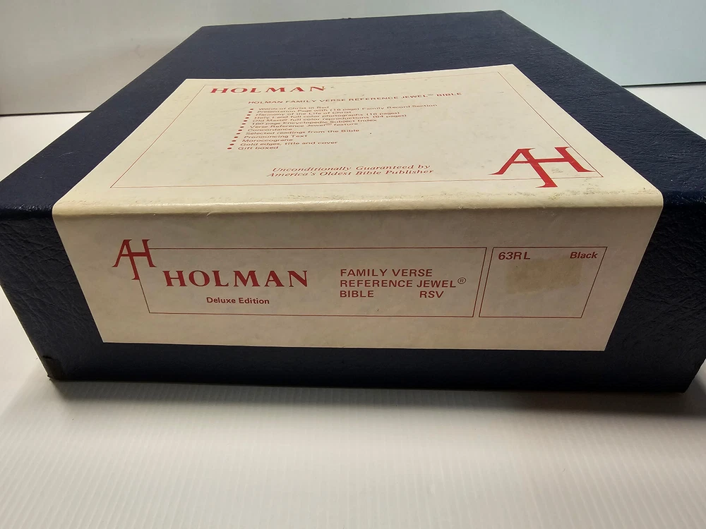 HOLMAN Family Verse Reference Jewel Bible Deluxe Edition 63RL Leather Bound Words of Christ in Red Large Print Concordance Pronouncing Text Gold Edges, Title, and Cover Refer to photos. Leather bound. Some minor scuffs on Gold-Edged pages. In excellent condition for it's age and has clearly been kept in box all it's life. Some of the Children's Birth section has been filled out. English Express Postage is available and can be selected when you checkout your items.