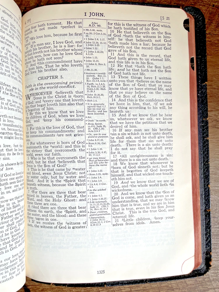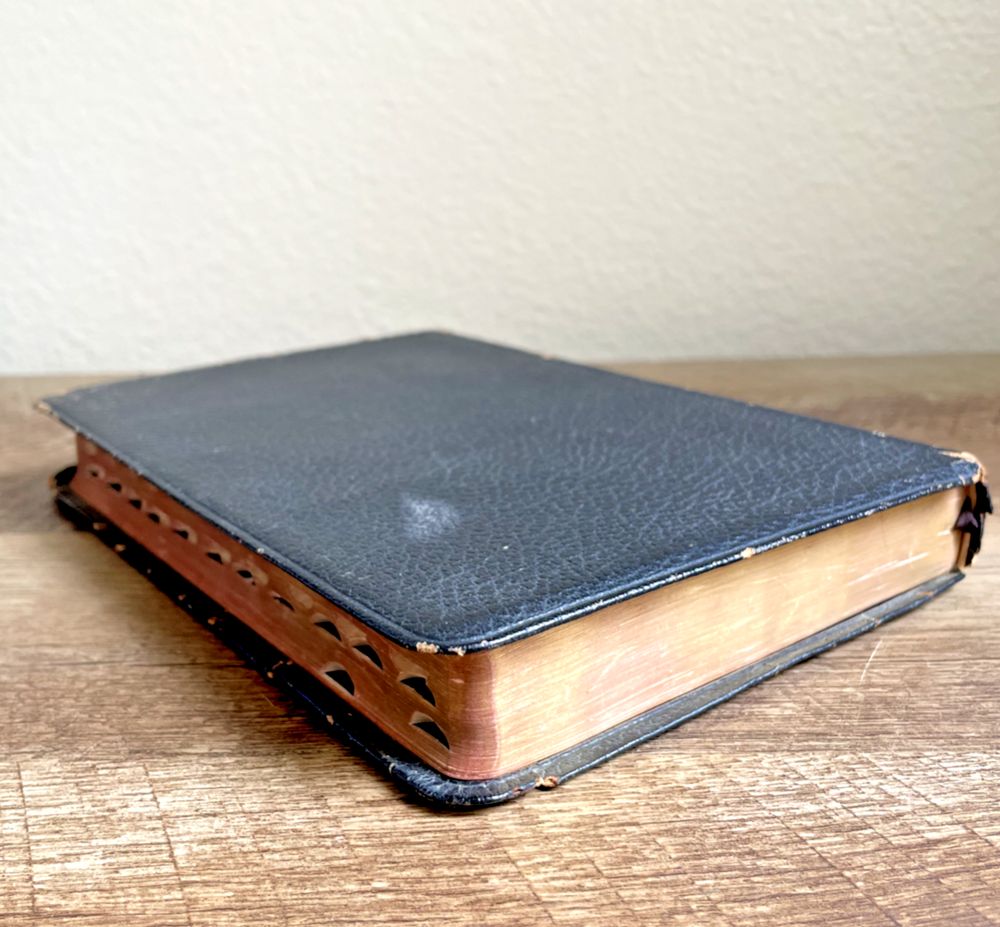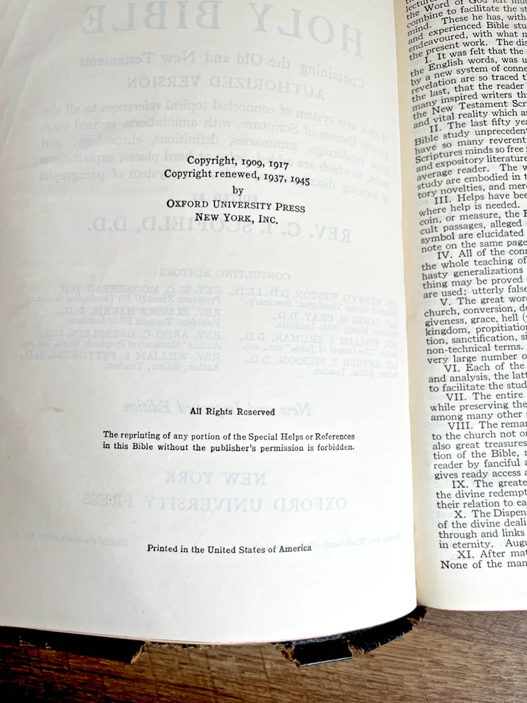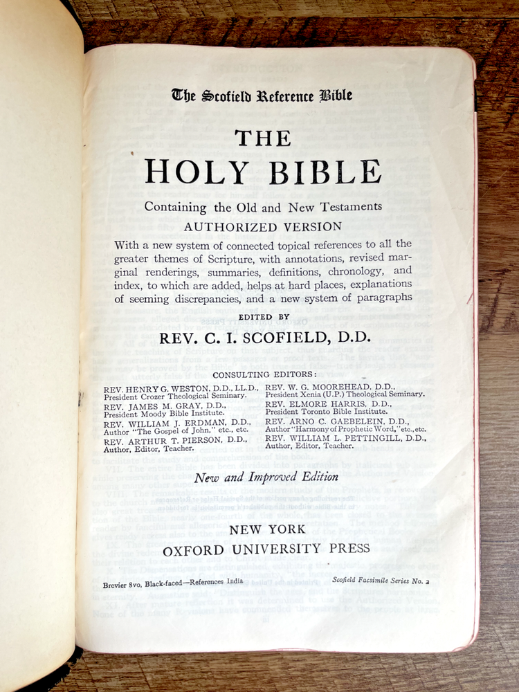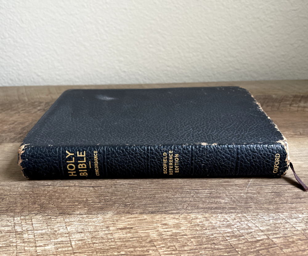 Holy Bible: Scofield Reference Edition (King James Version) 1945, Oxford University Press, Leather-Bound with Thumb Index Tabs This 1945 edition of the Scofield Reference Bible by Oxford University Press presents the Authorized King James Version, enhanced with C.I. Scofield’s renowned study notes and cross-references. Bound in genuine leather, it features thumb-indexed tabs for easy navigation, gilt-edged pages, and a concordance section, making it both a functional study tool and a collector’s item. A great addition for collectors of vintage Bibles, theologians, or anyone interested in classic study editions of the King James Version. Leather-bound hardcover in good vintage condition, with shelf wear and clean, unmarked pages. Binding remains strong. Please see photos for visual inspection.