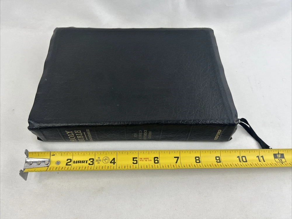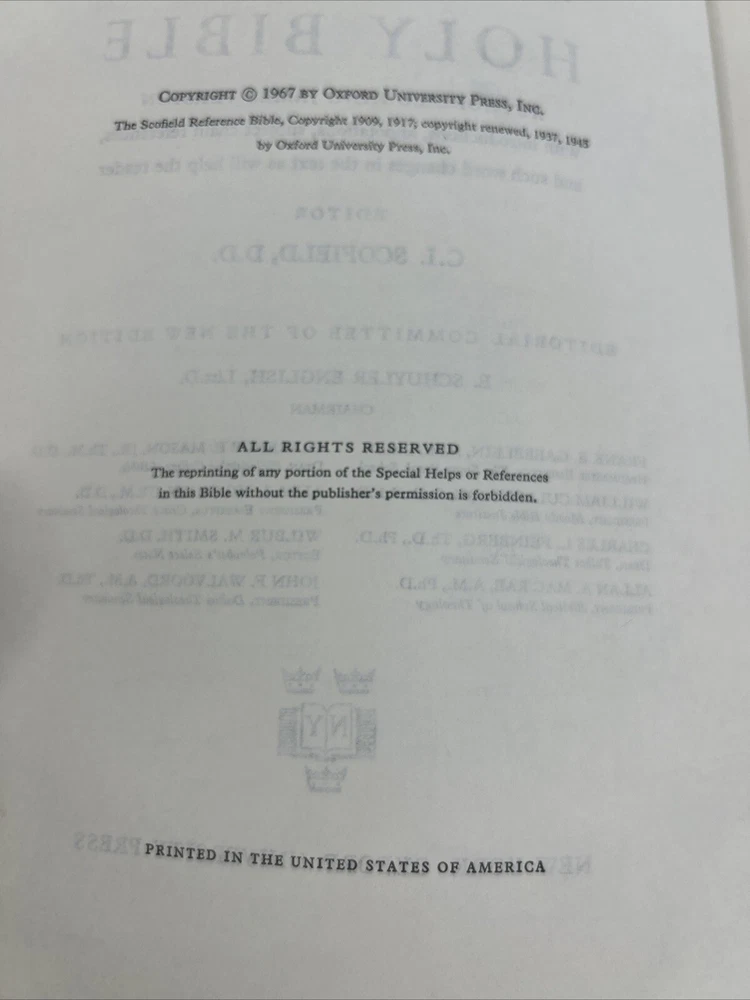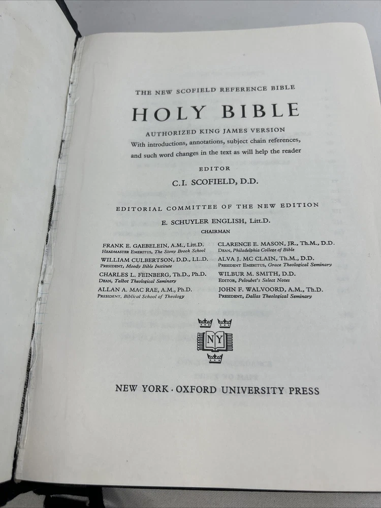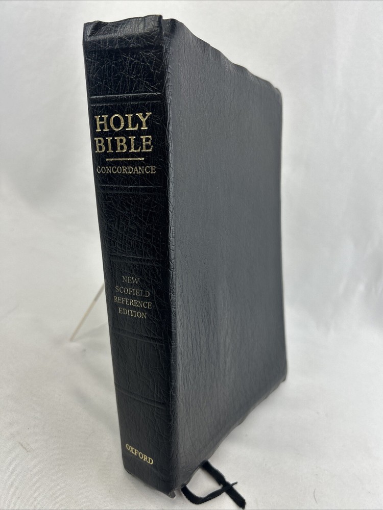 HOLY BIBLE Concordance KJV NEW SCOFIELD REFERENCE EDITION Oxford 1967 Genuine Leather Bible is in good used condition. Shows little spine and cover wear. There is some notes written in the bible - see pics. Inside front and back cover has some black tape on it - see pics. Please see all pictures to determine condition.