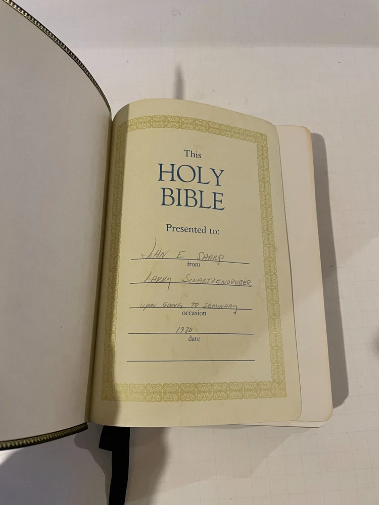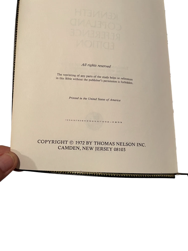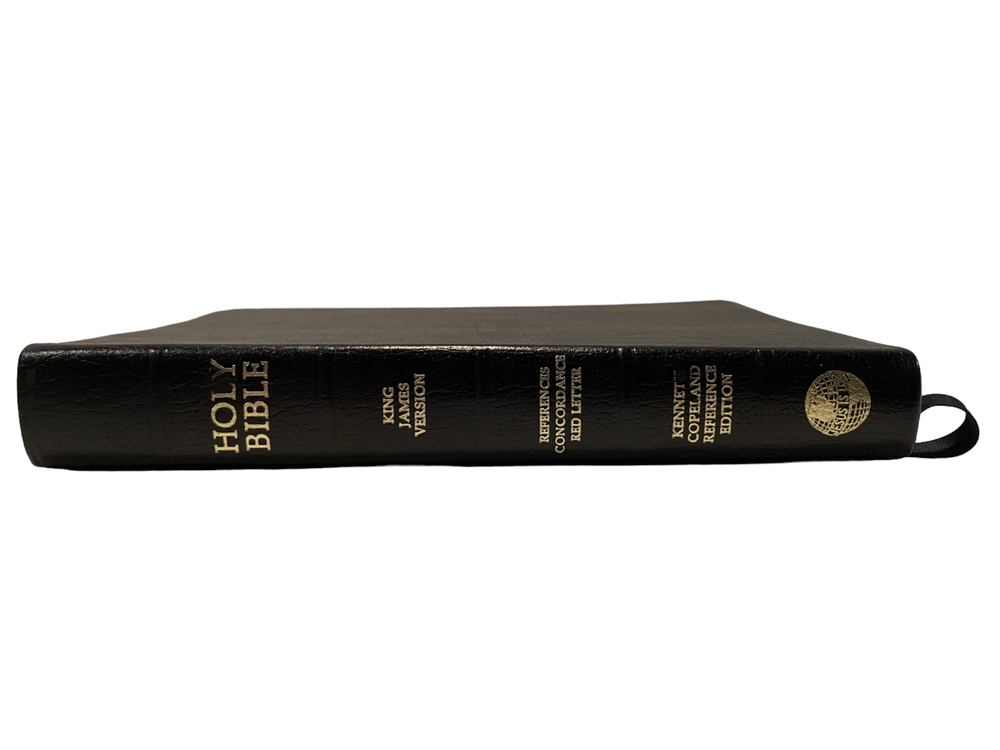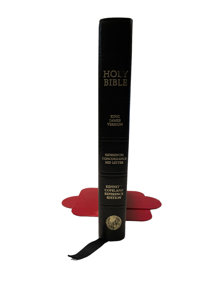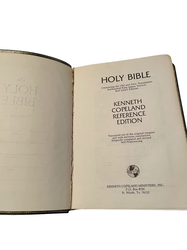 This is a KJV Kenneth Copeland Reference Edition Genuine Leather Red Letter HOLY BIBLE The first two pages are loose from the binding and there are minor scuffs on the leather cover. The presentation page is filled out. Otherwise, this is in very good condition.