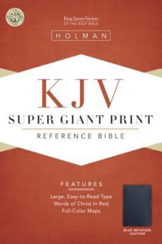 | Synopsis | This full reference Bible includes our largest print with 18 point type that's ideal for anyone looking for a very easy-to-read Bible and as a part of the Holman Bible Program you'll enjoy exploring our bestselling designs and colors. It comes well equipped with many helpful features including the King James Version., An ideal selection for pulpit use or for the vision impaired, the KJV Super Giant Print Reference Bible includes 18-point type that's twice as large as most standard Bibles. Among the other features are a four-color presentation page section (Presented to; Certificate of Marriage; Births; Marriages; Occasions to Remember; Deaths), eight four-color maps, topical concordance, two-column text setting, and the words of Christ highlighted in red type. |