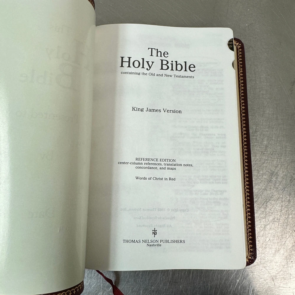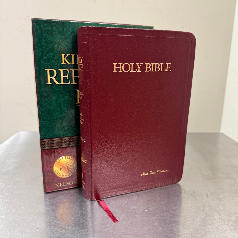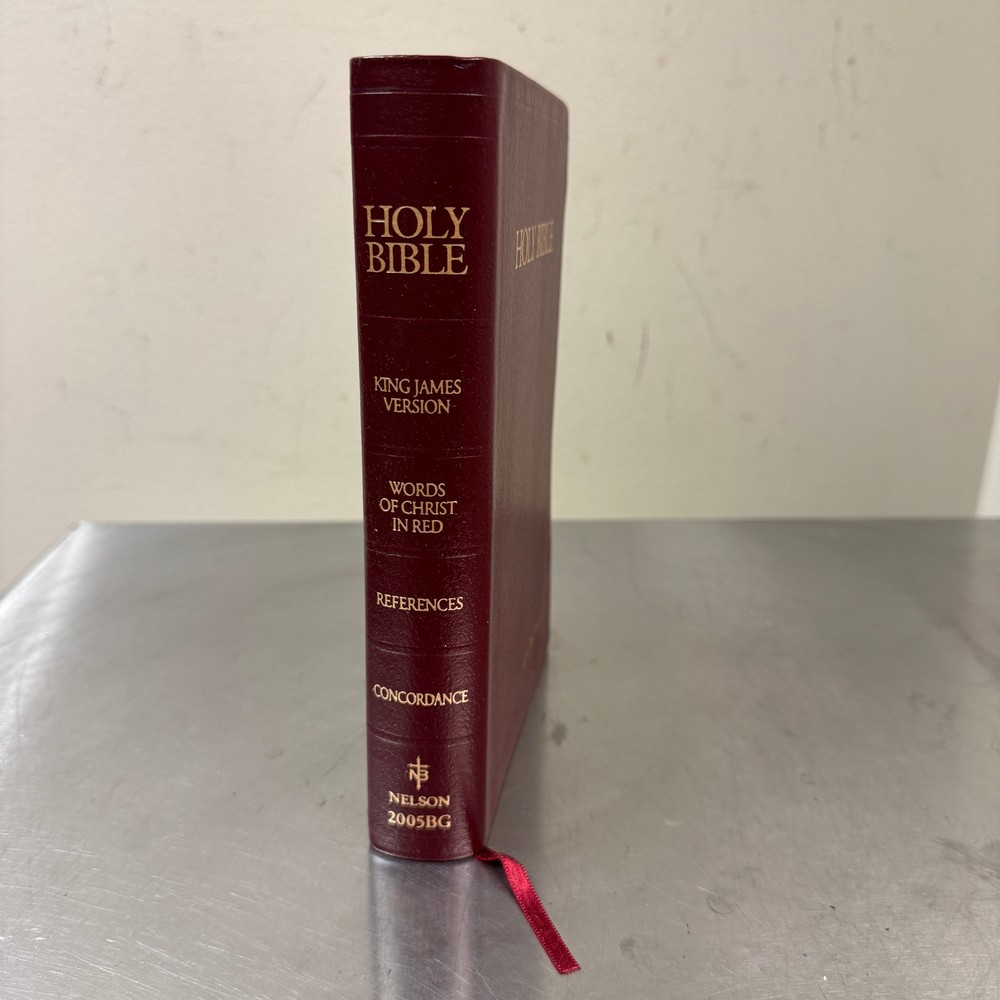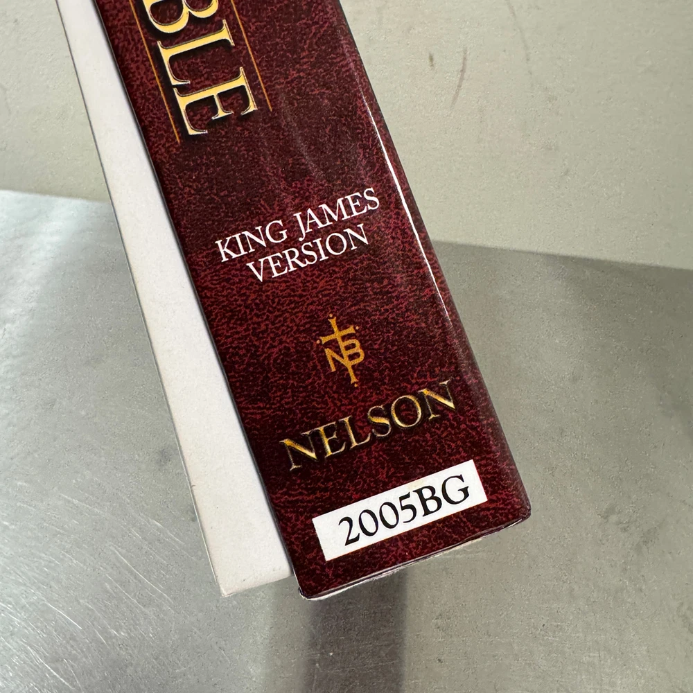 HOLY BIBLE King James Version Burgundy Bonded Leather Reference NELSON 2005BG HOLY BIBLE King James Version Burgundy Bonded Leather Reference NELSON 2005BG Title: HOLY BIBLE King James Version Burgundy Bonded Leather Reference NELSON 2005BG Publisher: Thomas Nelson Condition Notes: Some light wear. Previous owner's name written on the presentation page. Previous owner's name stamped on the cover. Listing and template services provided by inkFrog