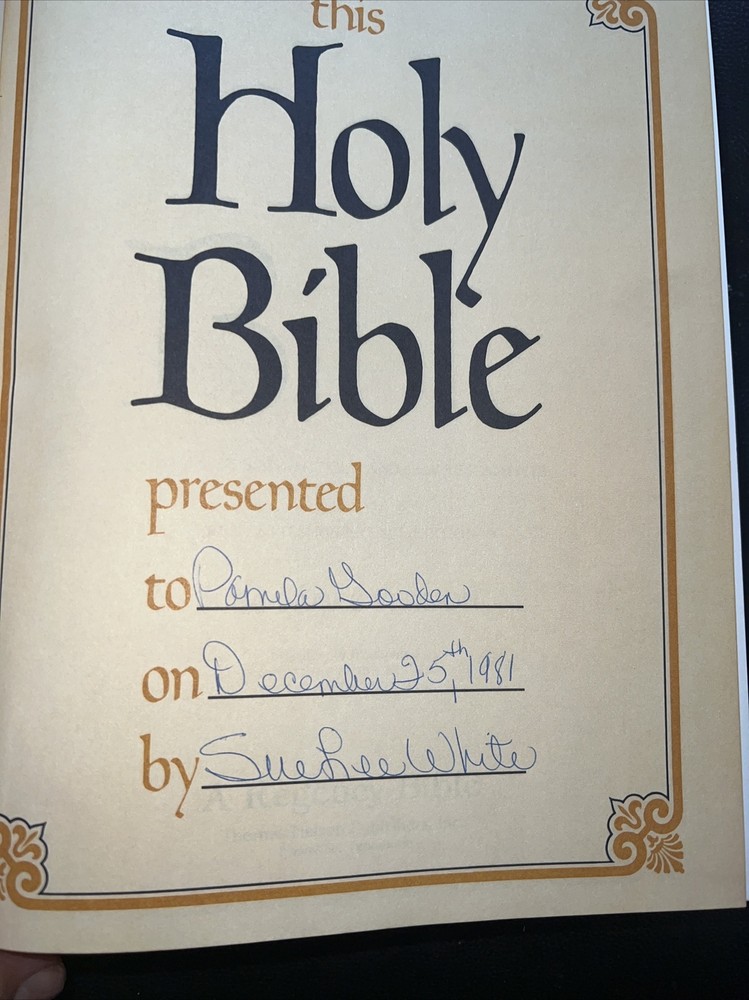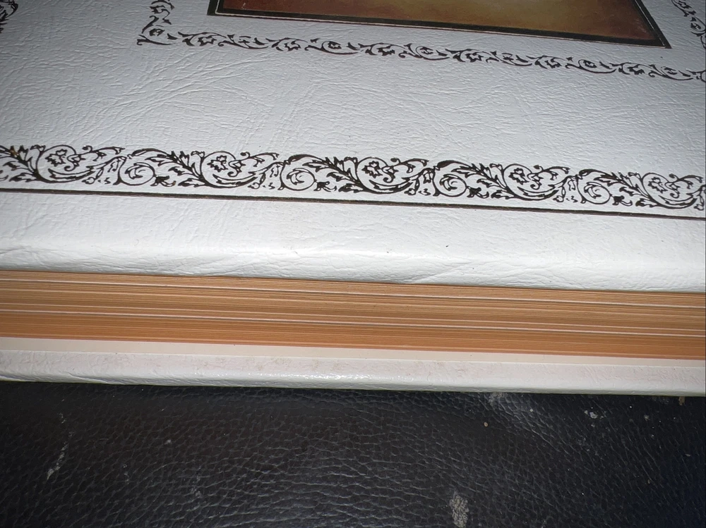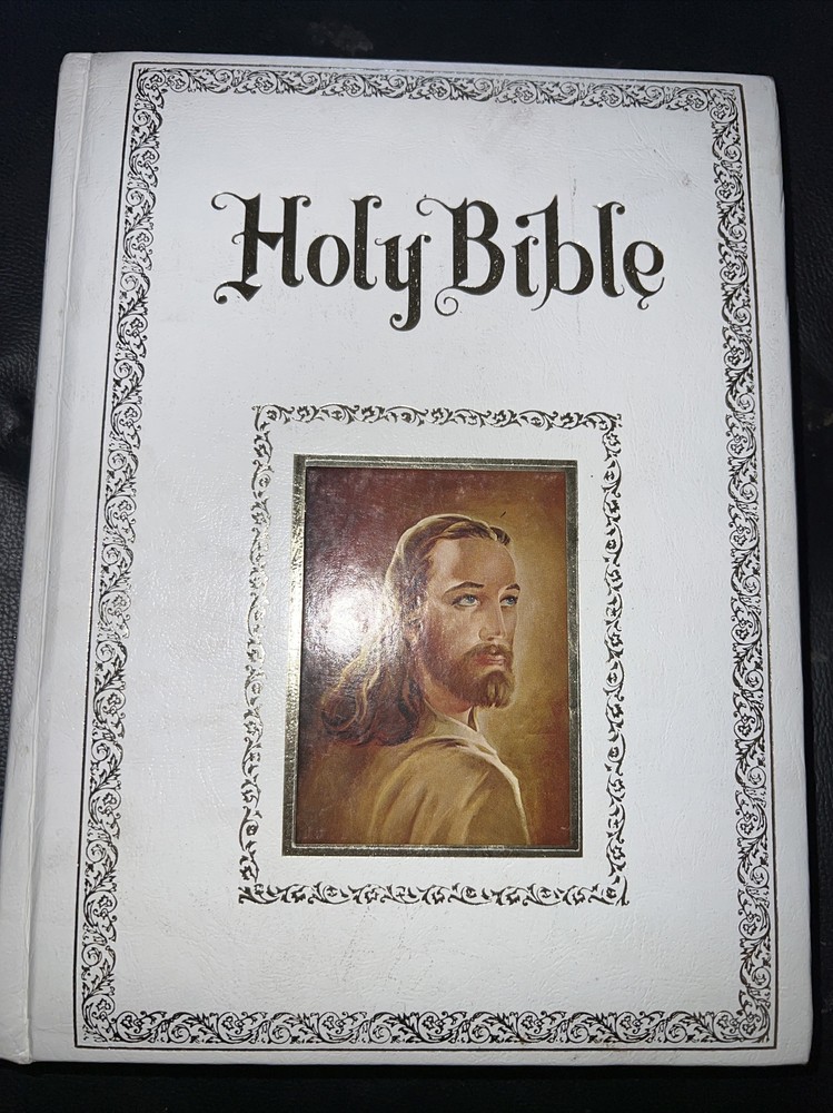 This vintage Holy Bible, published by Regency in 1978, features large print and illustrations. The faux leather bound hardcover is padded for added comfort during use. Measuring 11.5 inches in length and 8.5 inches in width, this nonfiction narrative type prayerbook is intended for both young adults and adults interested in religion and spirituality. The King James Version of the Holy Bible includes special attributes such as an unabridged text, making it an excellent addition to any religious or spiritual book collection. This book series is part of the historical genre and does not contain any Ex Libris inscriptions or personalized signatures.