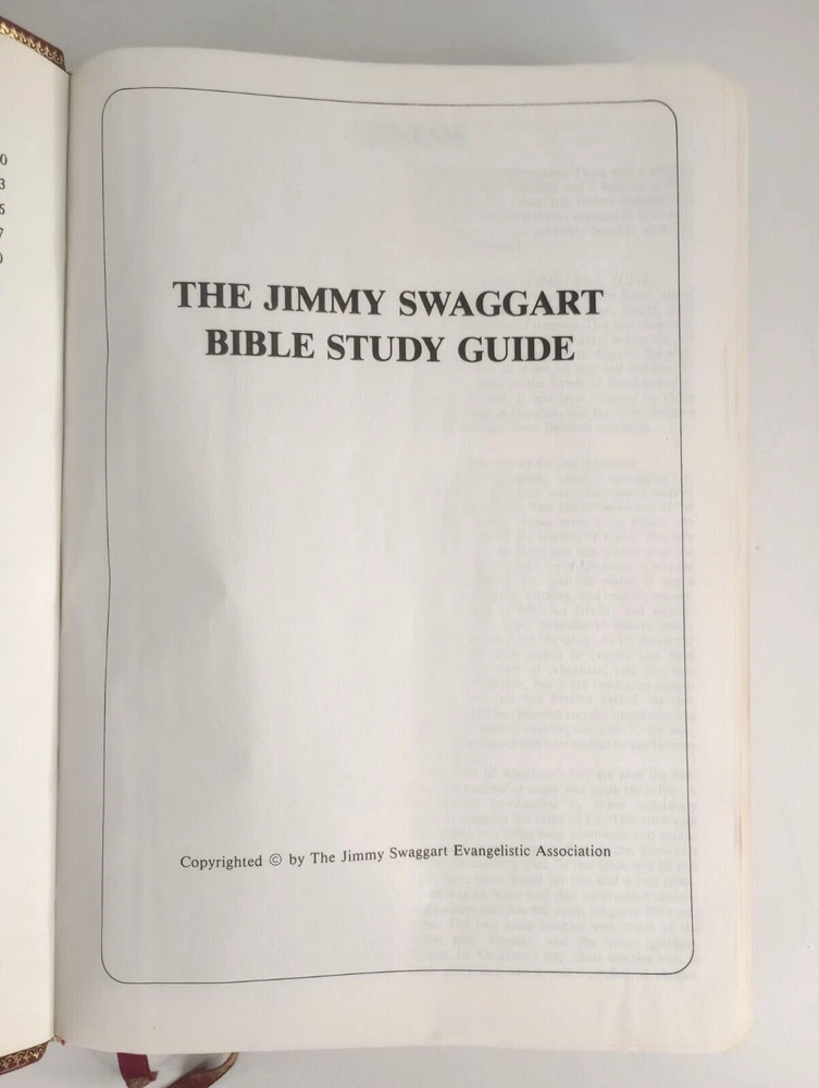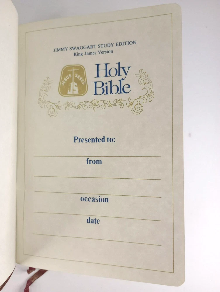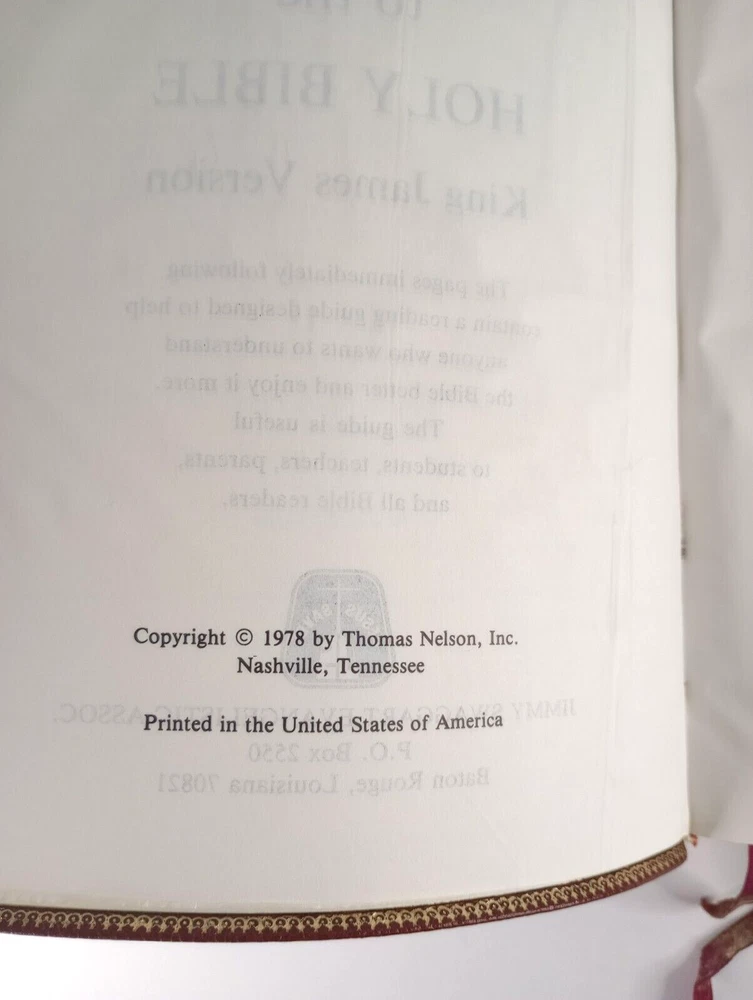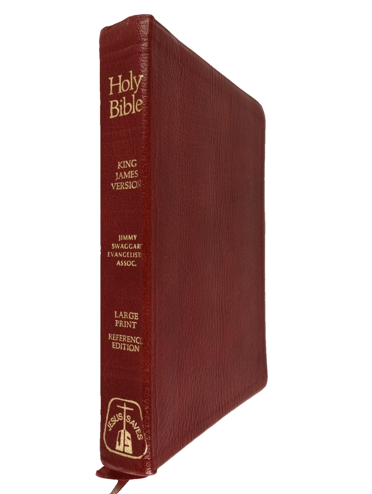 HOLY BIBLE Info -> King James Version * Jimmy Swaggart Evangelistic Assoc. Large Print * Reference Edition * Study Bible Thomas Nelson Publisher * 1978 Copyright * Printed In The USA Size -> 9 1/2" x 6 7/8" x 1 1/2" * Weight -> 2 lbs 9 oz Cover Type -> Soft * Genuine Leather * Color -> Dark Red Condition -> Previously Owned * Appears Unused * Very Good * Clean "Presented To" Page Unused 1 Page Has A Full Length Crease * See Pic 10 Please Expect That You Will Find Minor Signs Of Wear From Aging/Handling/Storage Exact Holy Bible Pictured & Described Will Be Received Shipping -> USPS Media Mail * Packaged Shipping Weight -> 4 lbs Ship Within 24 Hours Of Receiving Payment Read Entire Description * View All 22 Attached Pictures * Email With Any Questions Visit Our eBay Store * New Items Added Daily Thank You * Have A Great Day * finssportsden