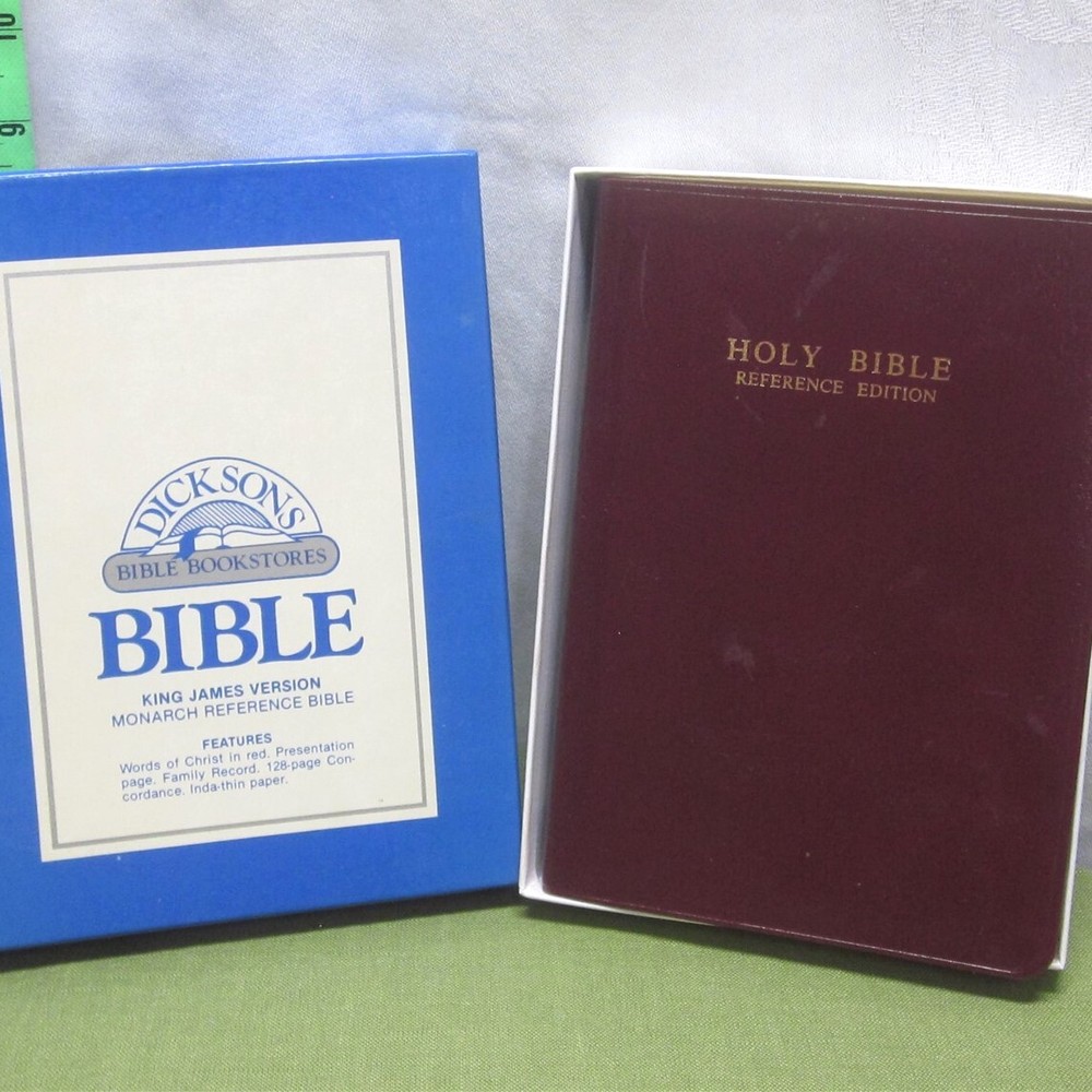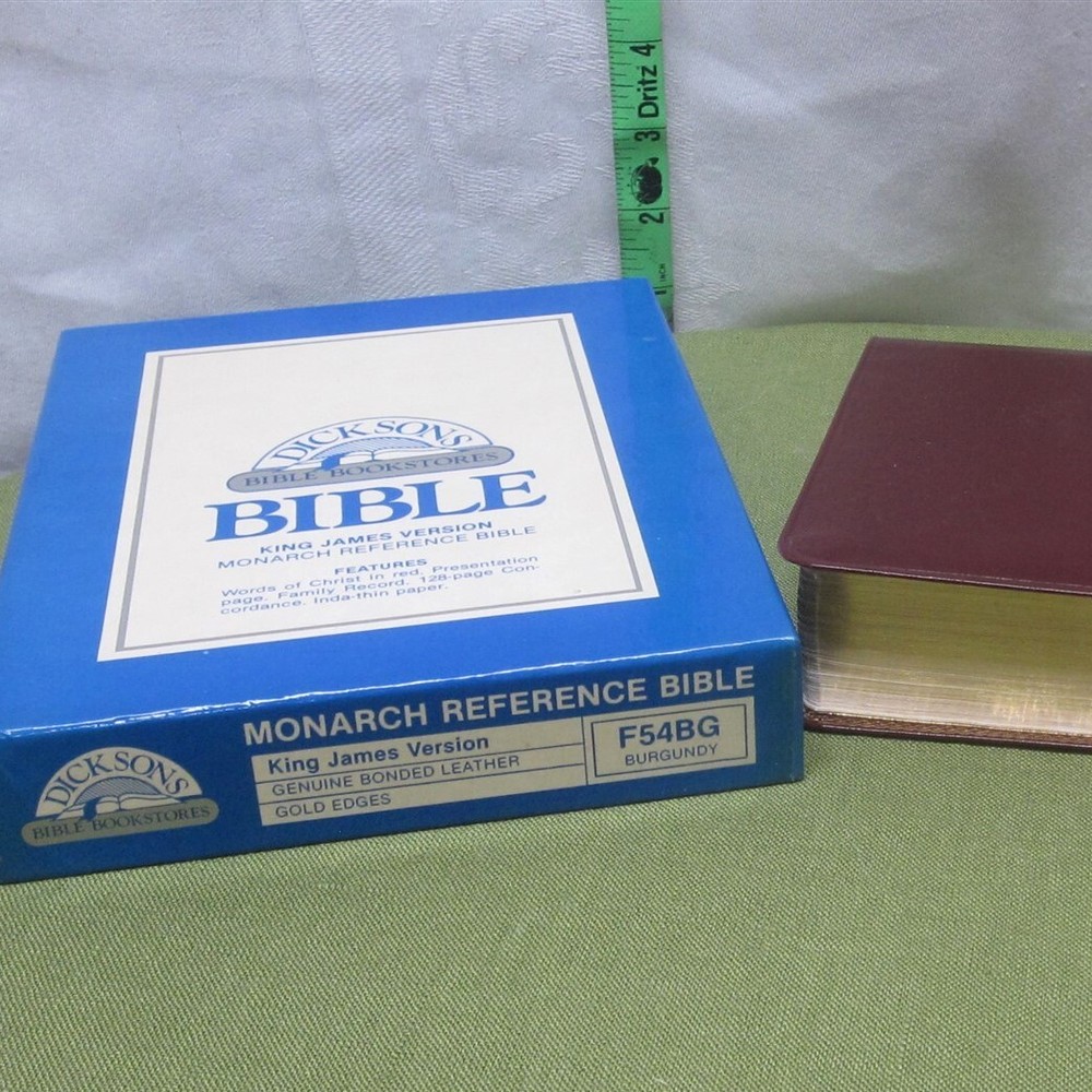 HOLY BIBLE Monarch Reference Edition box King James Version leather & gold edges This is “The Holy Bible: Reference Edition,” a previously-owned, burgundy, leather-bound flexi book manufactured independently by Dicksons Bible Bookstores (catalog #F54BG). It is in great shape and comes with the original box; unfortunately, there are a few scrapes on the cover (see picture)... Powered by SixBit's eCommerce Solution