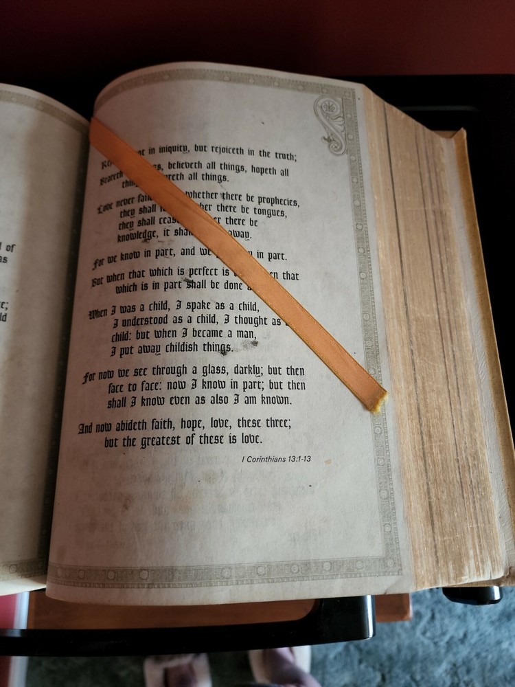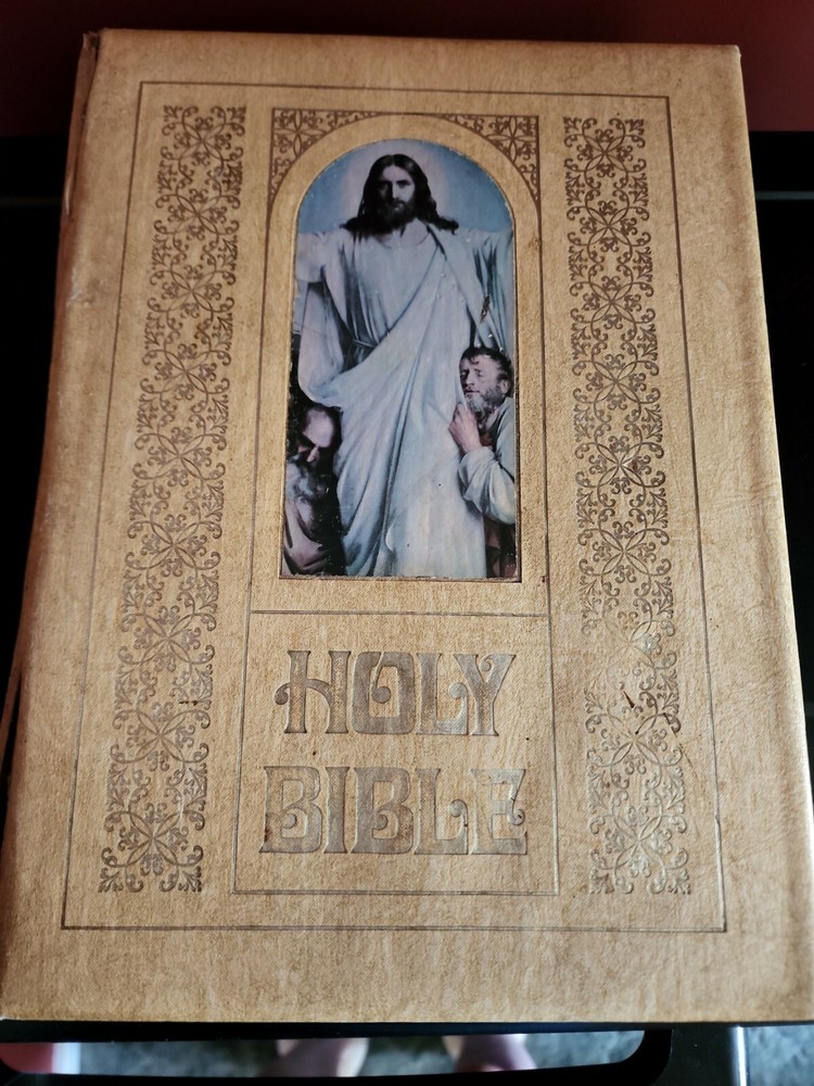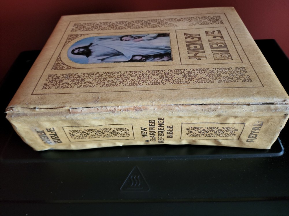 HOLY BIBLE New Clarified Reference Study Edition KJV Leather 1969. This Bible has gold accents and writings. It has both Old and New testaments. Also has color pictures for illustration. The binding does have a tear in it. No pages are torn. I ship out same day as purchase. Thank you for looking.