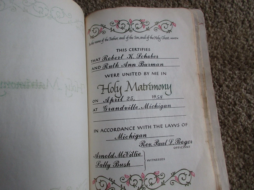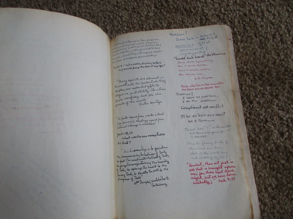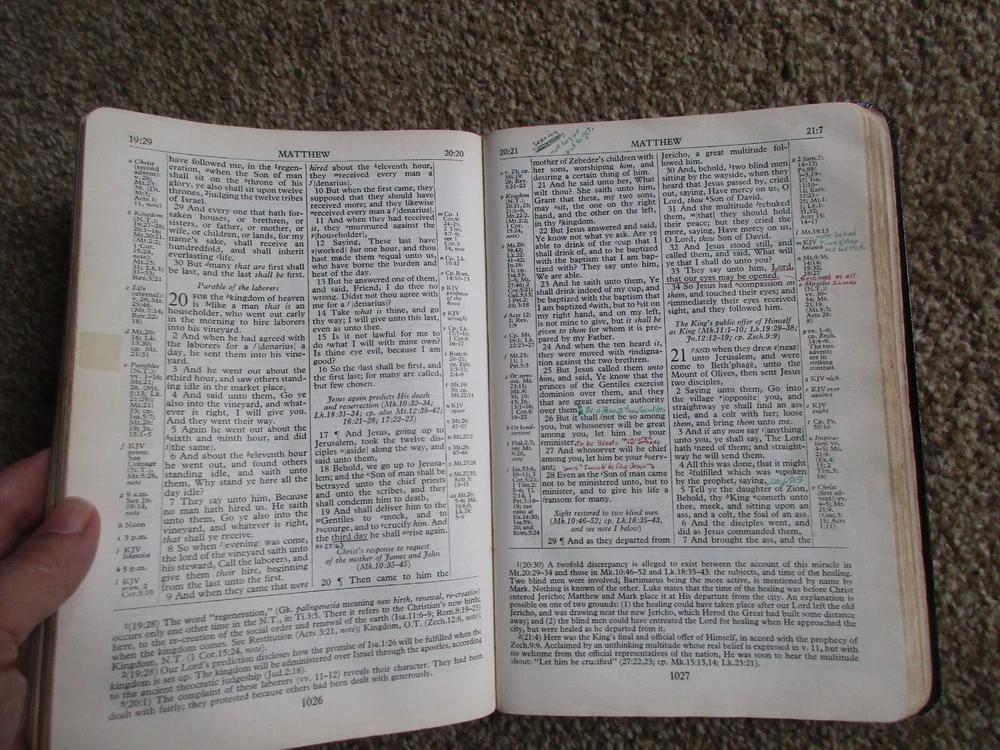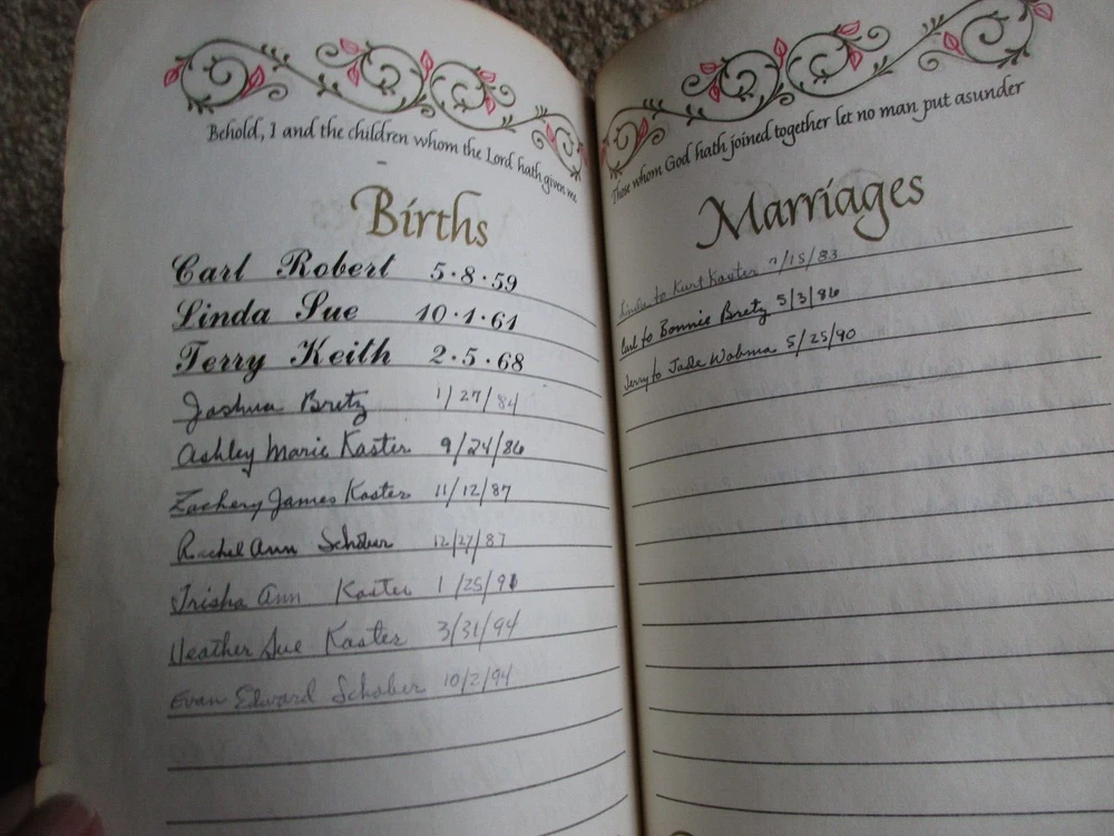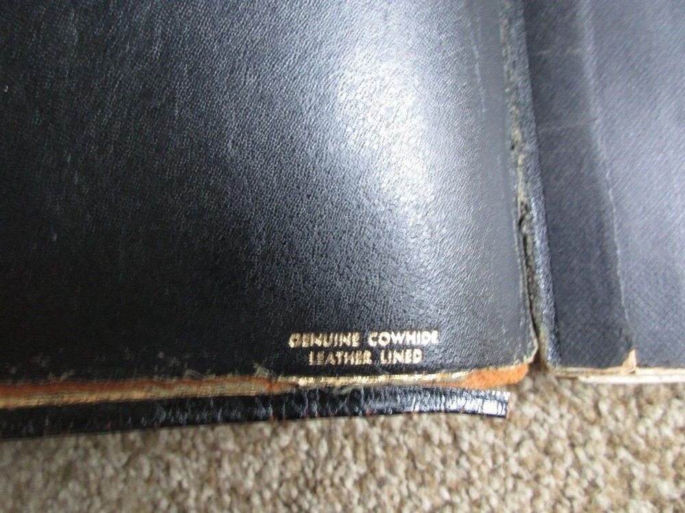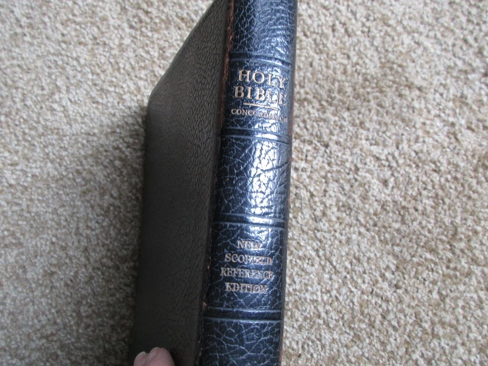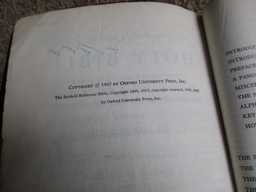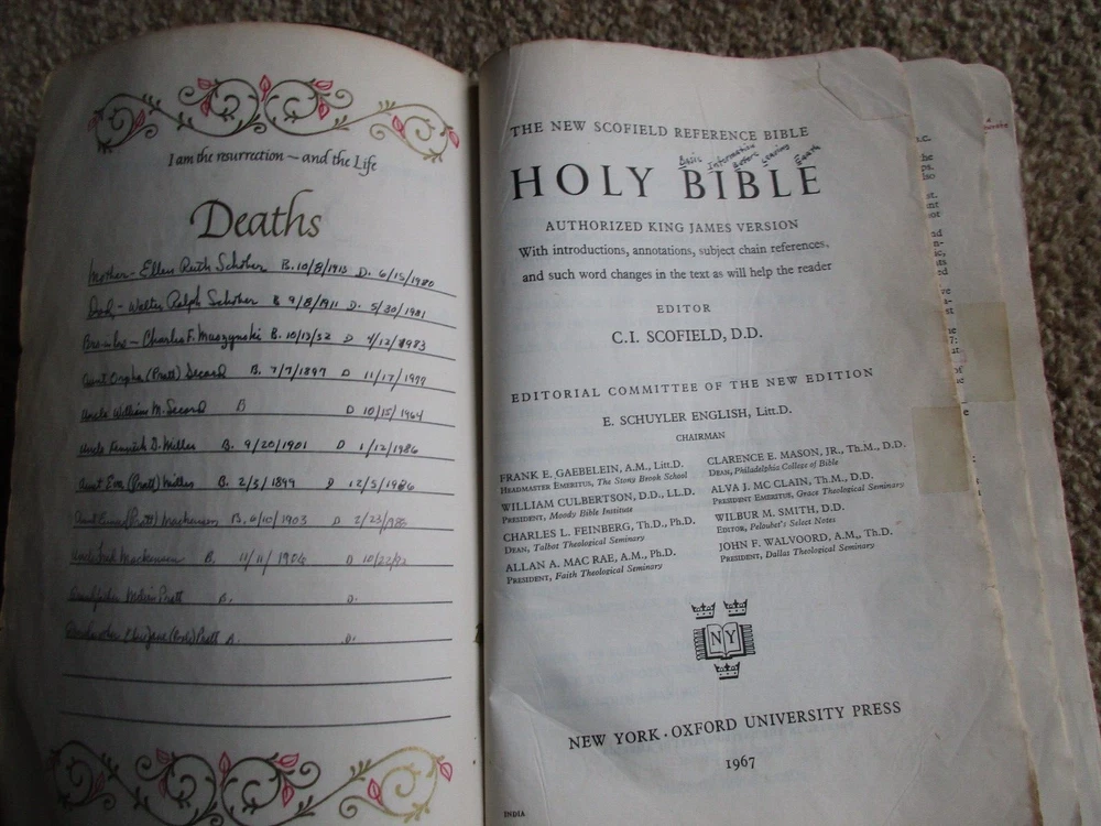 Vintage Family Bible New Scofield Reference Edition Genuine Cowhide Leather Lined Concordance Oxford University Press, New York, NY 1967 Has many family history entries - Last name Schober Well used Bible - Many handwritten notes and entries BX-BK-5
