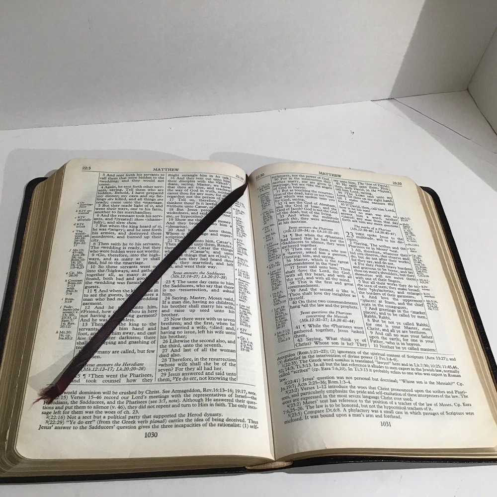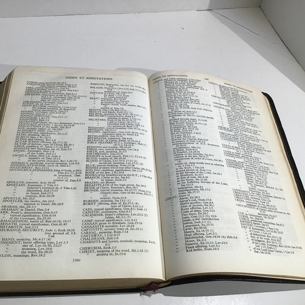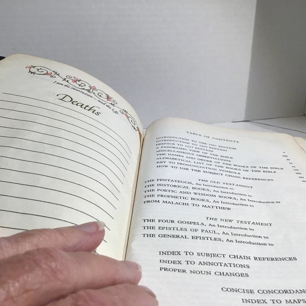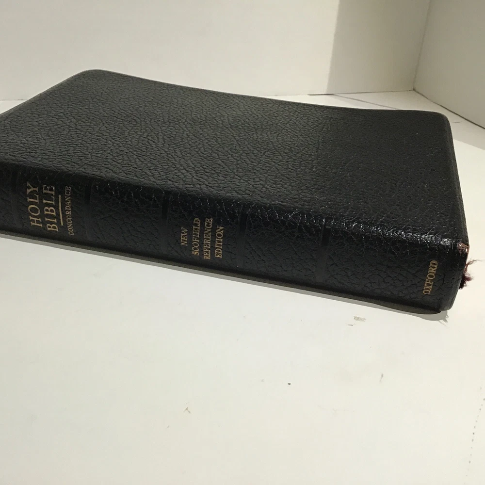 HOLY BIBLE New SCOFIELD Reference Edition OXFORD Genuine COWHIDE LEATHER 1967. There are a few minor flaws to this beautiful well loved Bible. The Holy Matrimony page has been filled out reflecting the couple who owned and loved this Bible. There is no other writing or marking that I can find. There is a few minor worn marks on the spine and the black ribbon marker has been shortened. This has a concordance, reference section and maps.