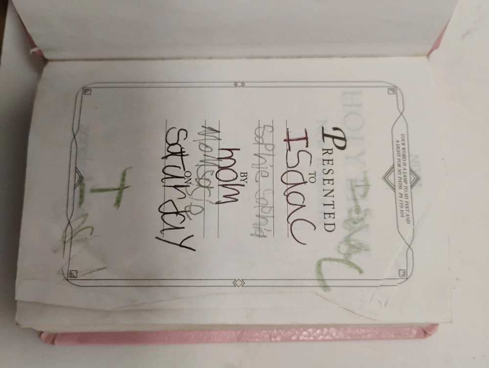 Item as described but dirtier than expected. Cleaned up somewhat but all in all it was as described. The shipping was high considering it arrived in a "padded" envelope without any consideration of how USPS throws around packages and the edges of the Bible were further damaged than they should have been which was disappointing.