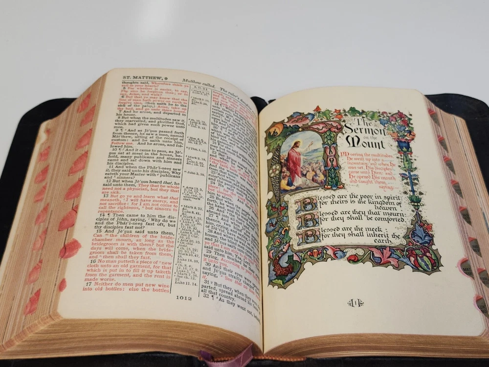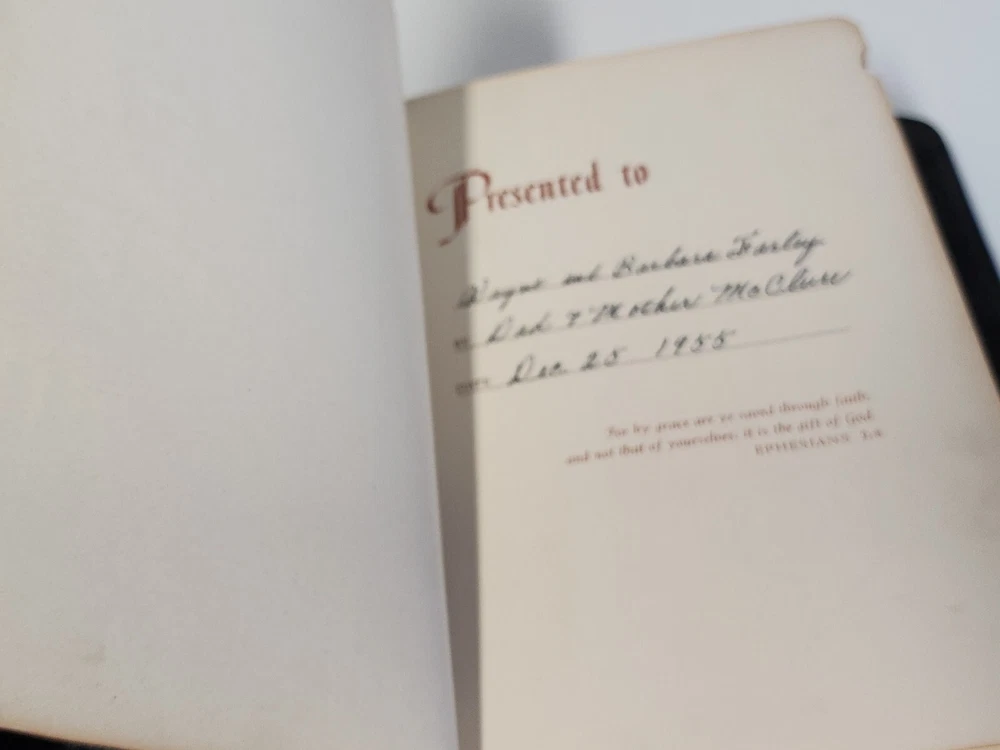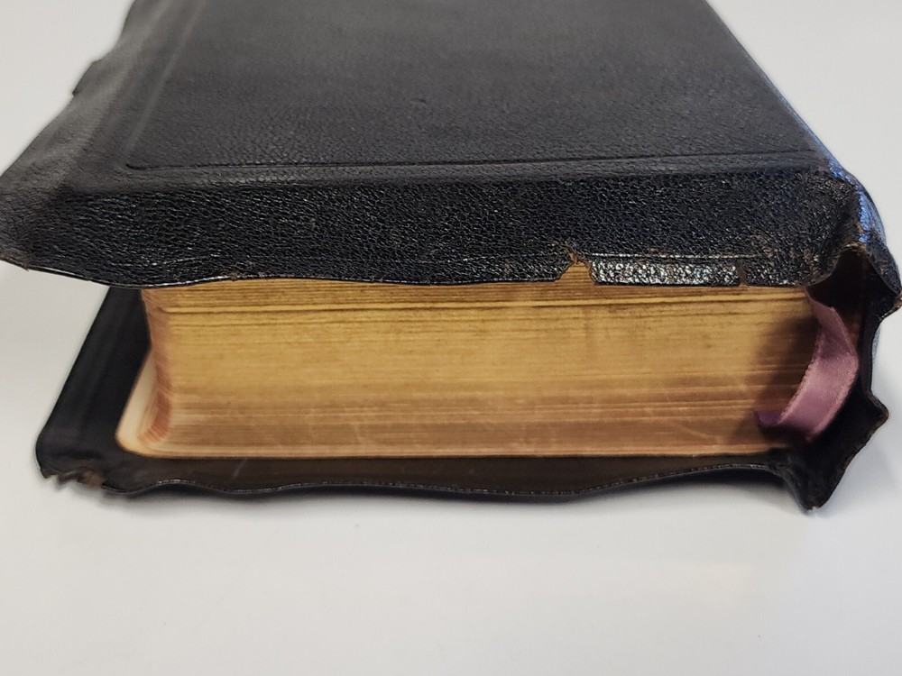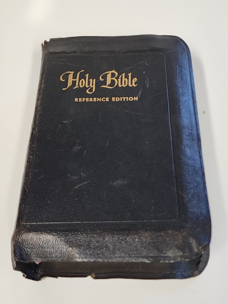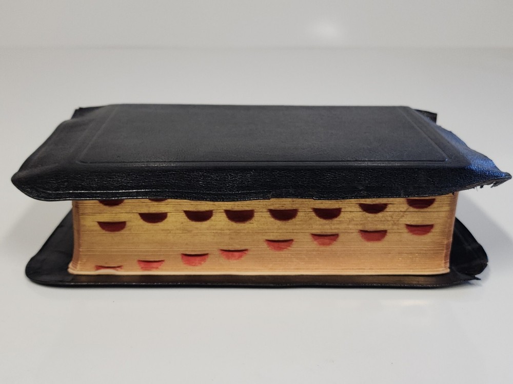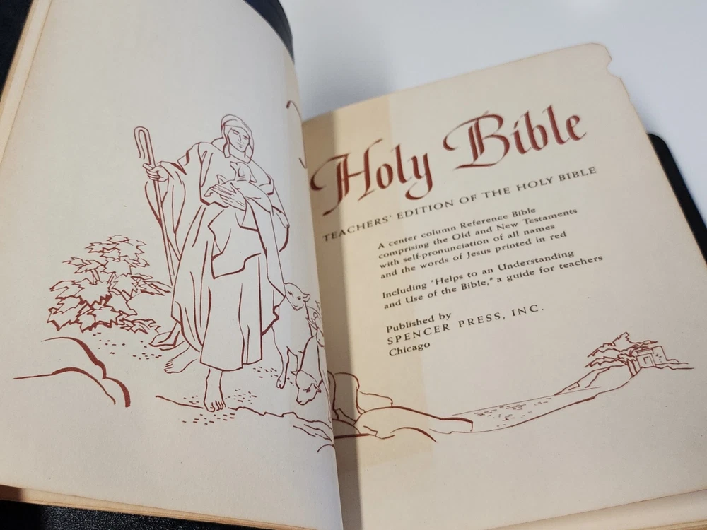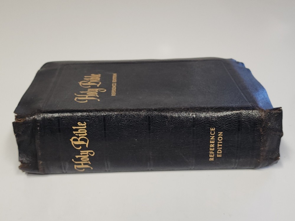 HOLY BIBLE Reference Edition - Teacher's Edition - 1955 - Genuine Morocco. Good preowned condition with minor signs of age and shelf time. No writing or markings except the presentation pages are filled in and family pages have entries made in pencil. Good binding, very minor wear and tatter to edges and corners of cover. Black leather with gold gilding on cover, spine and page edges. Please see photos for more details Any questions are welcomed and answered promptly Fast careful shipping