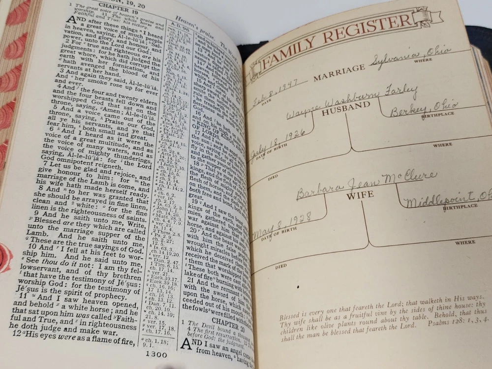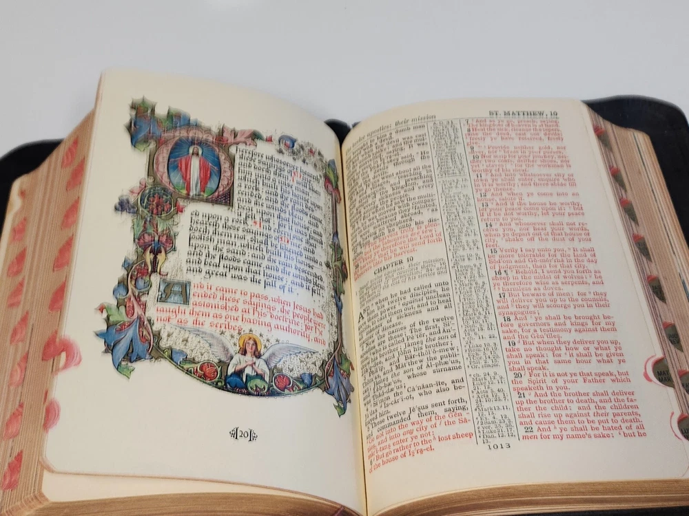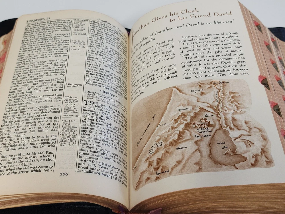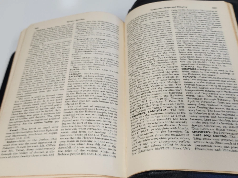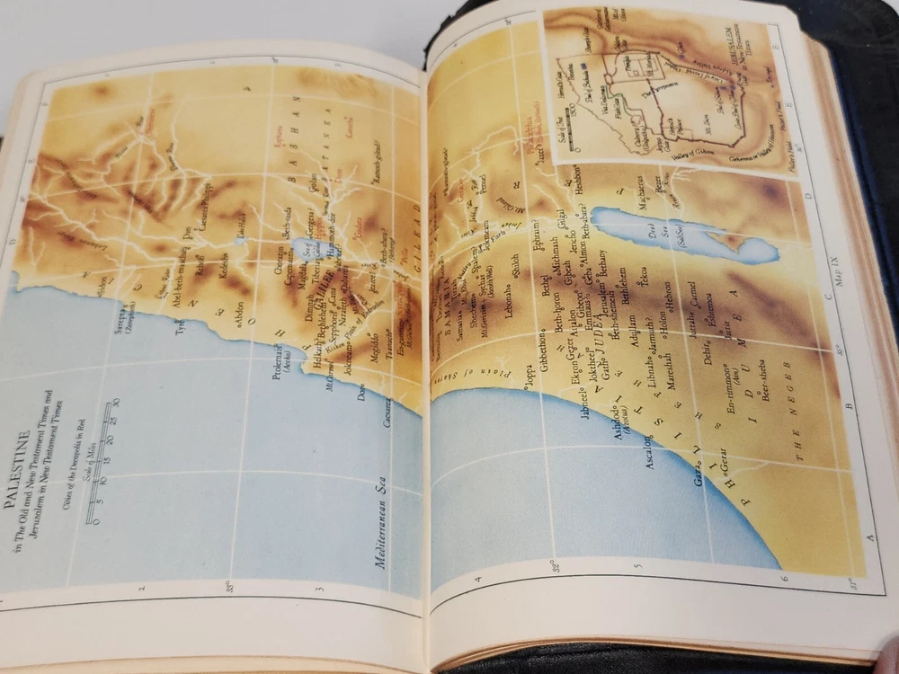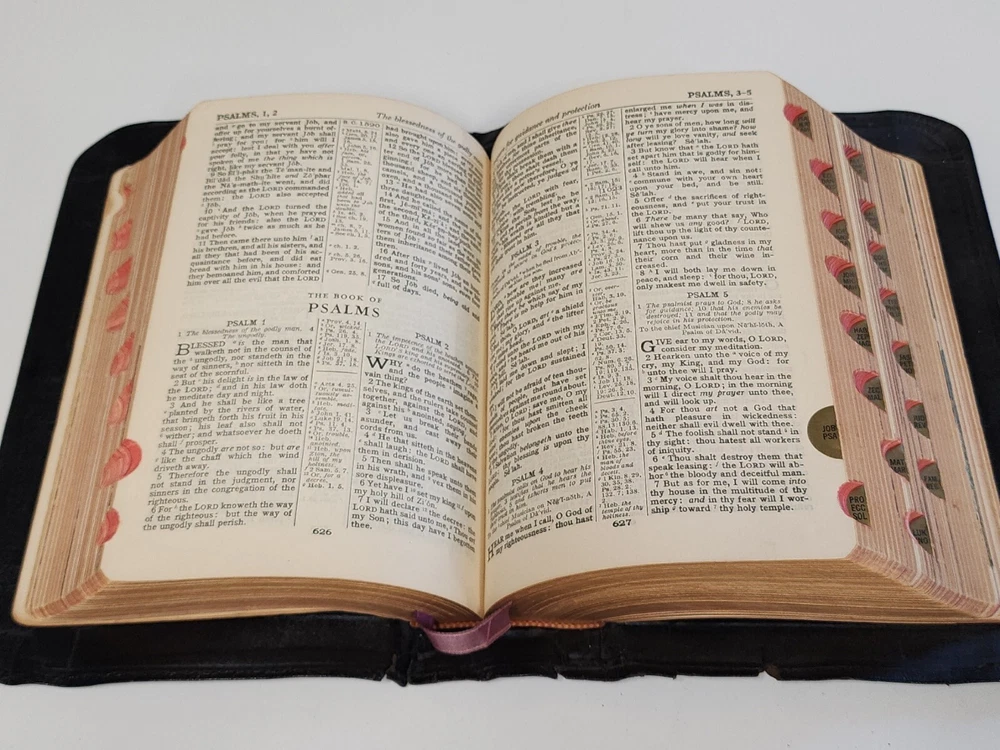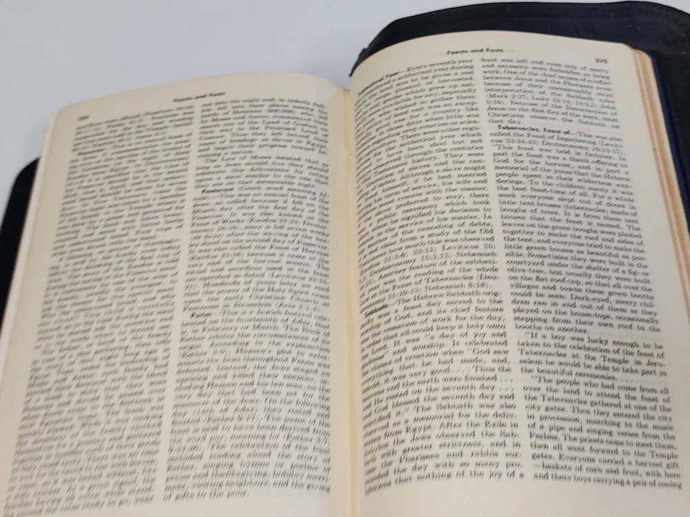 HOLY BIBLE Reference Edition - Teacher's Edition - 1955 - Genuine Morocco. Good preowned condition with minor signs of age and shelf time. No writing or markings except the presentation pages are filled in and family pages have entries made in pencil. Good binding, very minor wear and tatter to edges and corners of cover. Black leather with gold gilding on cover, spine and page edges. Please see photos for more details Any questions are welcomed and answered promptly Fast careful shipping