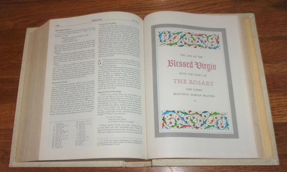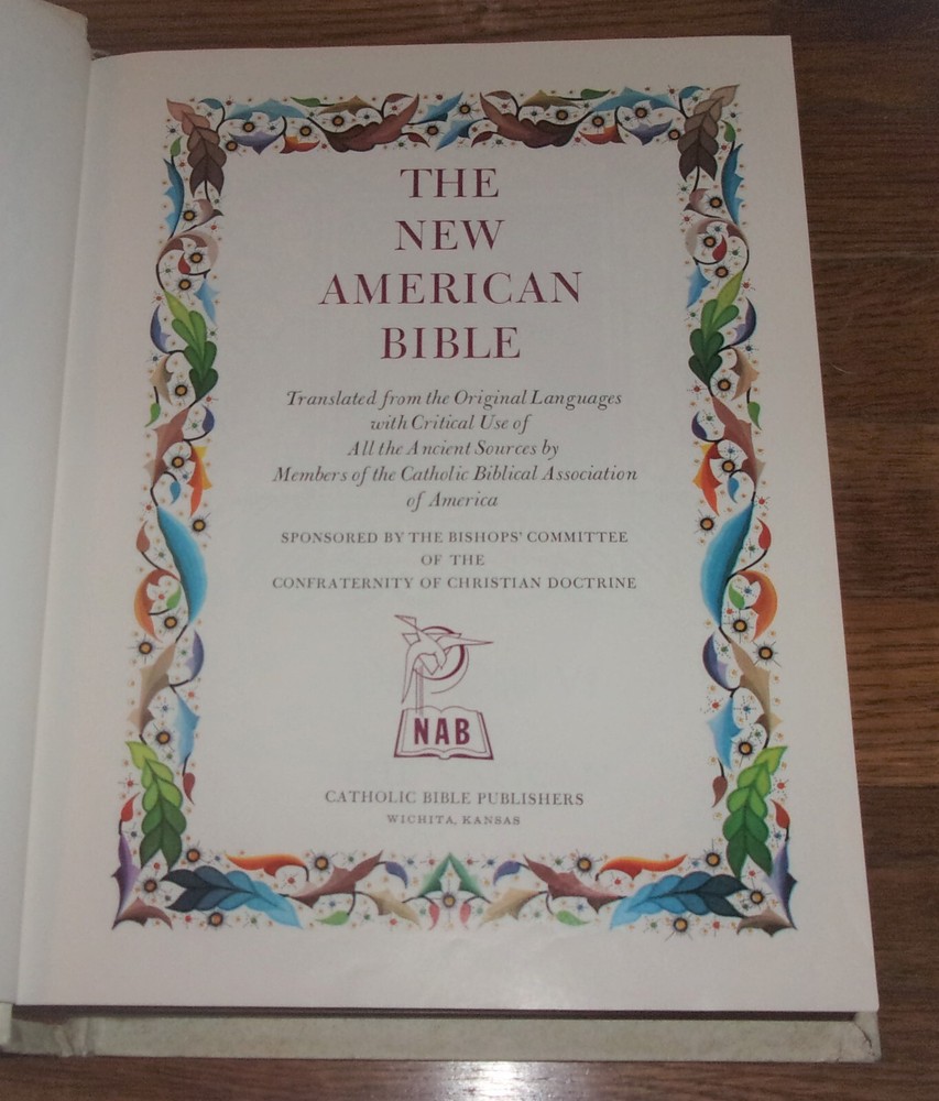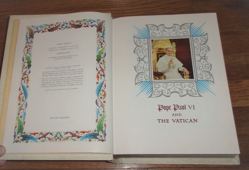 Hi! You're looking at a SUPERB condition book which is a beautiful vintage Reference Edition Catholic Edition Holy Bible containing the Old and New Testaments and presented in The New American Bible translation published in a "Fireside Family Edition"--the book is a beautiful, VERY large leather bound display bible with embossed silver lettering and graphics on the cover and spine end and full gold gilt page edges. This book is in SUPERB condition and has a blank presentation page, very light dings on the psine tips, light wear on the raised portrait of Jesus Christ on the upper left corner of the front cover (this is possibly deliberately aged on publication) some light scuffs on the gold gilt page edges and just very light shelfwear otherwise but NO other signficant imperfections! The book is titled Holy Bible, Fireside Family Edition: The New American Bible--Translated from the Original Languages with Critical Use of All the Ancient Sources by Members of the Catholic Biblical Association of America and it was published by Catholic Bible Publishers in 1972 and is a 1971-1972 Edition. A fantastic find, and a beautiful copy of t his book! Thanks for looking, and good luck if you're bidding! Also be sure to check out all of my other great books currently listed on ebay aucti ons--I can combine sh ipping for multip le pu rchas es!