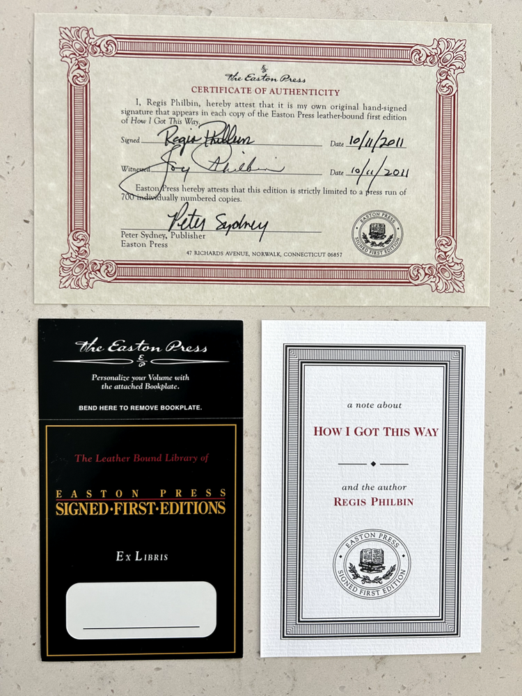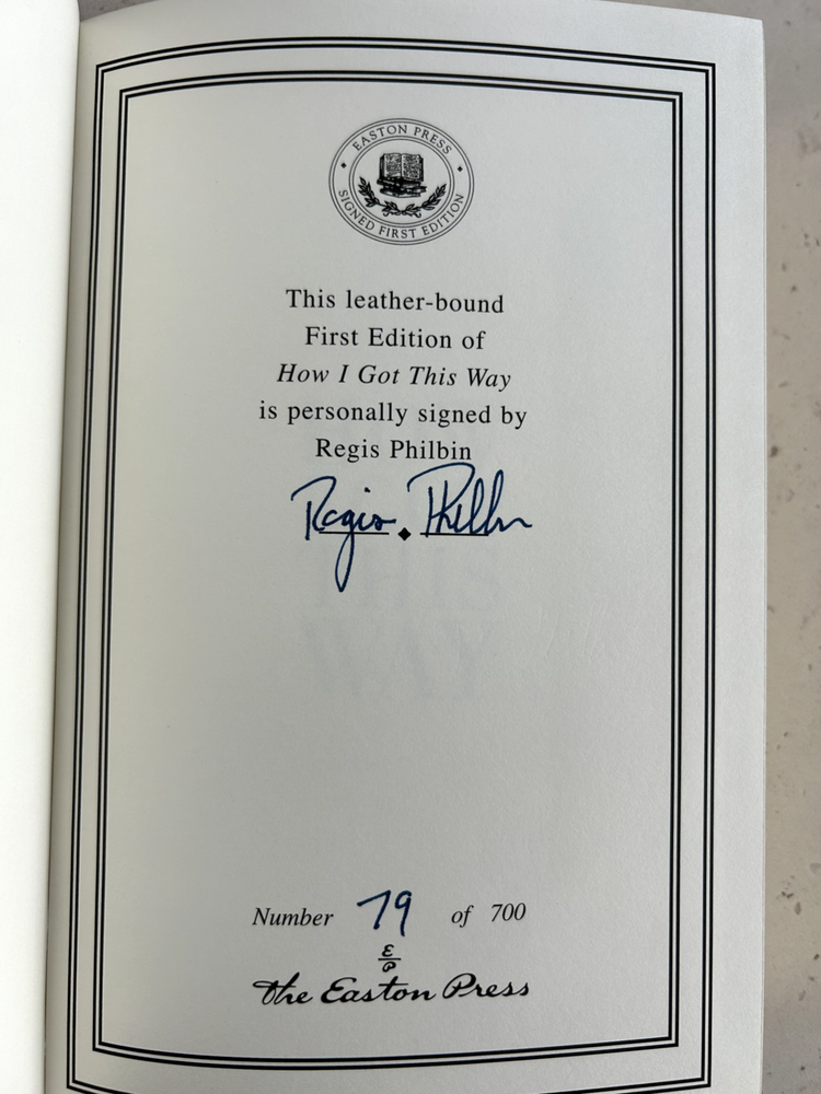 How I Got This Way by Regis Philbin Signed leather bound 1st Edition w/ COA, numbered 79 of 700 Like new - book has not been read, no bent pages Easton Press "Signed First Editions" (2011) Bound in fine genuine leather with 22K gold page edges Archival acid-free paper Domestic shipping only Returns accepted within 30 days