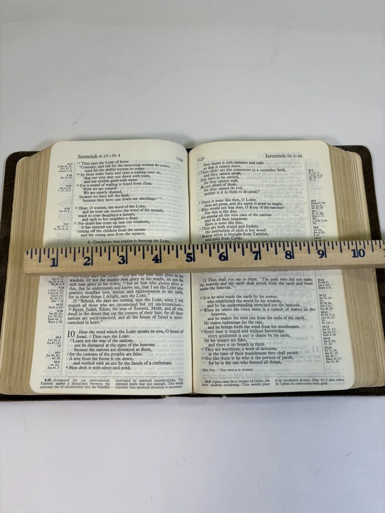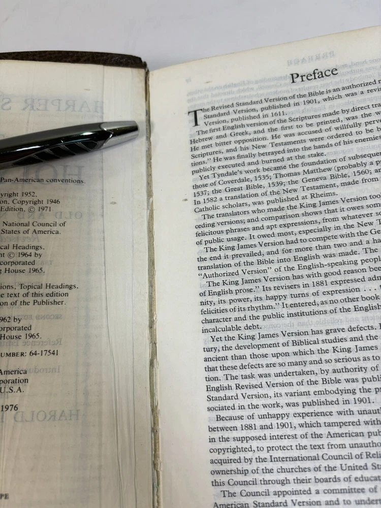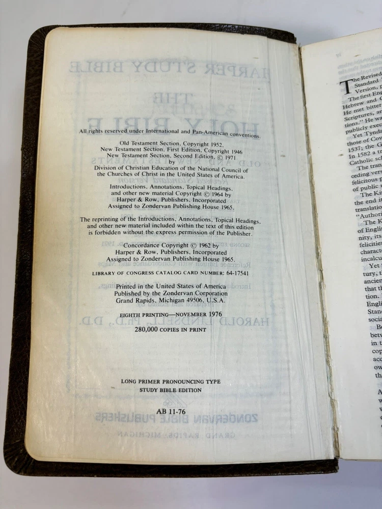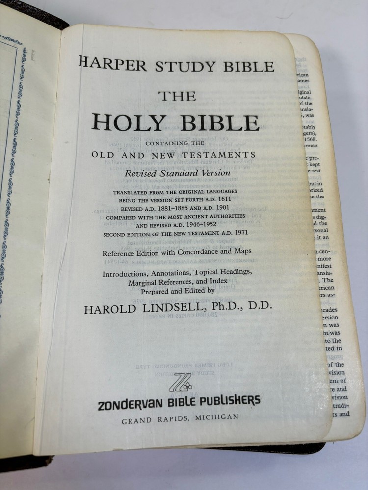 Pre-owned and well-used Harper Study Bible RSV. Spine is damage. Cloth book mark is removed. Personal info inside cover. Please see pictures for representative sample of damage.