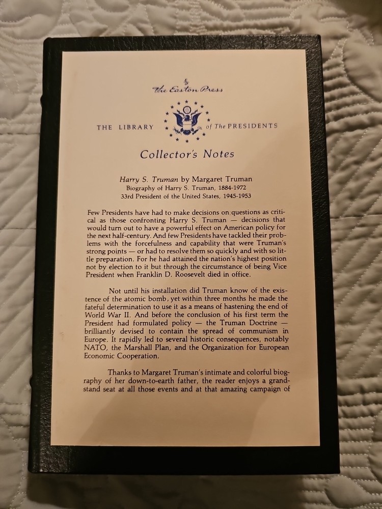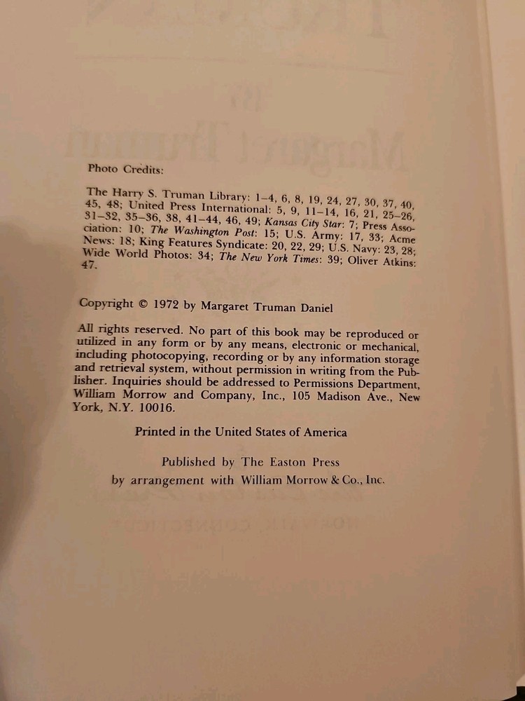 The product is a special collector's edition of "Harry S Truman" by Margaret Truman, part of the Easton Press Library of the Presidents. This limited edition book is bound in high-quality leather, making it a valuable addition to any historical or presidential biography collection. Written in English, this biography provides insight into the life and actions of Harry S Truman, offering a unique perspective on American history. With its special attributes and exclusive publisher, this book is sure to be a prized possession for any book enthusiast or history buff. Ships securely via USPS from Pennsylvania