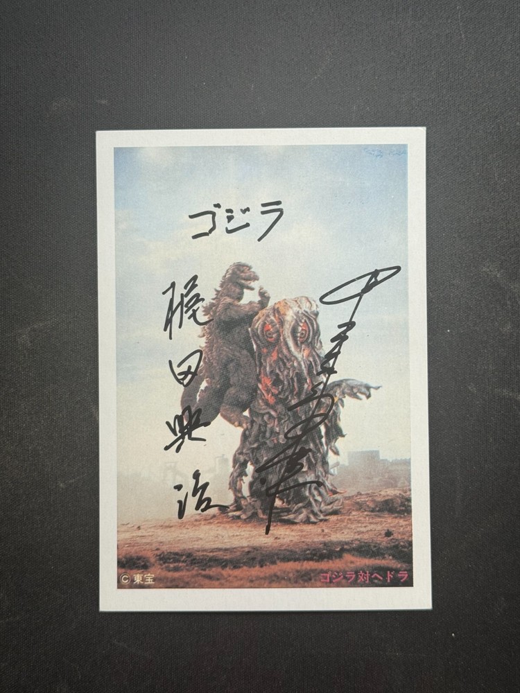 This rare item is a photo card for the 1971 movie "Godzilla Vs The Smog Monster" (Godzilla vs Hedorah) The item is autographed by Haruo Nakajima (Godzilla Suit Actor) who inscribed "ゴジラ" / "Godzilla" at the top.. The item is also autographed by Koji Kajita (The Producer of the movie) Incredibly rare item since Haruo Nakajima has passed back in 2017. Any questions ask away - will be shipped priority mail.