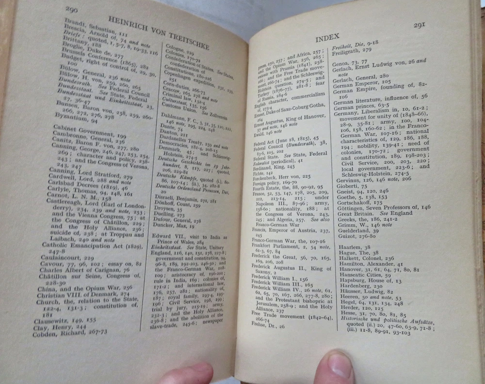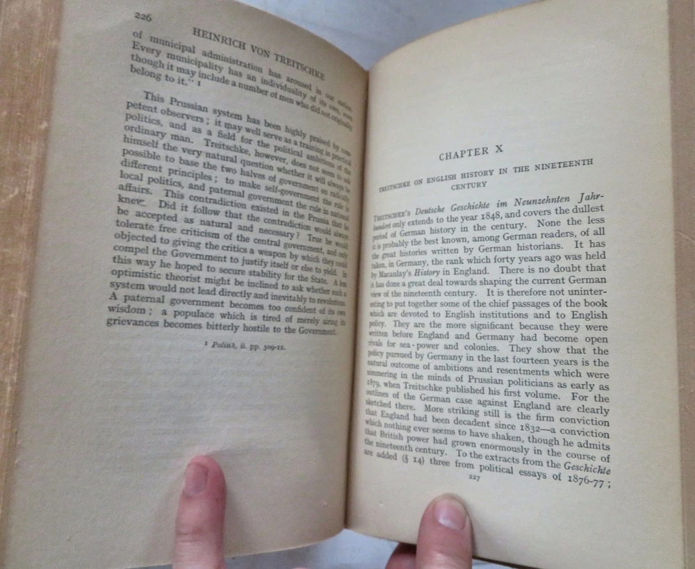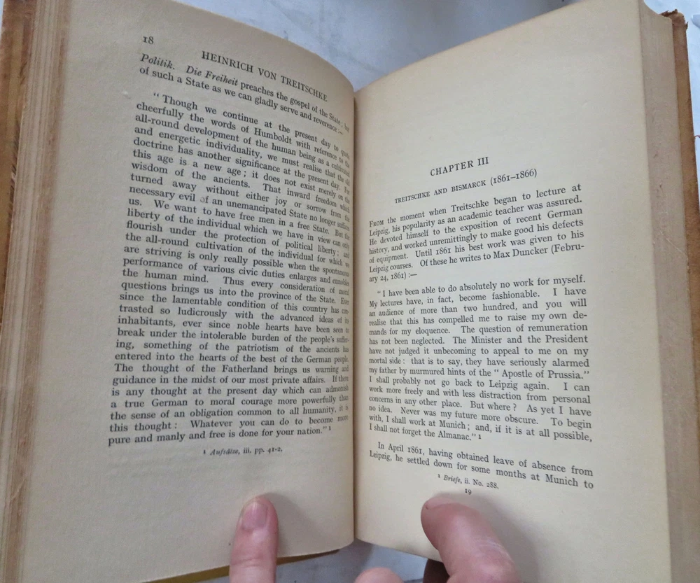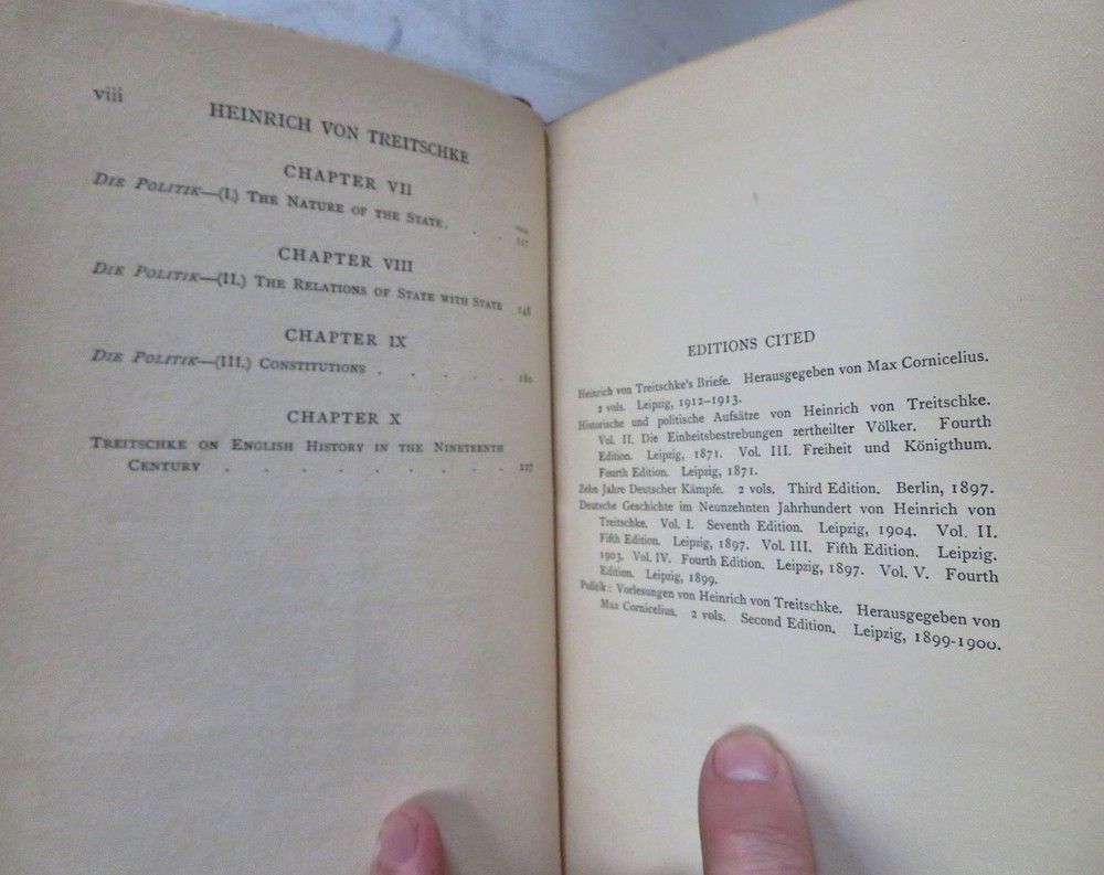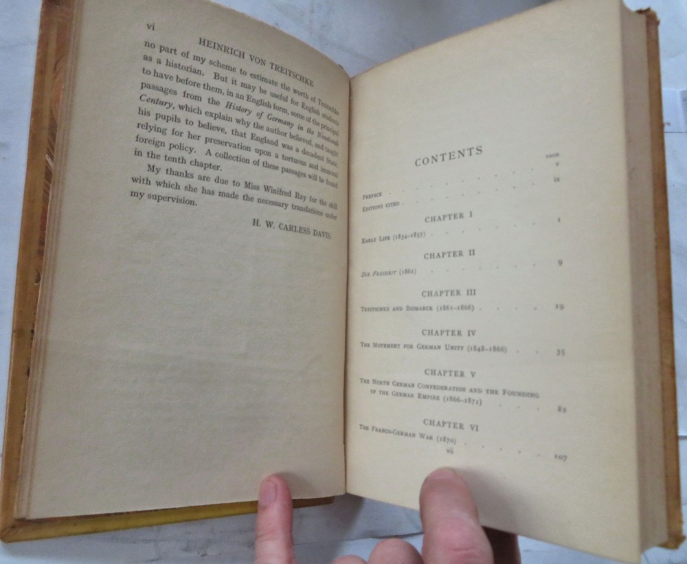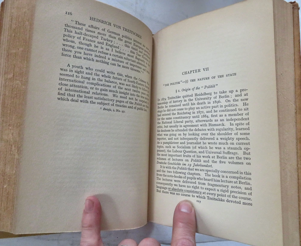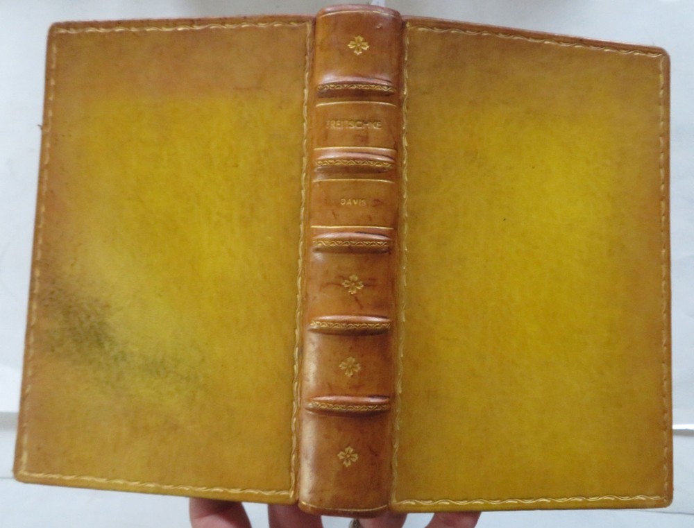 Heinrich von Treitschke 1914 Political Thought German Nationalism leather book Heinrich von Treitschke 1914 Political Thought German Nationalism leather book (Old Books, 20th Century Books, Leather Books, Military History, WWI, Heinrich Treitschke, German Nationalism). The Political Thought of Heinrich von Treitschke by H.W.C. Davis. Published 1914, London, by Constable and Company. 295 pages. Text in English. Very scarce to find in custom leather binding like this. Early owners scattered underlining's or marginal notes to text seen, mostly in pencil (erasable). Custom attractive full antiquarian leather binding, raised bands, gilt title lettering & compartment decorations. Great custom book plate of early owner. Book is physically old and shows some signs of handling and time. Binding gently age worn but still appealing, leather and joints slightly rubbed but still supple, remains overall very attractive as an object. Text block paper is gently age toned as typical, internally book remains mostly clean, tight and sound. A book which has been taken care of but may/ does not look like new. Still attractive on the shelf. Book displays a pleasing and unique age patina and is in rather nice antiquarian condition, any age flaws seem easy to overlook or forgive. Please review photos for more detailed attempt to present this book as it survives. We often over-describe any flaws that many sellers would not even bother to mention since most people would overlook them as minor and unworthy of comment. Many people tell us the books they receive from us are nicer in person than they appears on the screen. We want you to be clear about what you are buying, so we take numerous photos and try to describe it openly and honestly. Book Measures c. 10 1/4" H x 7 1/4" W. [B11754].