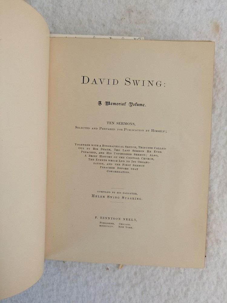 Helen Swing Starring DAVID SWING A Memorial Volume 1894 F. Tennyson Neely, Chicago Limited Edition, #38/1000, Signed by the Publisher In good condition. Please examine photos for details. Condition: We strive to describe and photograph the condition of every item as accurately as possible. Photos are of the actual item that is being sold. Please examine the photos carefully for any condition details and possible flaws. Best Offers: Items are available for offers after being listed for 30 days. We consider all offers in relation to current market values. We try to respond almost immediately to most offers. Most of our counteroffers are firm but we are open to bargaining. Shipping for US Customers: We combine shipping. All of our orders are packed carefully to prevent damage during shipment. We ship most of our items within 24 hours. Shipping for International Customers: All international orders are shipped via Ebay's Global Shipping Program. Contact Us: We are available 7 days a week and are happy to answer any questions you may have. THE simple solution for eBay sellers.