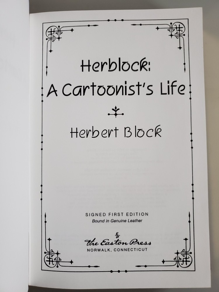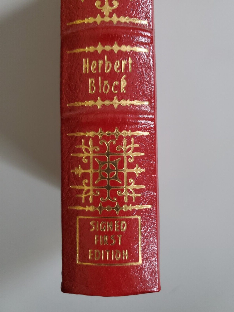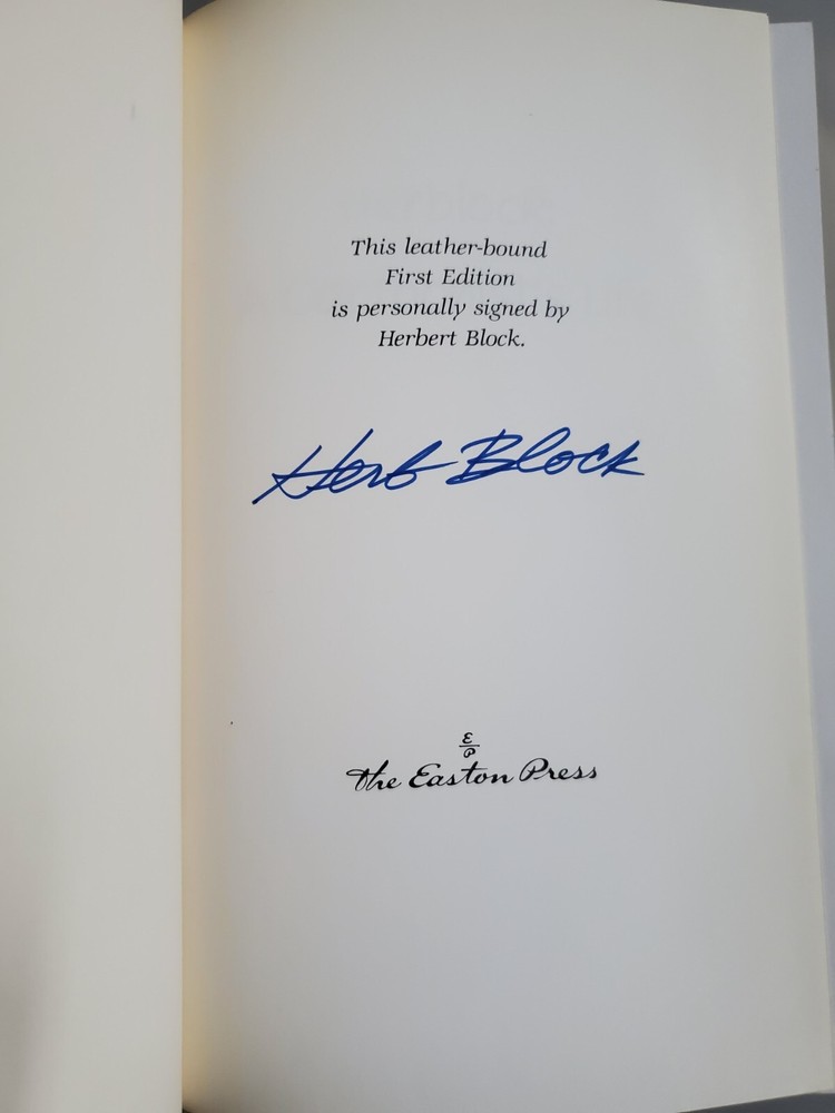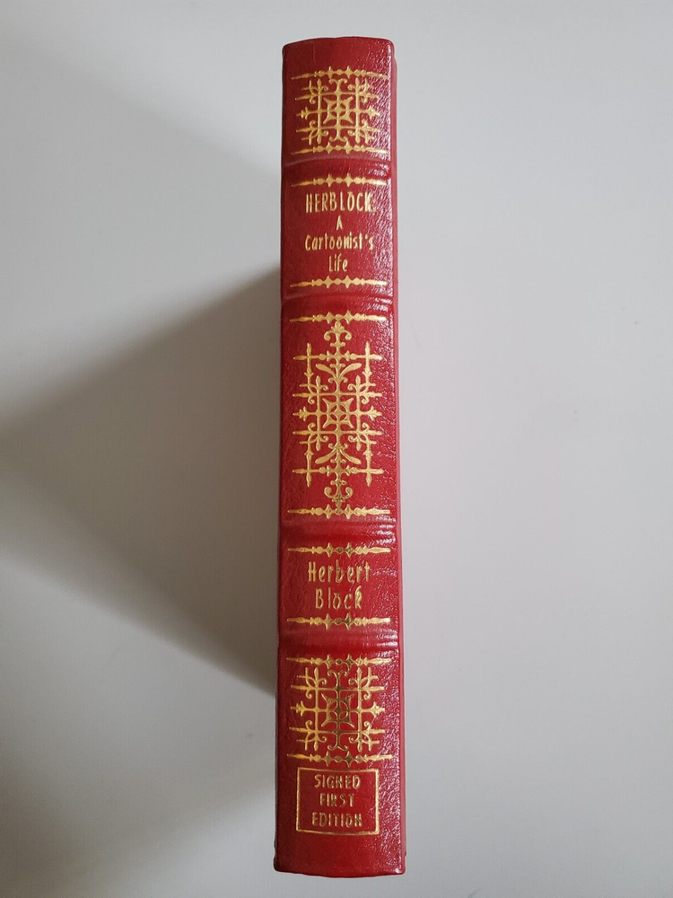 Herblock: A Cartoonist's Life by Herbert Block. Like new Easton Press Signed First Edition. This hardcover book boasts the features that are expected from Easton Press: signed by the author, bound in genuine leather, with gold lettering and decorations on the cover and spine, gilded page edging and a sewn-in satin bookmark. Decorative pattern is the same on front and back cover. The text is printed on archival quality acid-neutral paper. It is illustrated with Herblock cartoons throughout. These books are a pleasure both to display and to read.