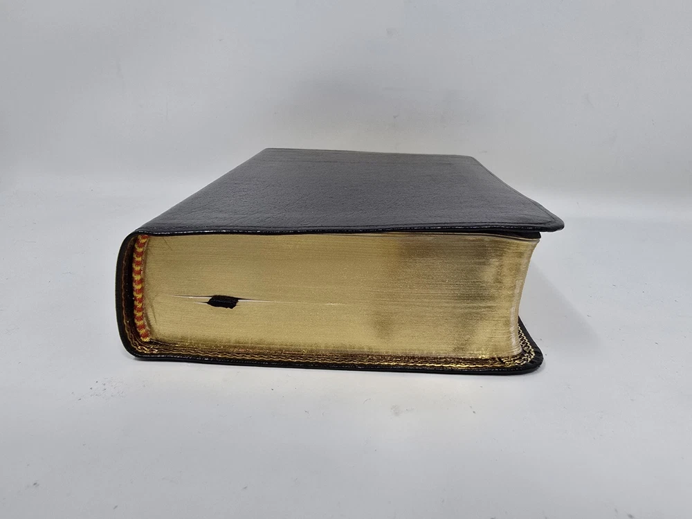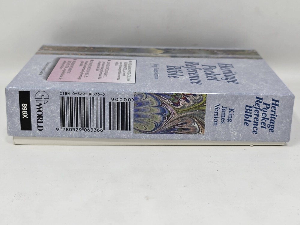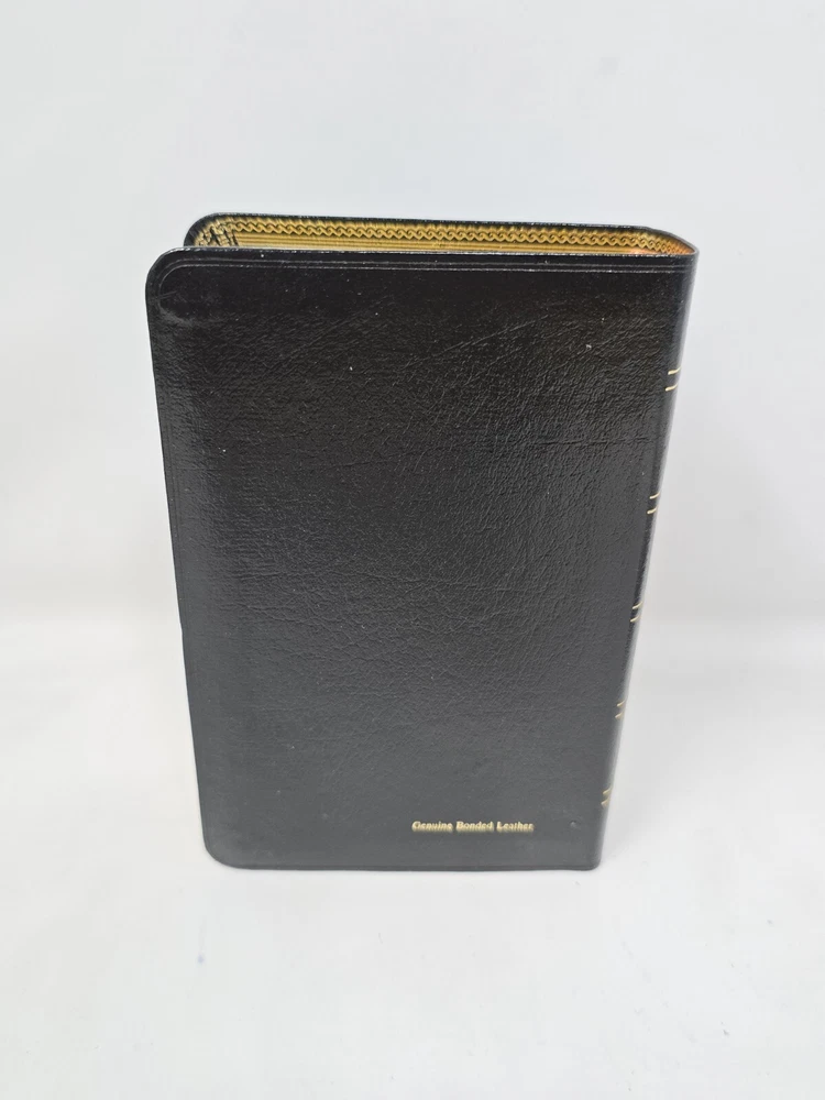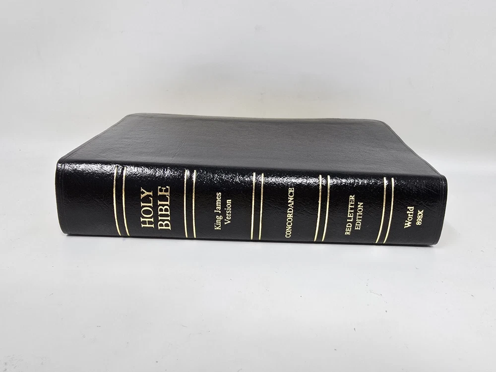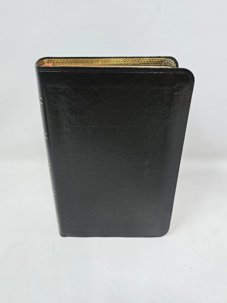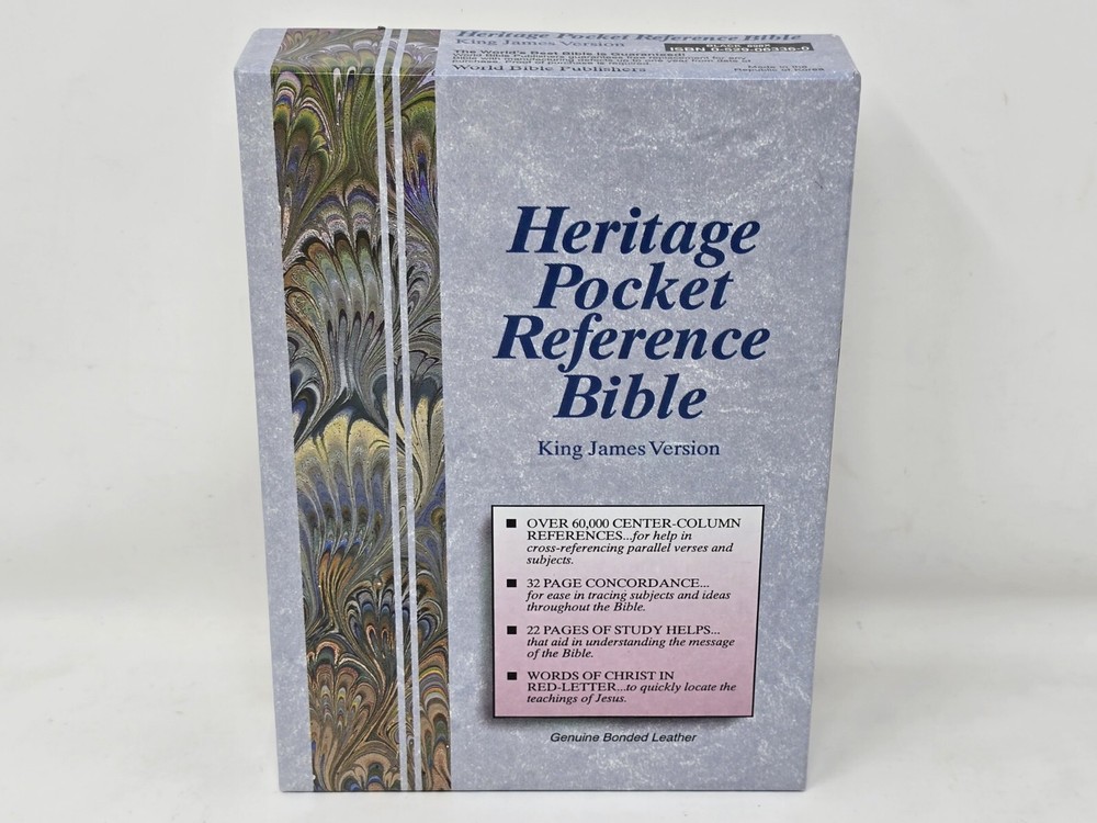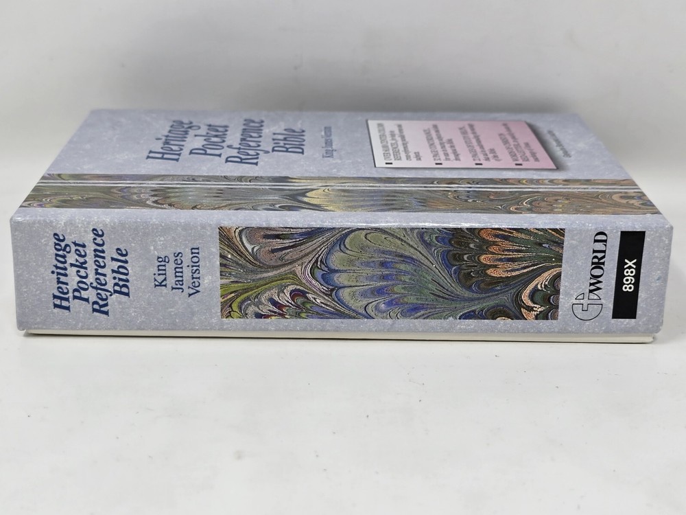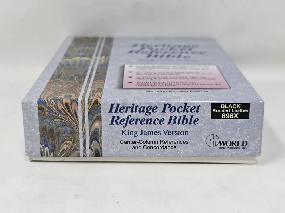 5¾" x 3⅞" x 1⅛". Heritage Pocket Reference Bible King James Version, Concordance, Red Leather Edition, Bonded Leather, Black. Water damage to bottom corner that caused wrinkling, but no damage to text. See photos for details on condition. Shipped safely in a box via USPS Media Mail.