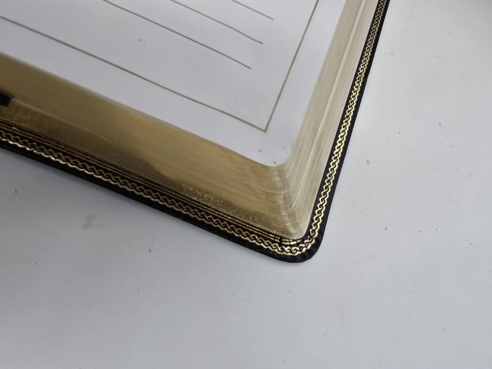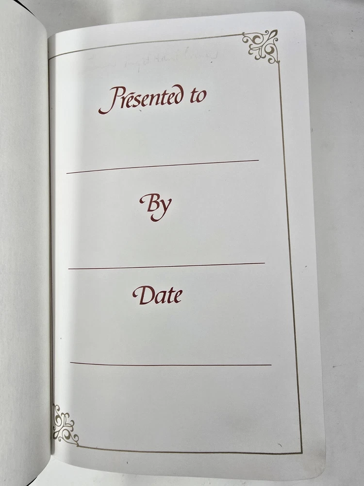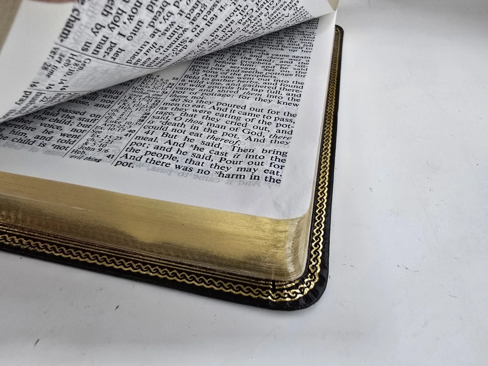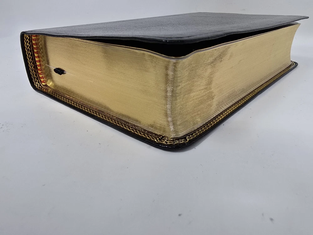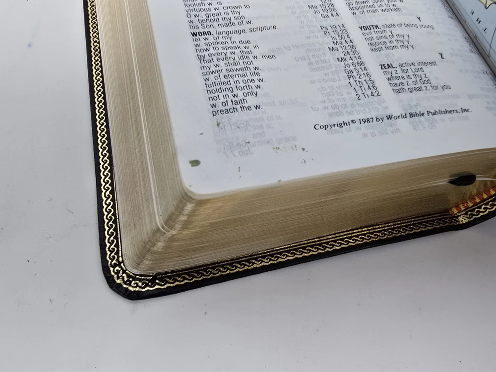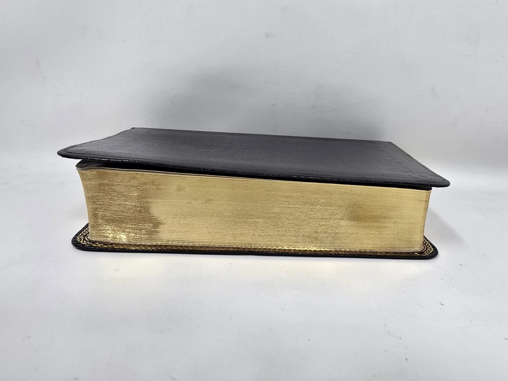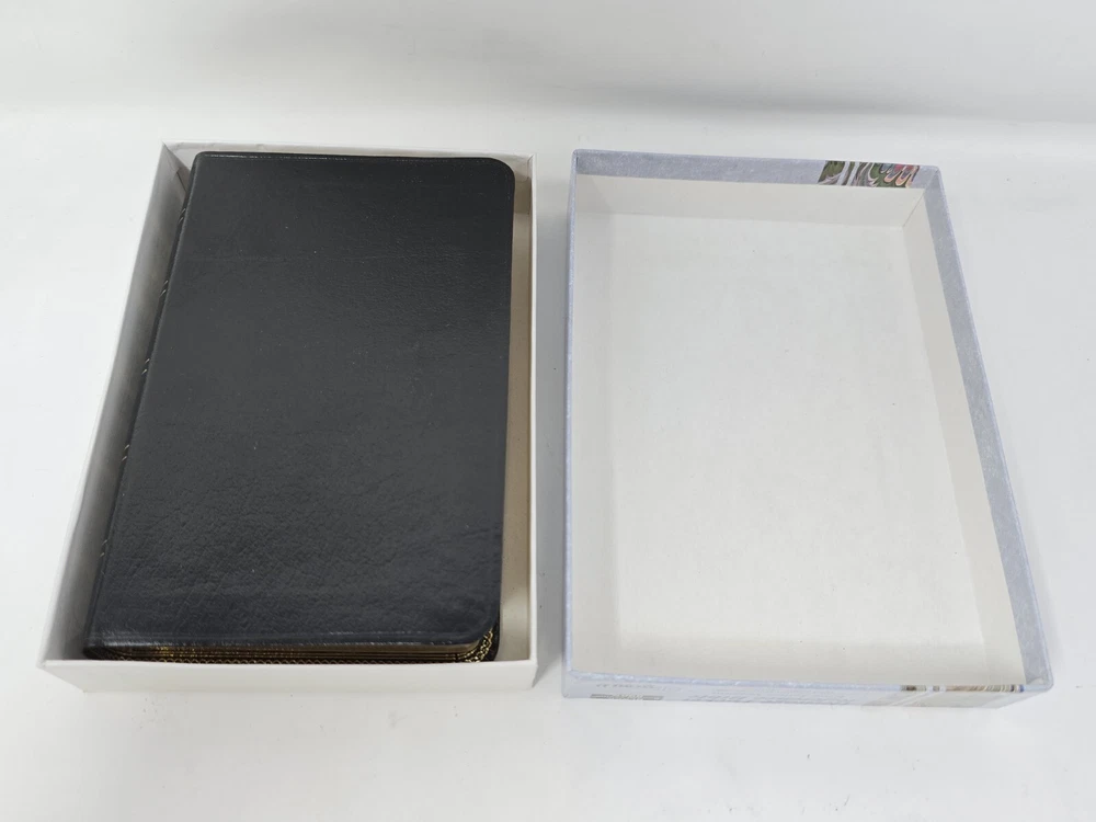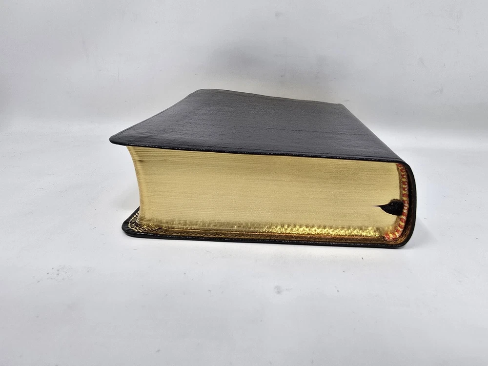 5¾" x 3⅞" x 1⅛". Heritage Pocket Reference Bible King James Version, Concordance, Red Leather Edition, Bonded Leather, Black. Water damage to bottom corner that caused wrinkling, but no damage to text. See photos for details on condition. Shipped safely in a box via USPS Media Mail.