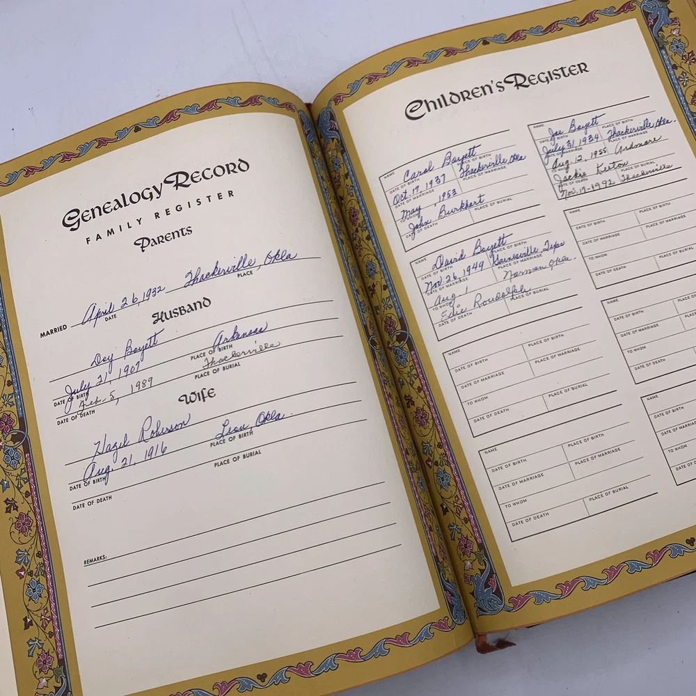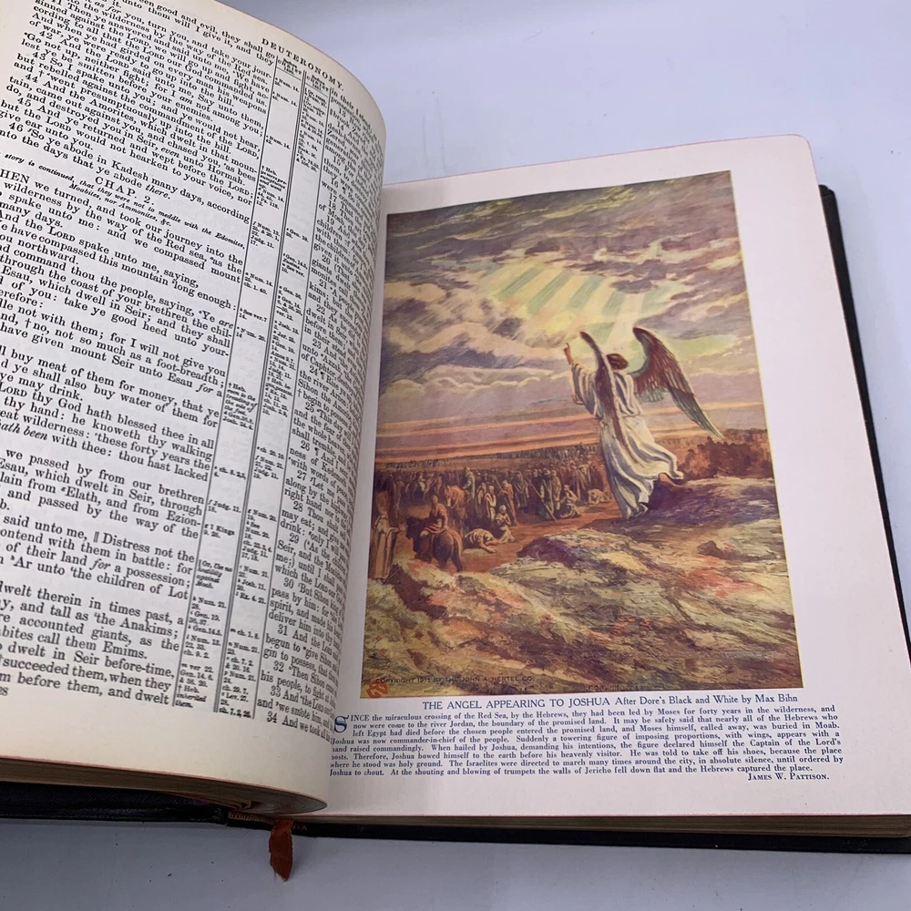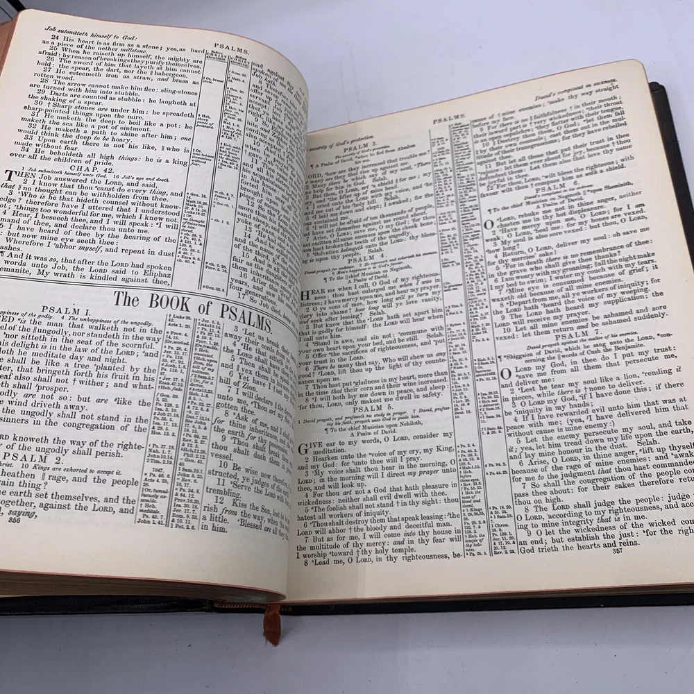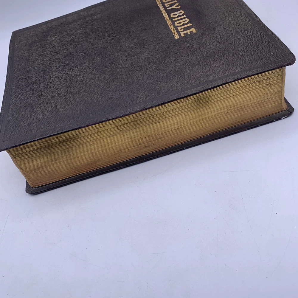 Large reference bible in good used condition. A tear on title page. Writing on genealogy page. See pics.