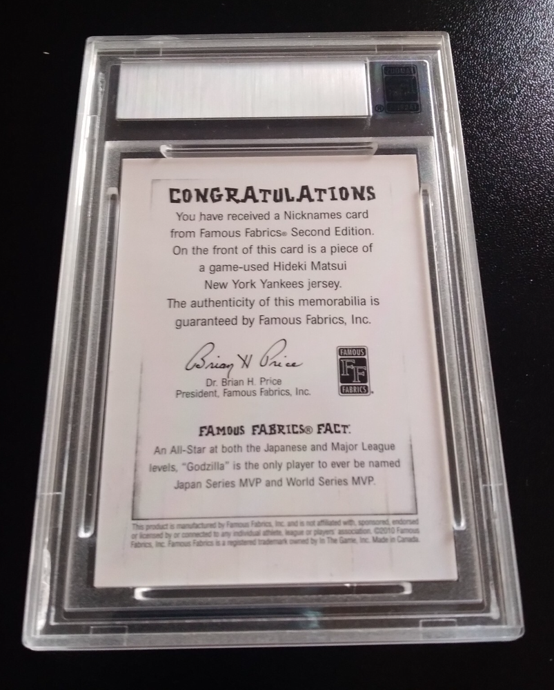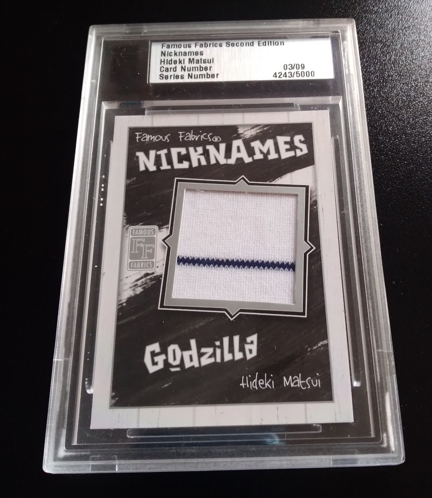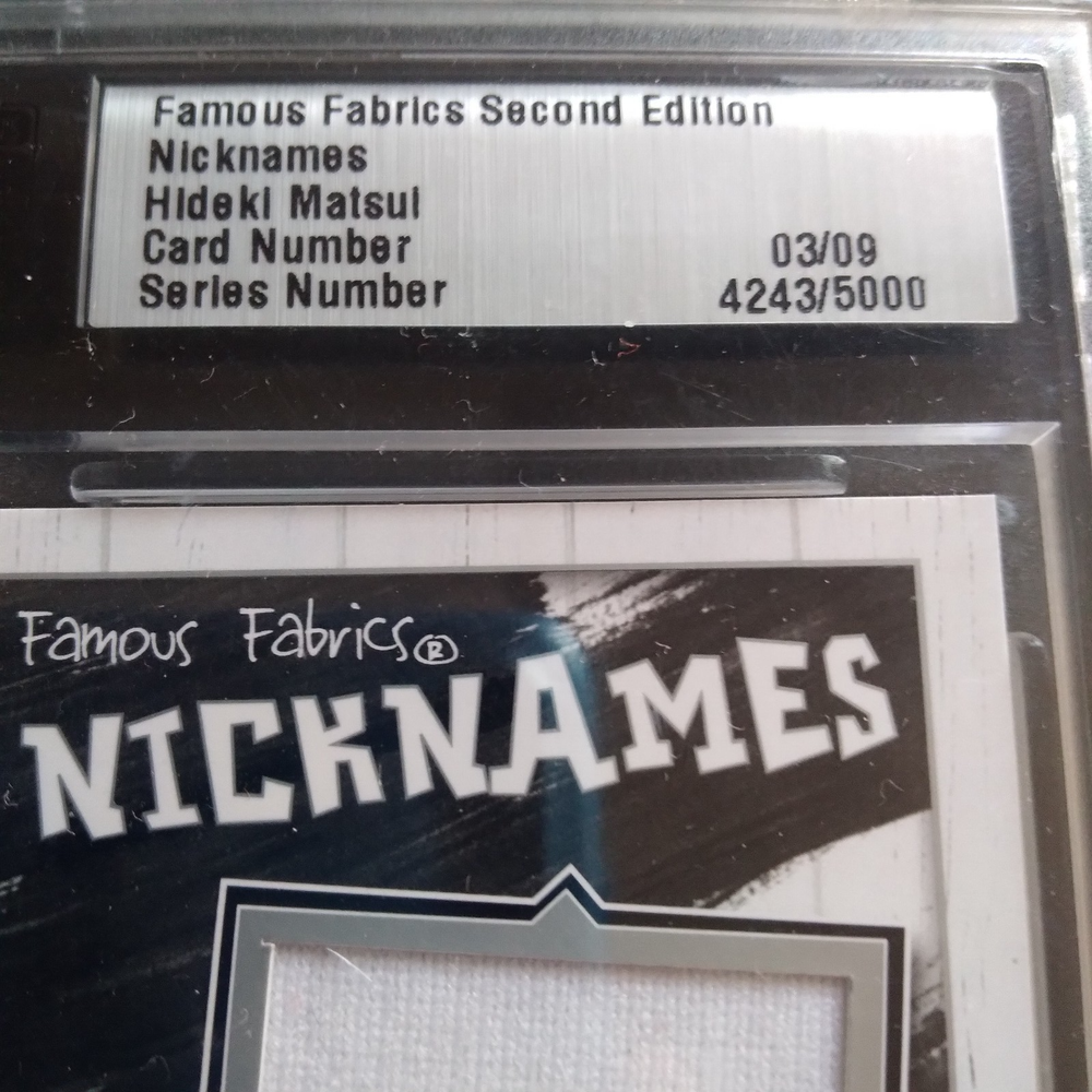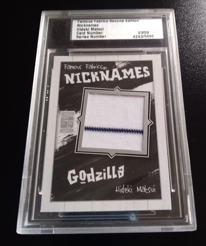 Capture a piece of baseball history with the Hideki Matsui Famous Fabrics Nicknames card, showcasing a game-used jersey piece from the New York Yankees' legendary player. This limited-edition card is serial numbered 3/9, making it a highly sought-after collectible for fans and memorabilia enthusiasts alike. This 2010 Famous Fabrics Second Edition card, featuring the nickname "GODZILLA," is a tribute to Matsui's powerful presence on the field. The card is a must-have for any collection, celebrating the legacy of Major League Baseball and the storied New York Yankees franchise.