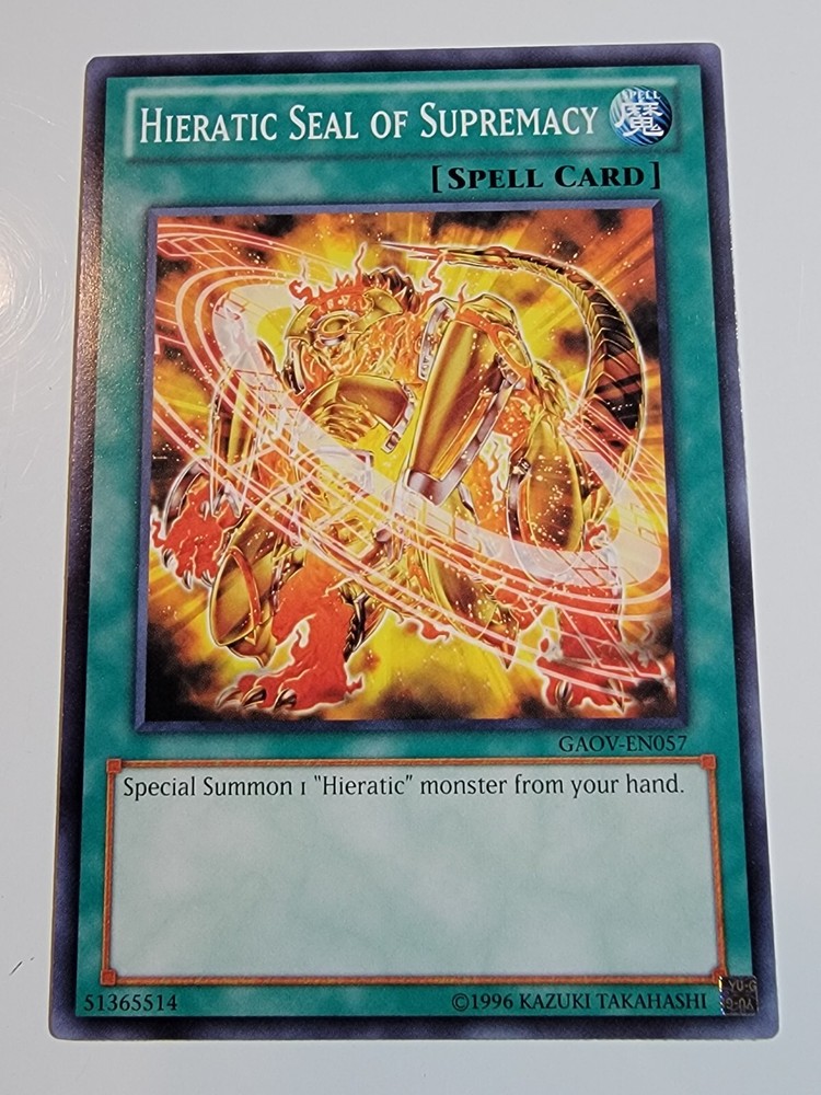 Hieratic Seal Of Supremacy GAOV-EN057 Common Unlimited Yugioh. Overall NM-M condition. (Please reference pictures for c osmetic condition). Take advantage of our multi item discount!!! When you buy 2 items you will have the opportunity to select a 3rd item of equal our lesser value for free from our whole inventory. (Must use Ebay's shopping cart feature in order to take advantage of this discount). If you have any inquiries please feel free to message us and we will respond as soon possible, usually within 24 hours. SHIPPING We almost always use USPS as our primary SHIPPING service. We ship within 24 hours of receipt of payment and will always provide tracking, unless otherwise stated in the listing. (We reserve the right to use a different carrier or service). FEEDBACK Your FEEDBACK is important to us as a growing small business. If for any reason you are unhappy with your transaction, please message us and we will do everything in our power to make it right. Returns Returns are accepted within 30 days of confirmation of delivery. If there is anything you are unhappy about with your purchase please message us and we will respond within 24 hours to your concerns. Thank you for supporting our small business. We appreciate your valued business with us and look forward to serving you in the future. Dan & Tonya Dio's Eclectic Treasures