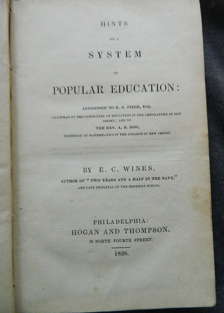 Hints on a System of Popular Education Printed Philadelphia 1838 Scarce Leather I rarely call a book excellent- but the age and condition of this book warrants it...... Perfect - no Solid tight binding - leather is supple and has only minor marks and minor spotting Early ink writing "School Library No 135 District no5 of Naples" on inside front cover MINOR discoloring of endleafs - does have Overall - rare - fantastic condition book PLEASE ask any questions needed - glad to send further photos