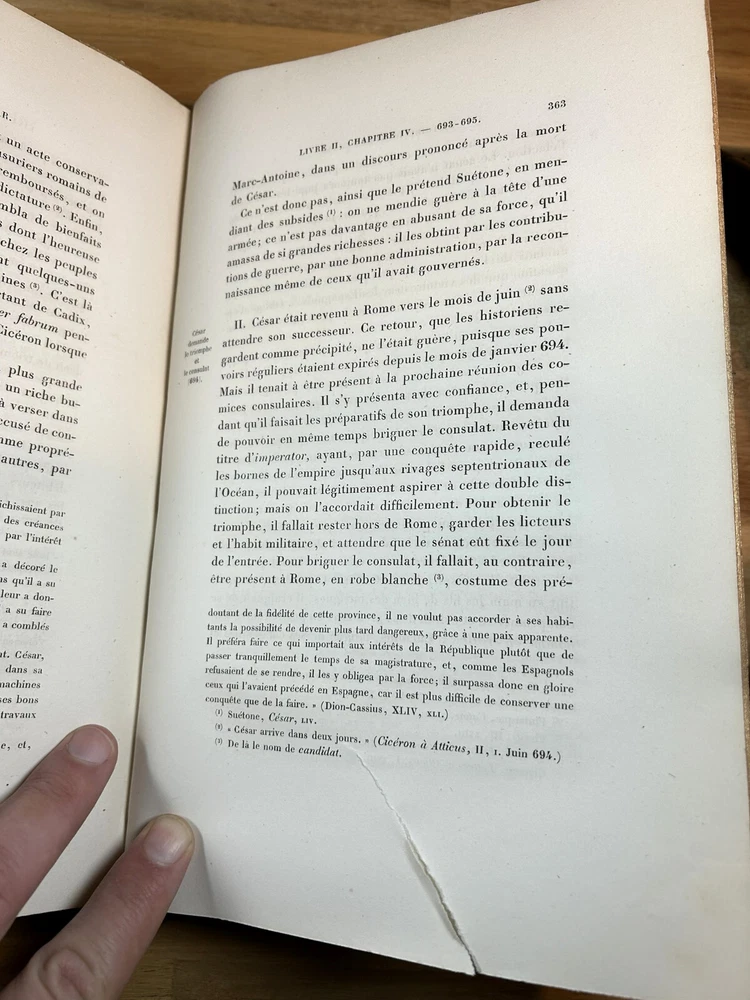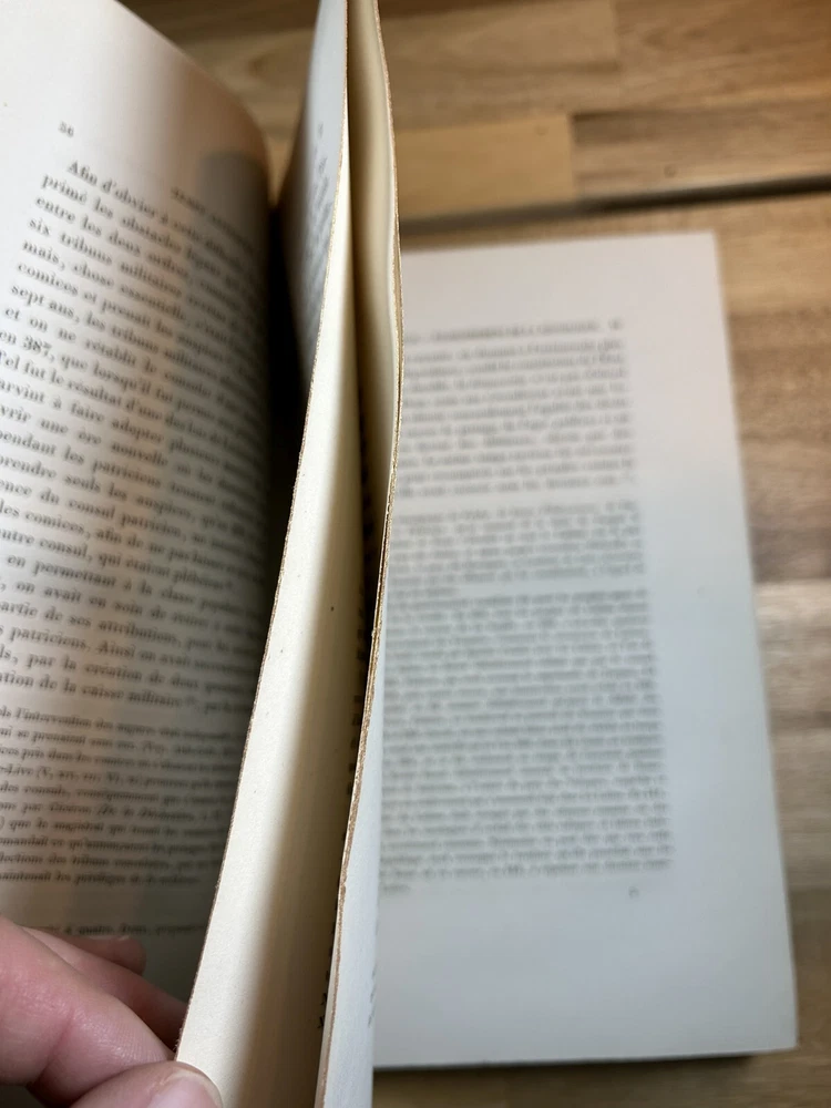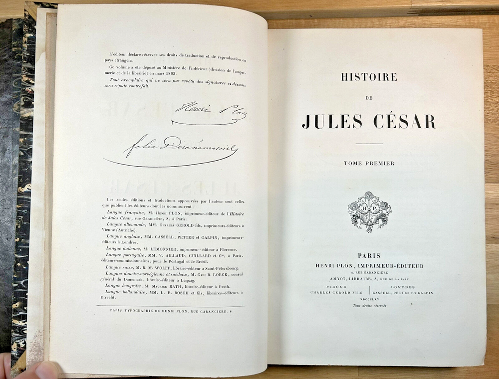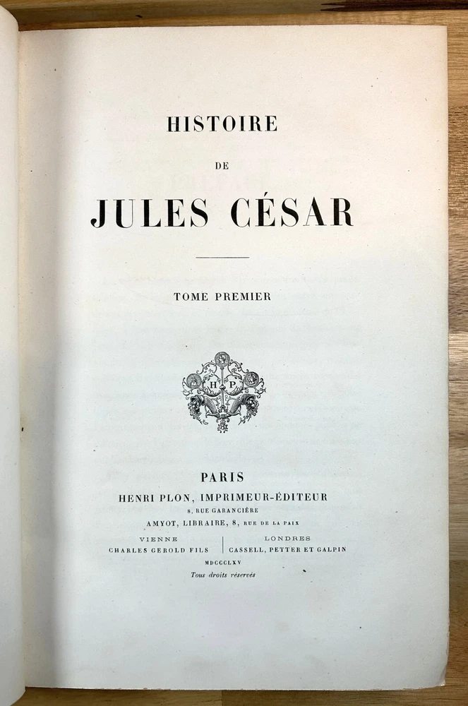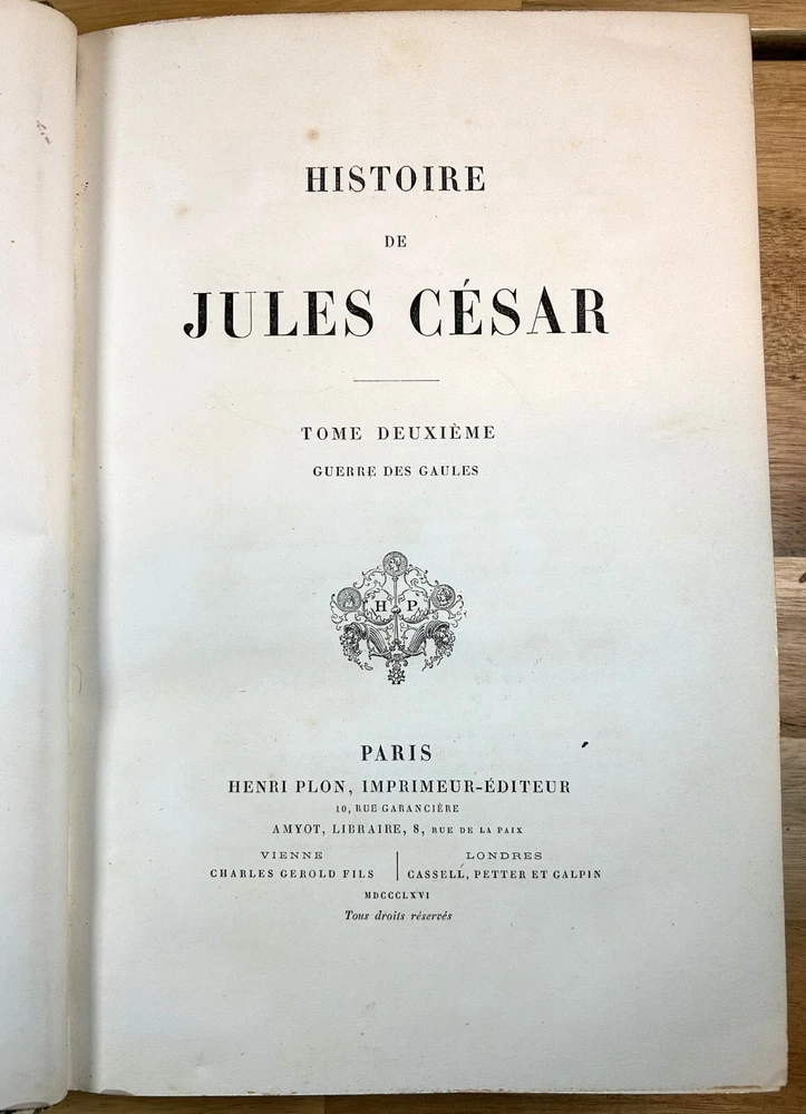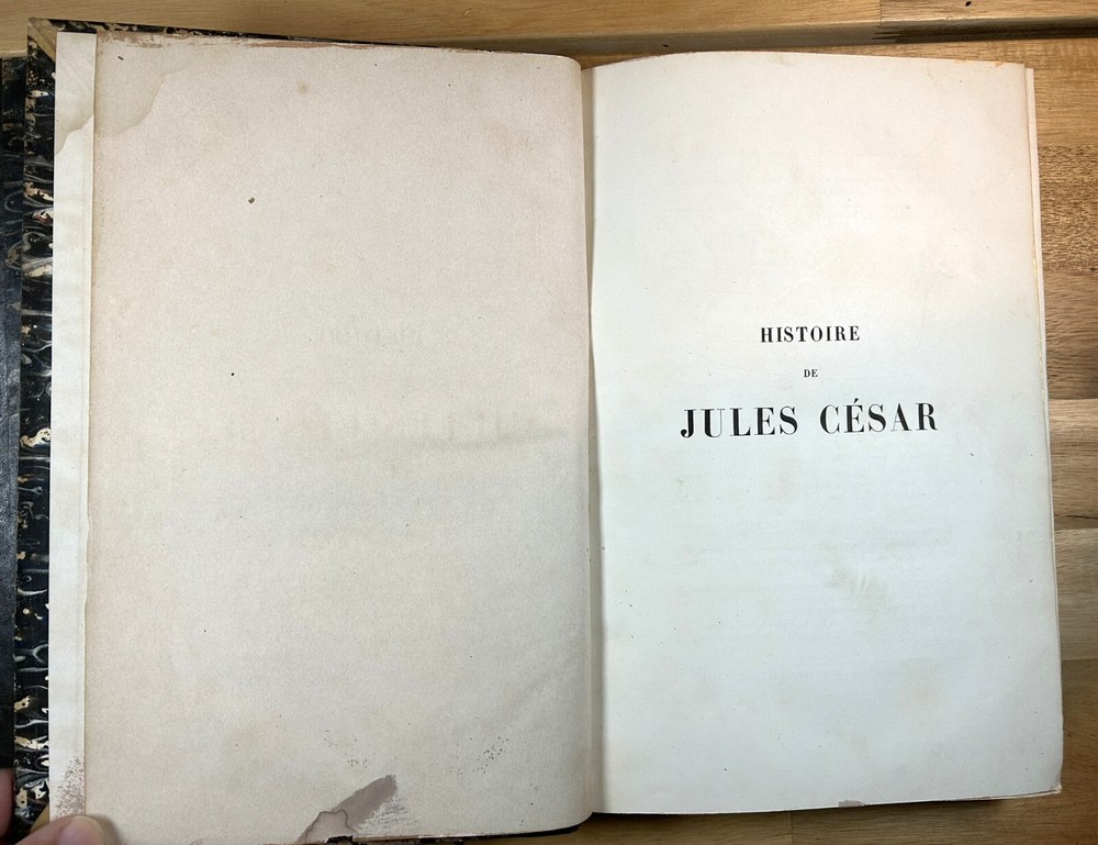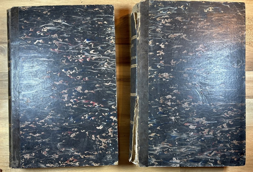 Two volume "Histoire de Jules Cesar," published 1865 and 1866 by Henri Plon. Quarter leather binding with gilt lettering and decoration on spine. This printing appears to lack the maps that some others have. Good. Spine of Vol. 2 is worn with some loss at the top and separation along hinge at bottom front. Gilt on spine bright. Minor scuffing/denting of boards. Some wear along extremities. Binding is tight. Endpapers have dark staining along edges and minor water staining. Interior text appears clean. Important note : the publisher, or more likely a previous owner, somewhat crudely gilded the edges of the textblock. This resulted in (1) a little stray paint on endpapers (but not text pages), and (2) many of the pages sticking together at the edges. The pages do separate relatively easily and without damage, and I separated many of them, but many others are still stuck together. See, for example, photos for Pg. 41 stuck together, then subsequently unstuck to see lack of damage. One page was found to have a tear at the bottom, not affecting text. Text pages appear to be clean. The books also have a bit of an odor. See photos.