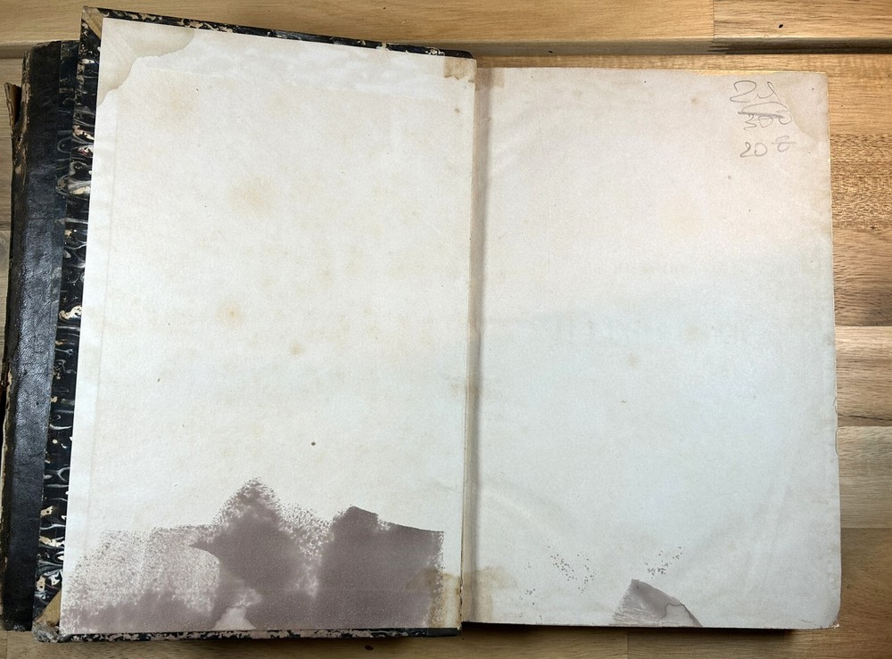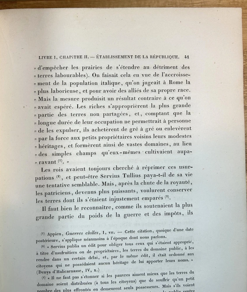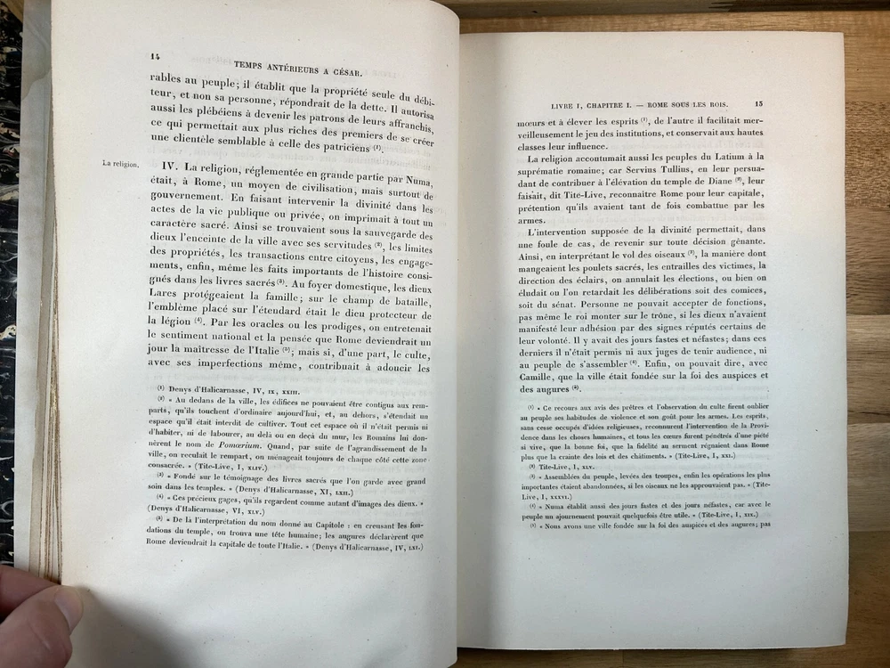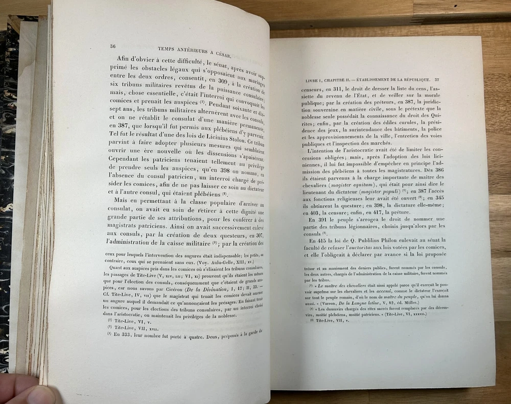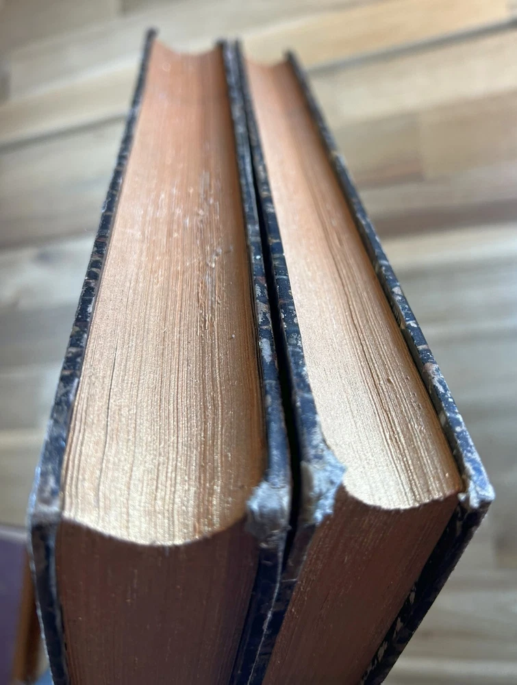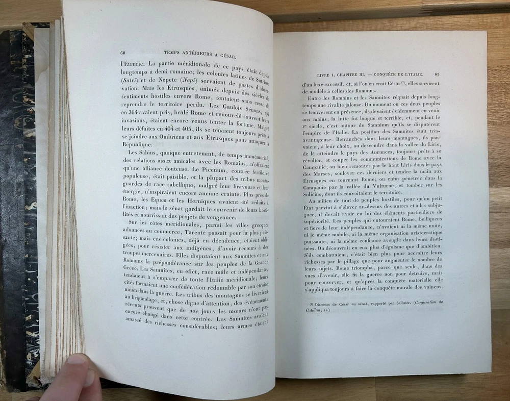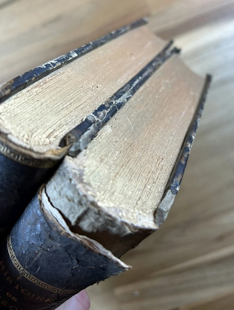 Two volume "Histoire de Jules Cesar," published 1865 and 1866 by Henri Plon. Quarter leather binding with gilt lettering and decoration on spine. This printing appears to lack the maps that some others have. Good. Spine of Vol. 2 is worn with some loss at the top and separation along hinge at bottom front. Gilt on spine bright. Minor scuffing/denting of boards. Some wear along extremities. Binding is tight. Endpapers have dark staining along edges and minor water staining. Interior text appears clean. Important note : the publisher, or more likely a previous owner, somewhat crudely gilded the edges of the textblock. This resulted in (1) a little stray paint on endpapers (but not text pages), and (2) many of the pages sticking together at the edges. The pages do separate relatively easily and without damage, and I separated many of them, but many others are still stuck together. See, for example, photos for Pg. 41 stuck together, then subsequently unstuck to see lack of damage. One page was found to have a tear at the bottom, not affecting text. Text pages appear to be clean. The books also have a bit of an odor. See photos.