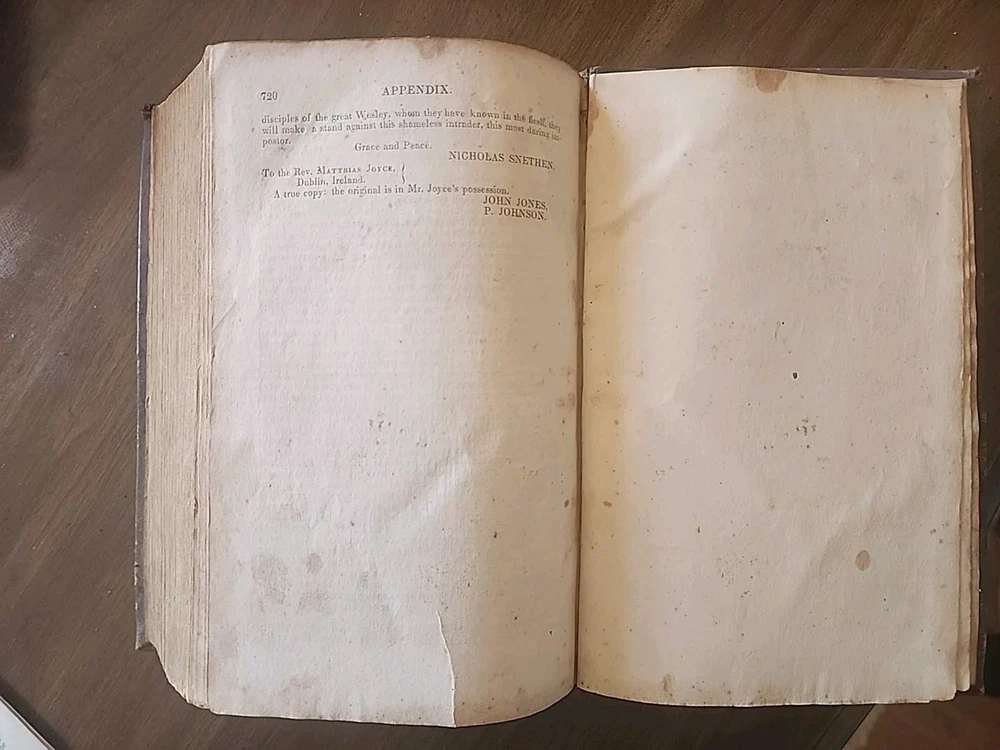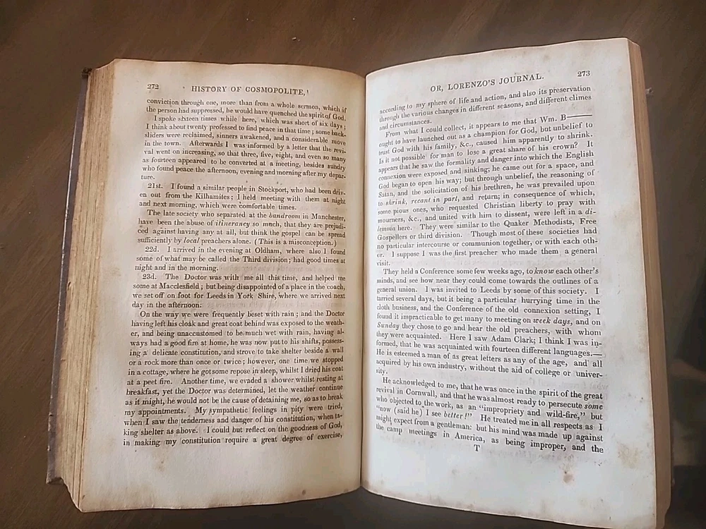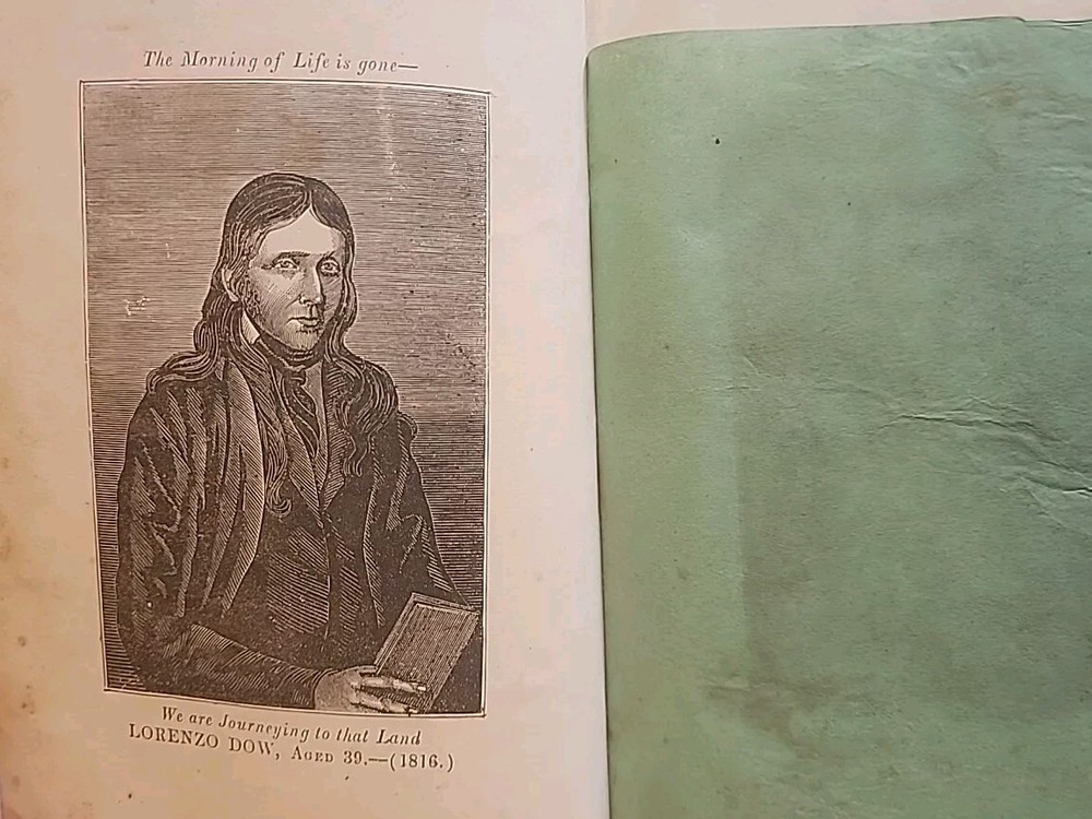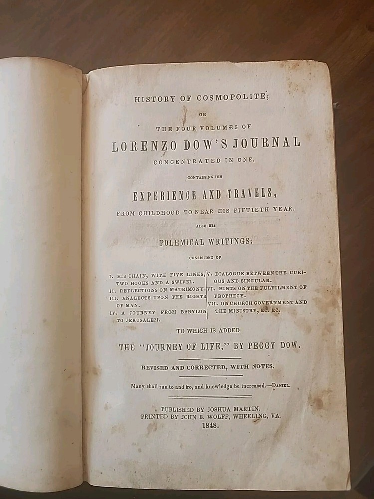 This rare and collectible book, titled "History of Cosmopolite; or, Lorenzo Dow's Journal," offers a glimpse into the past of North America. Written by Lorenzo Dow and published in 1848 by Joshua Martin, this 1st edition book is a must-have for historical enthusiasts. The striking portrait illustrations along with original tissue paper are unique and highly sought after by collectors of early Americana. The leather binding adds to its antique charm, while the English language and original print make it a valuable addition to any collection. The book covers various topics related to history, biography, and autobiography. It was printed in Wheeling, Virginia, and is an original copy. Perfect for collectors and history buffs, this antique book is a treasure trove of information on the past of North America. Condition is very good for its age. Fixing on pages, worn and scuffed boards. Hinges intact. Complete.