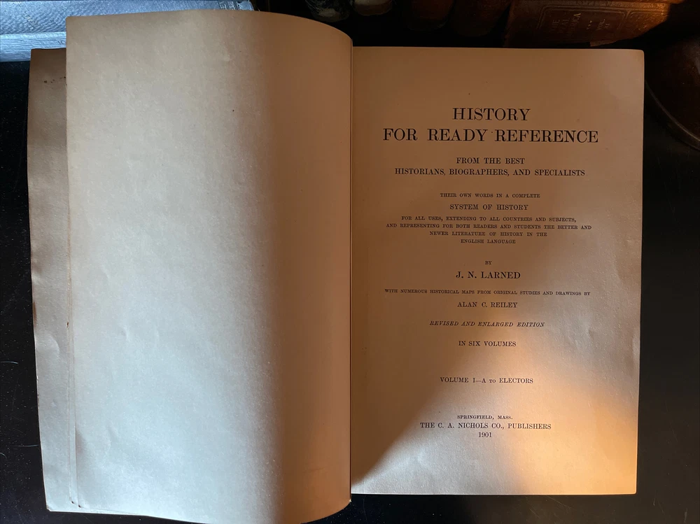 History for Ready Reference by J.N. Larned, 1901 *COMPLETE 6 Vol. Set*. From the Best Historians, Biographers, and Specialists. With Numerous Historical Maps from Original Studies and Drawings by Alan C. Reiley. Revised and Enlarged Edition. Marbled pages. Shipped with USPS Media Mail.