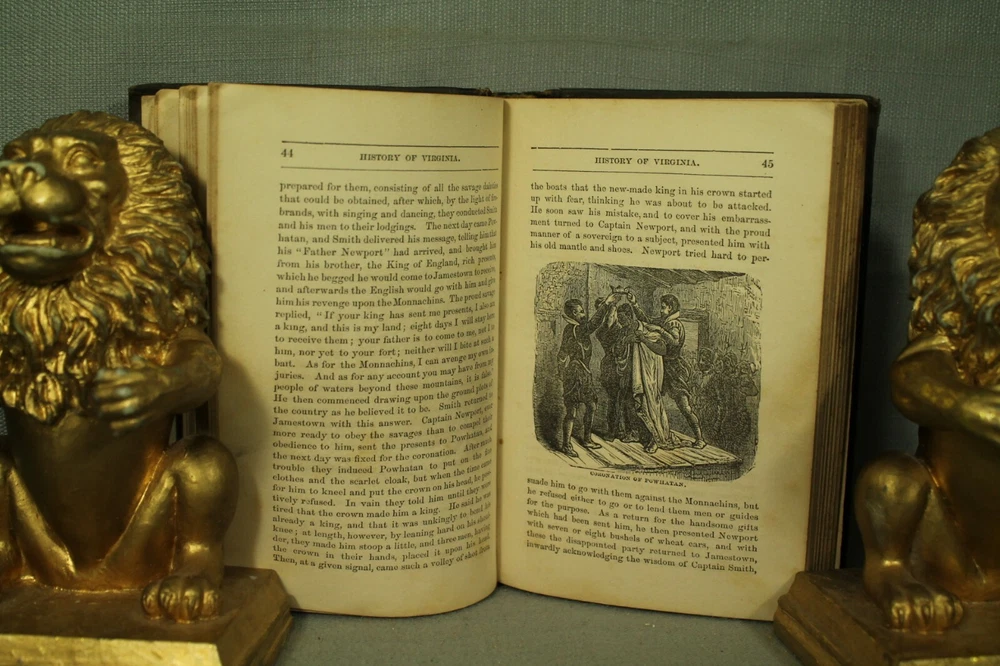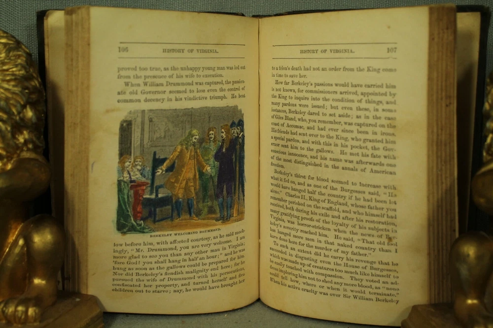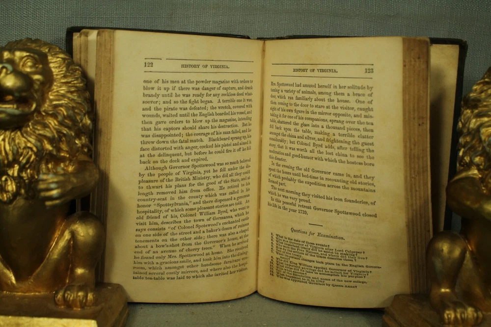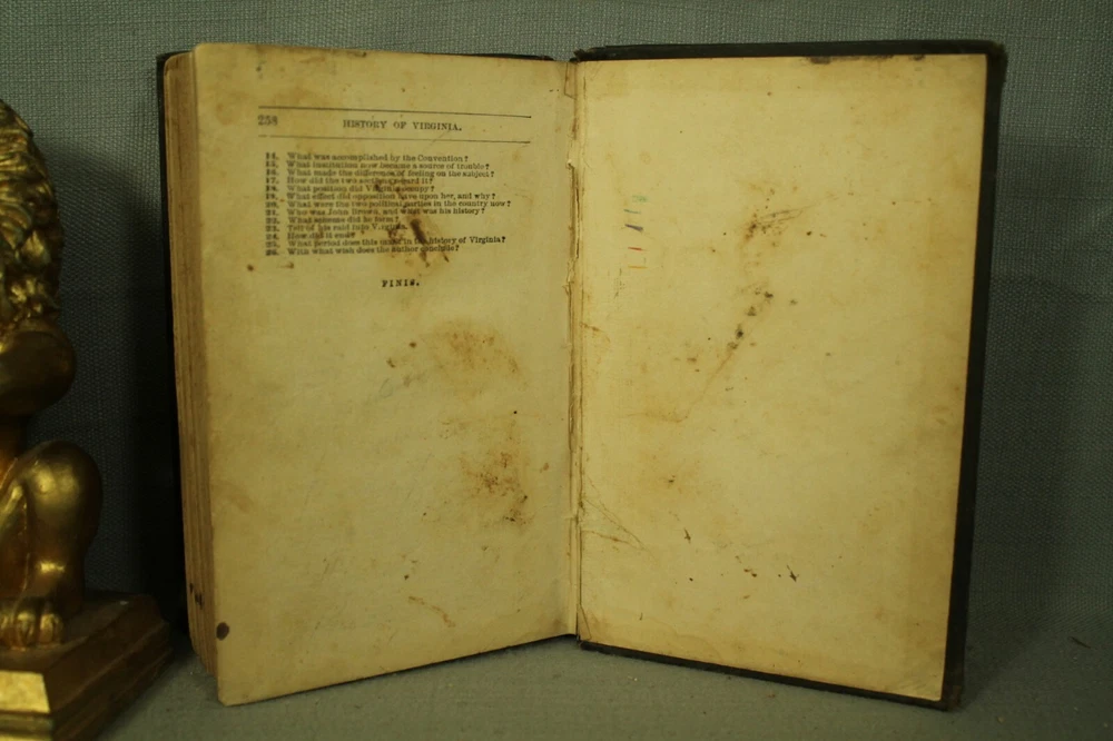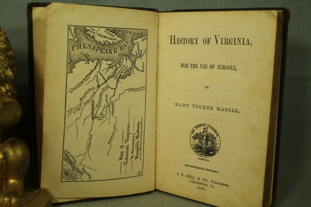 History of Virginia by Mary Tucker Magill seventeenth edition published by J P Bell & company. Lynchburg, Va. 1888 book measures 7 3/8" by 5" embossed cloth hardcover with leather spine. cover has wear, edge wear, bumped /worn corners. spots. leather has wear, rubbing, scuffing . names on front endpapers. 258 pages with yellowing./age toning. various amounts of light spotting scattered throughout. pencil writing on two pages in back. back endpapers have more spotting. a few illustrations are colored in. . great reading, reference, gift, share with a friend or colleague decorating. book would look great on your bookshelf, home/office/library shelf. No International returns for any reason visit my Ebay store bunch of old Stuff for lots of great books and Check out my other items ! location. wood shelf steps