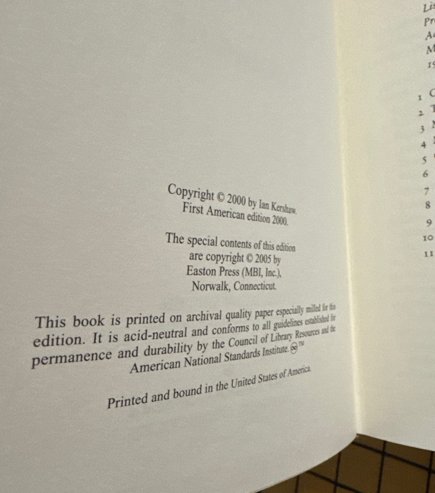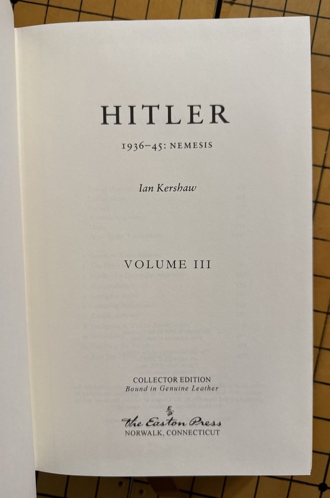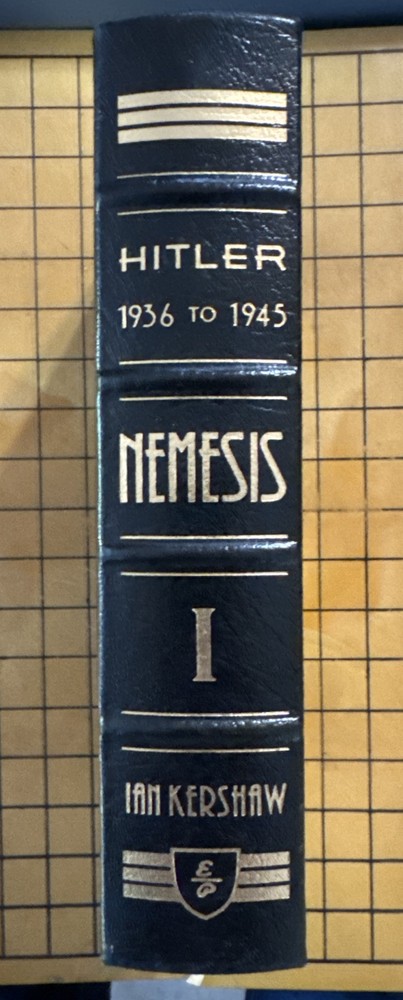 Hitler 1936-1945 Nemesis I by Ian Kershaw (Easton Press, Leather, First Edition, 2000). 557 pages. Condition is Very Good; firm binding, no writing, no folded or torn pages. Hitler 1936-1945: Nemesis Volume I by Ian Kershaw, published by Easton Press, is the first part of a monumental two-volume biography that delves into the final years of Adolf Hitler's life and the collapse of the Third Reich. This meticulously researched work provides a detailed examination of Hitler's rise to absolute power, his military campaigns, and the internal dynamics of the Nazi regime. Kershaw explores the pivotal events from 1936 to 1945, including the annexation of Austria, the invasion of Czechoslovakia, and the outbreak of World War II. The book also delves into the horrors of the Holocaust, the brutal occupation of Europe, and the eventual downfall of Hitler's war machine. With its rich detail the title offers readers a comprehensive understanding of one of history's most infamous figures and the catastrophic impact of his actions. This edition by Easton Press is a beautifully bound and collectible version, perfect for history enthusiasts and scholars alike. We welcome all offers and inquiries, more photos and information available upon request. Shipped securely and promptly with USPS mail.