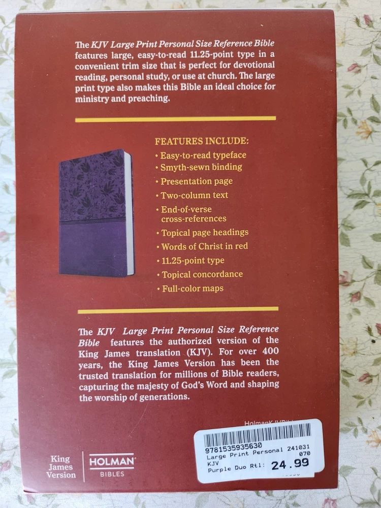 Largest type available in a compact 4" x 6" trim size! The KJV Large Print Compact Reference Bible features a large, easy-to-read 8-point type in a convenient, easy-to-carry compact size that slips nicely into a pocket, backpack, or purse. This Bible makes the perfect gift for a person "on the go" who wants to keep the Word of God close, accessible, and convenient to read at all times. FEATURES Pure Cambridge Edition of the KJV text Compact portable trim size that is easy-to-carry Durable Smyth-sewn lay-flat binding Two-column verse-by-verse text format Topical page headings 8-point type size Words of Christ in red Gilded page edges Ribbon marker for easy referencing between pages Topical Concordance Presentation page for gift-giving Full-color maps 4" x 6" page size The KJV Large Print Compact Reference Bible features the authorized Pure Cambridge Edition text of the King James Version (KJV) translation. The KJV is one of the best-selling translations of all time and captures the beauty and majesty of God's Word for those who love the rich heritage and reverent language of this rendering of the Holy Bible., The KJV Large Print Compact Reference Bible features large, easy-to-read 8-point type in a convenient, easy-to-carry compact trim size. This Bible makes the perfect gift for a person "on the go" who wants to keep the Word of God close, accessible, and convenient to read at all times. Features include: Easy-to-read typeface, smyth-sewn binding, presentation page, two-column text, end-of-verse cross-references, topical page headings, words of Christ in red, 8-point type, topical concordance, full-color maps, and more. The KJV Large Print Compact Reference Bible features the authorized version of the King James translation (KJV). The KJV is one of the best-selling translations of all time and captures the beauty and majesty of God's Word for those who love the rich heritage and reverent language of this rendering of the Holy Bible., The KJV Large Print Compact Reference Bible features a large, easy-to-read 8-point type in a convenient, easy-to-carry compact size that slips nicely into a pocket, backpack, or purse. This Bible makes the perfect gift for a person "on the go" who wants to keep the Word of God close, accessible, and convenient to read at all times. |