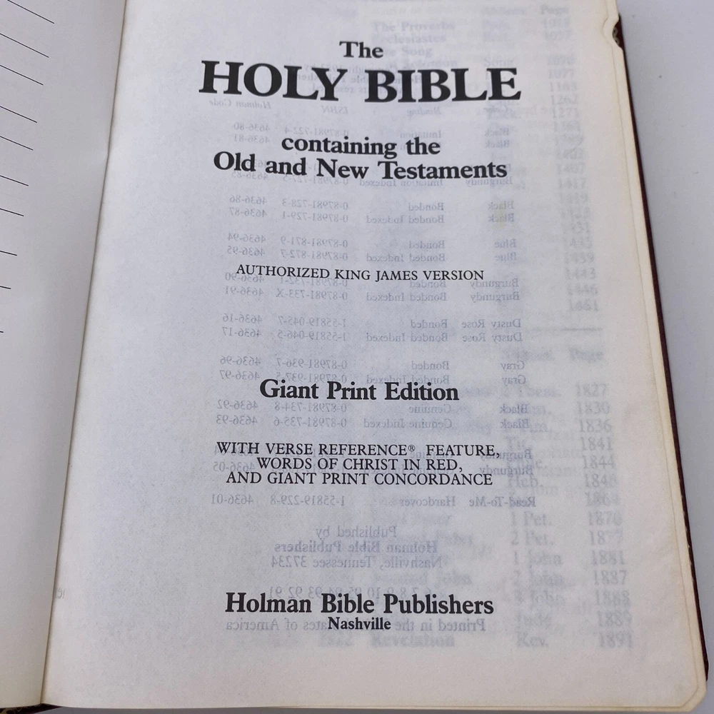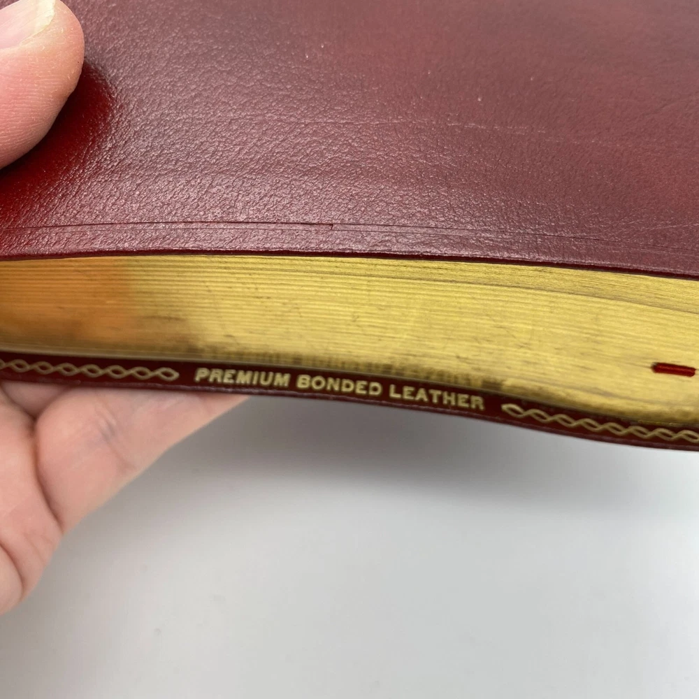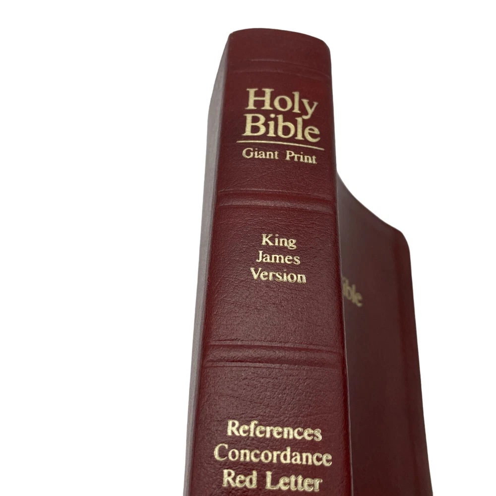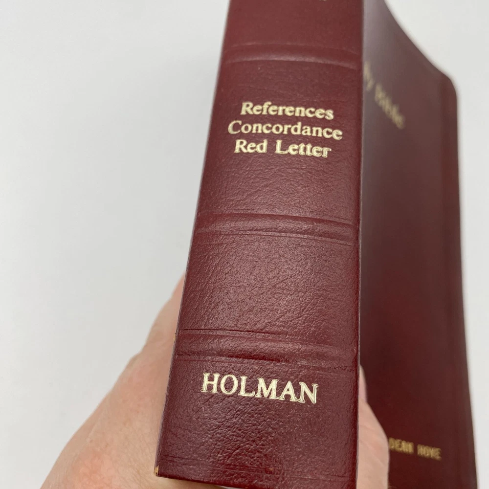 Features: • Holman Holy Bible • KJV • Giant print • Burgundy bonded leather soft cover • References • Concordance • Red letter • Color maps at the back Size: OS Condition: Pre-Owned Good Name in gold foil on the front cover. First page is inscribed. I do not see any further writing upon flipping though.