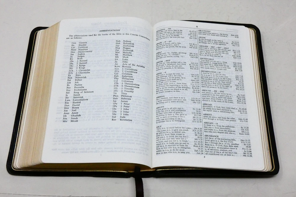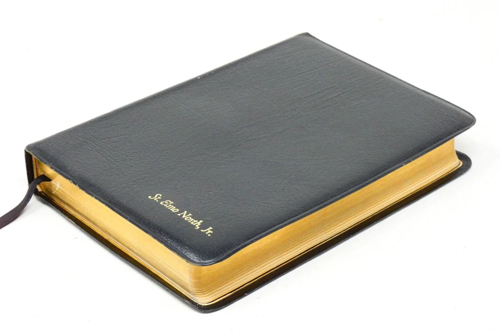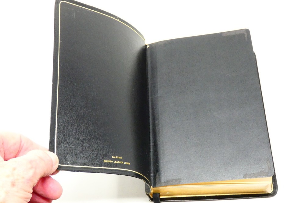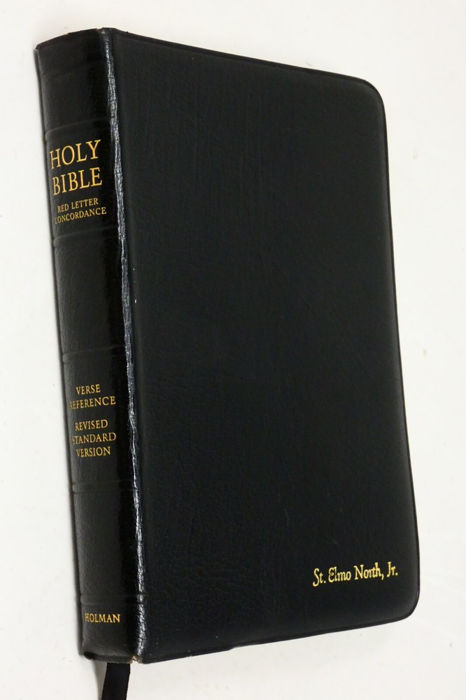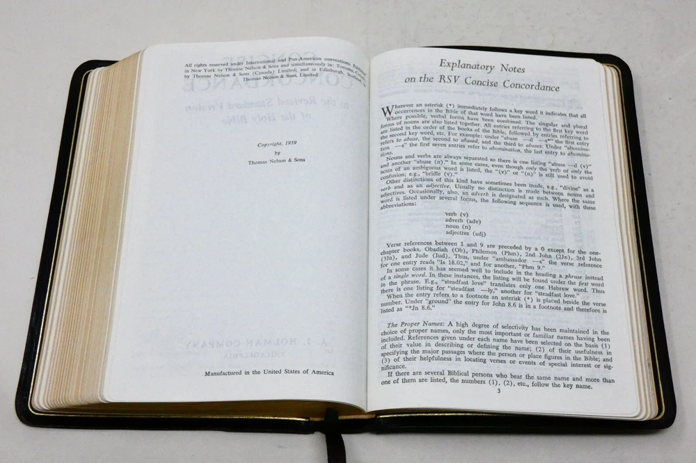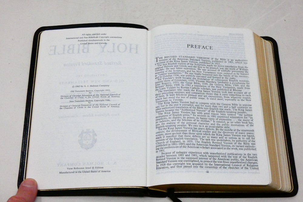 Holman Holy Bible Revised Standard Version Verse Reference Jewel Edition Bible (1962) Red Letter ~ Concordance Black Calfskin Cover, Bonded Leather Lined Good preowned condition: NOTE, a name is imprinted in gold on the front cover. Otherwise, the Bible is free of writing. The binding is solid, and the leather cover is in good condition.