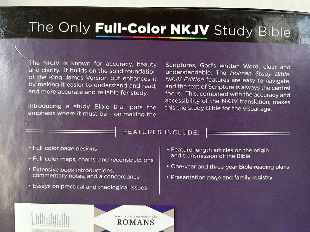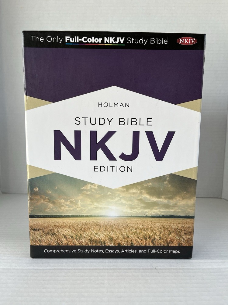 Holman Study Bible NKJV Edition Mahogany LeatherTouch Full Color. Great used condition has some writing on two pages (see photos for reference) other than that it is in like new condition.